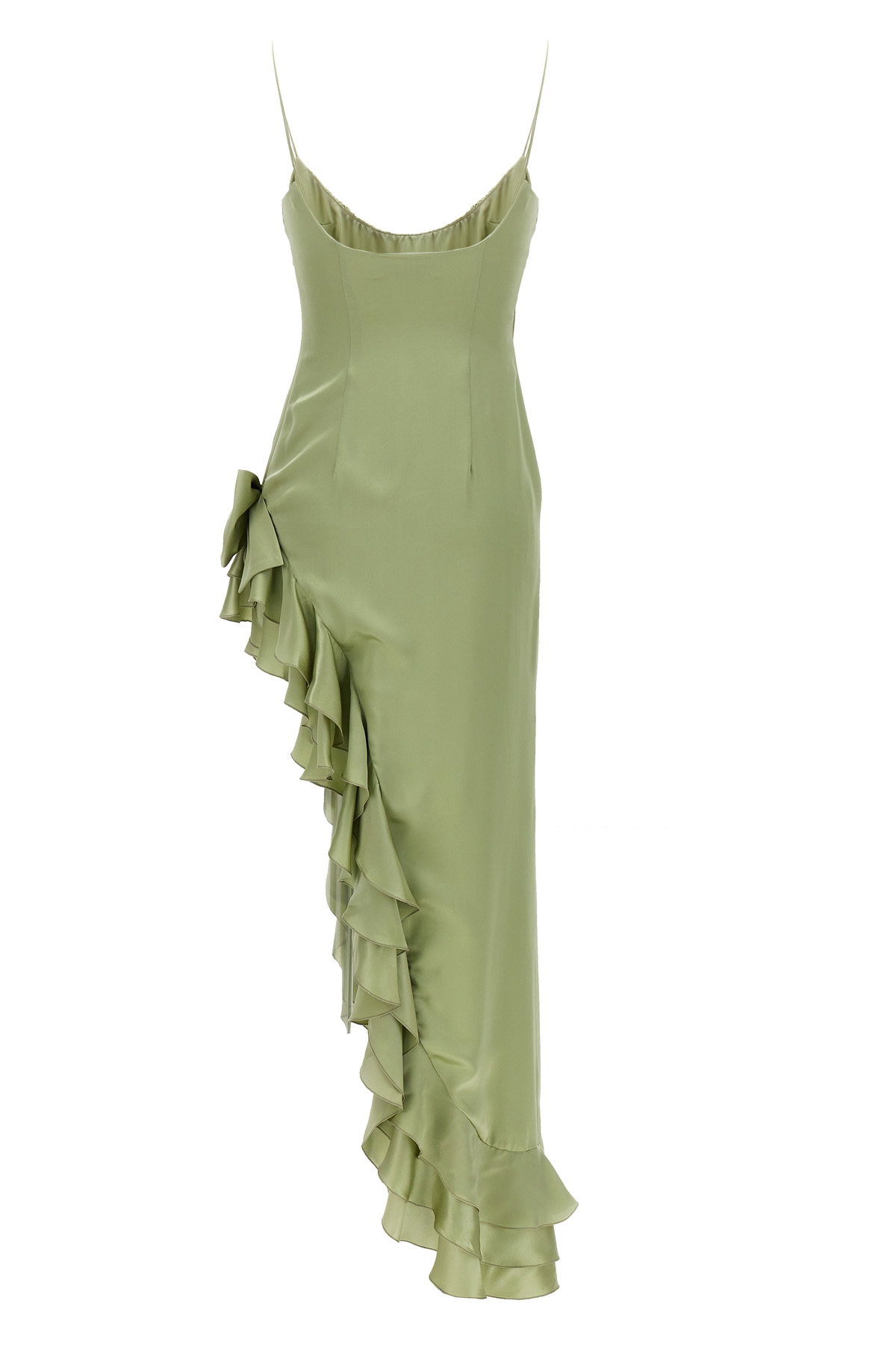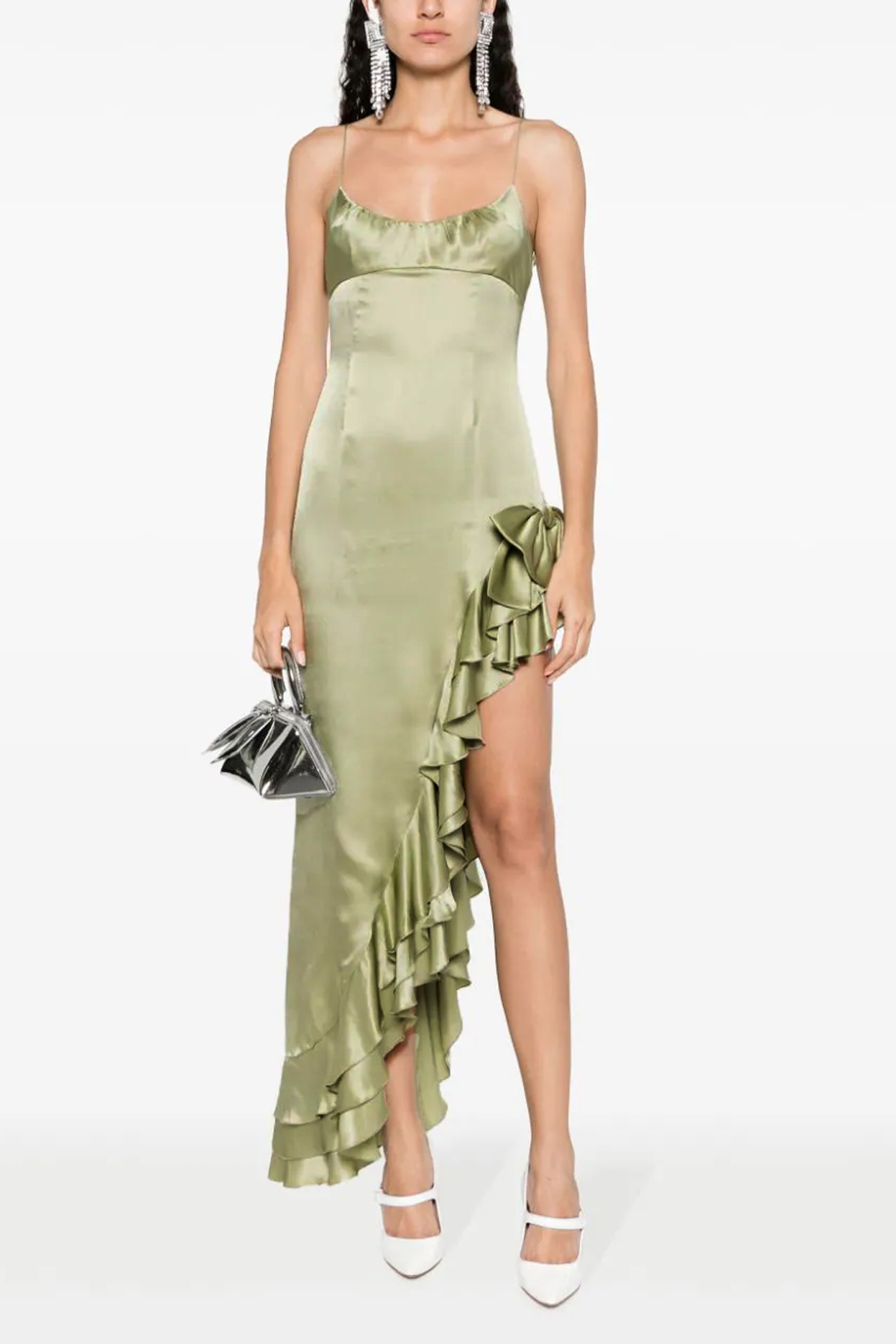 Long silk dress with maxi side split and ruffles, bow applique, thin straps and a side zip closure.