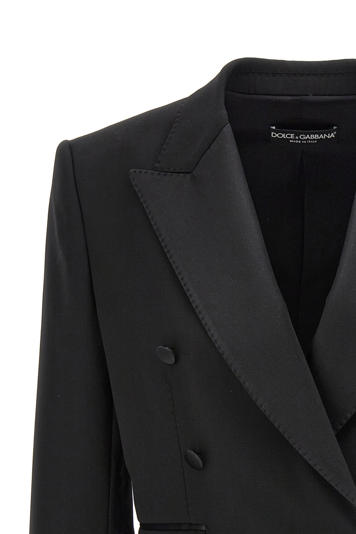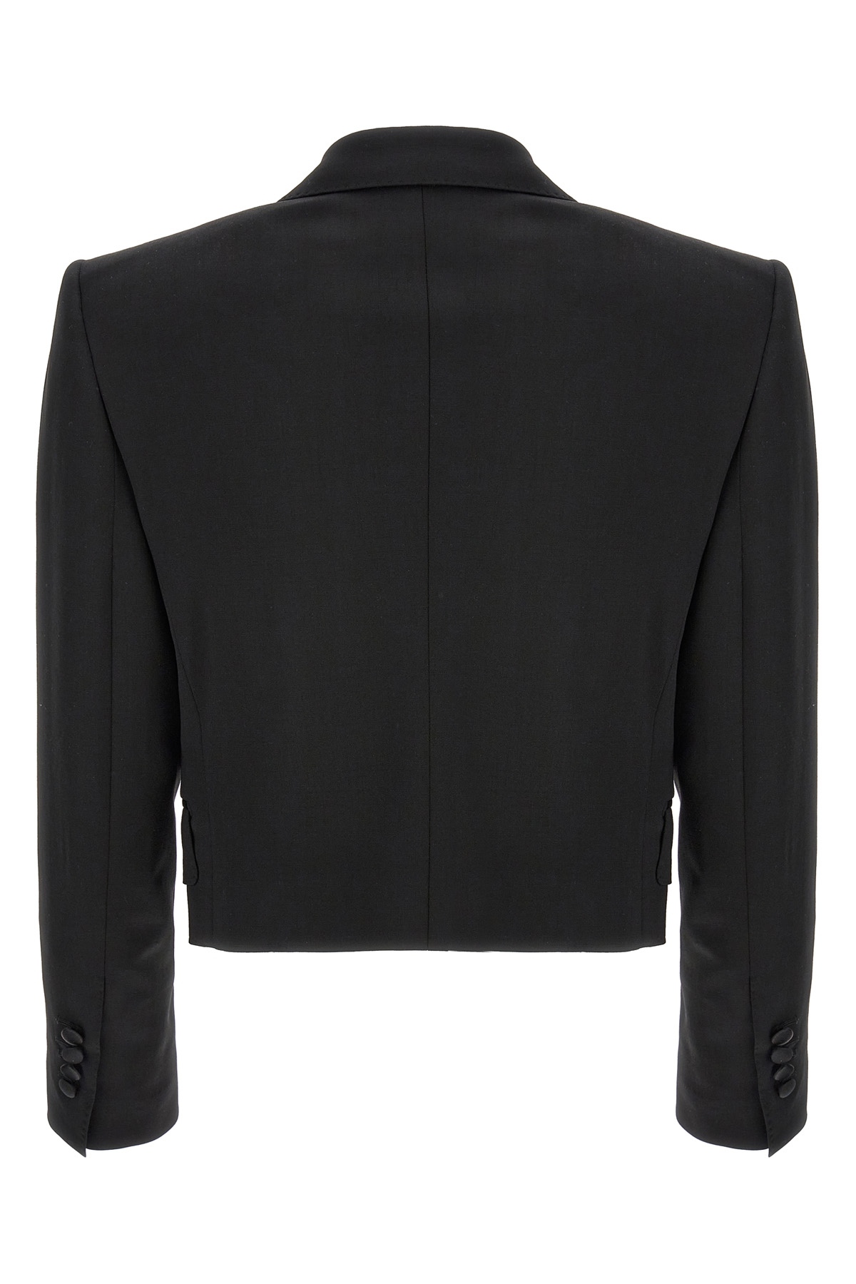 'Tuxedo' double-breasted short wool twill blazer with lapels and satin buttons, padded shoulders, long cuffed sleeves.