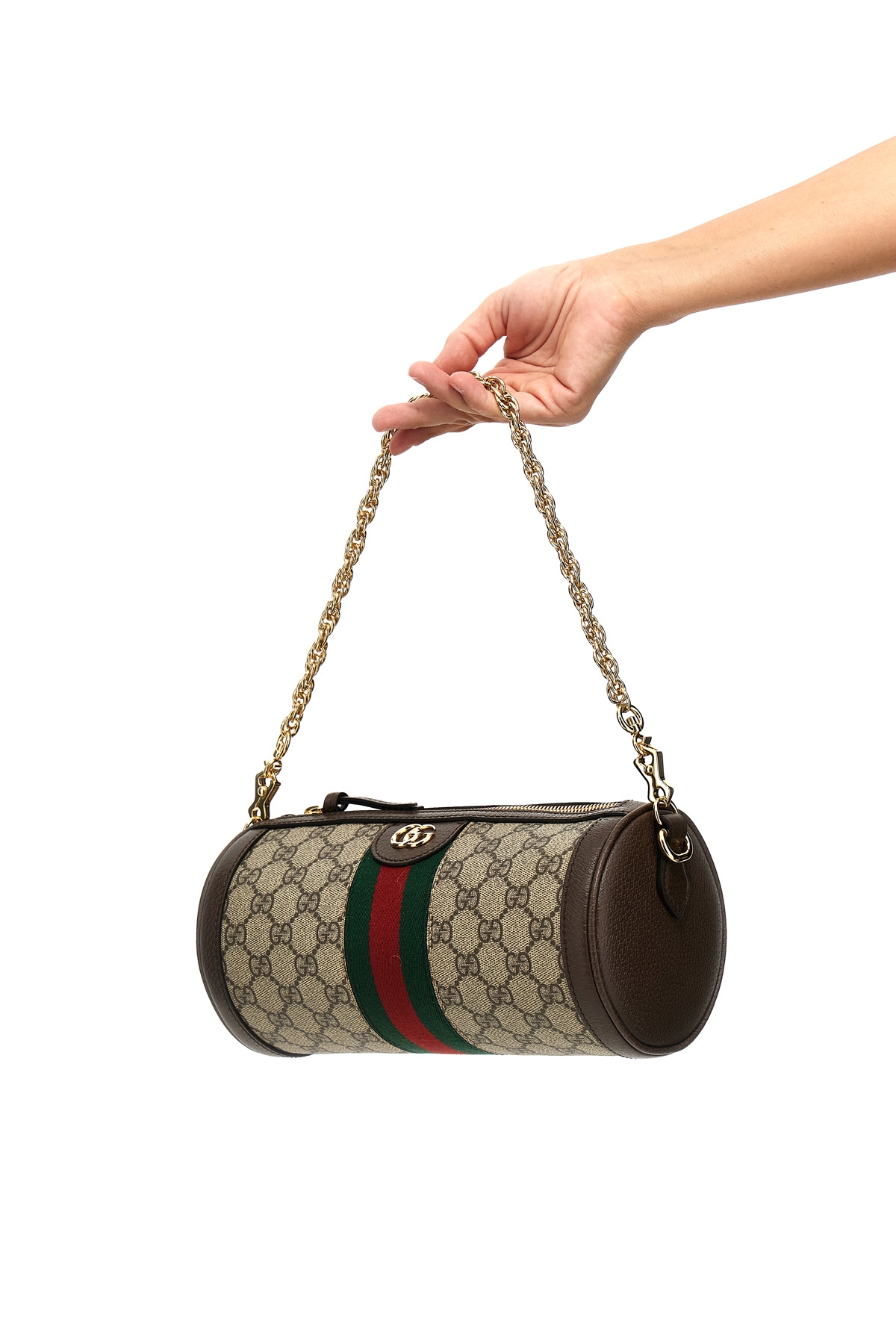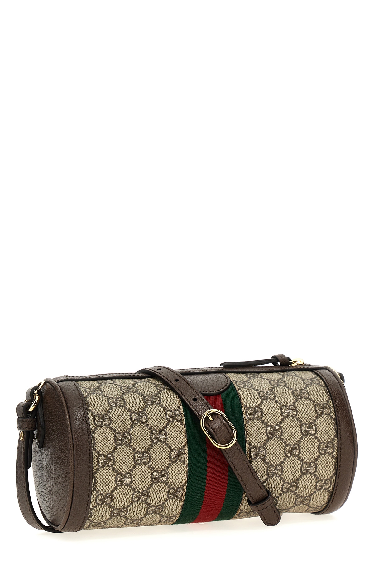 'Ophidia' handbag in GG Supreme fabric and leather, metal logo and web ribbon, zip closure, removable short handle, removable chain shoulder strap.