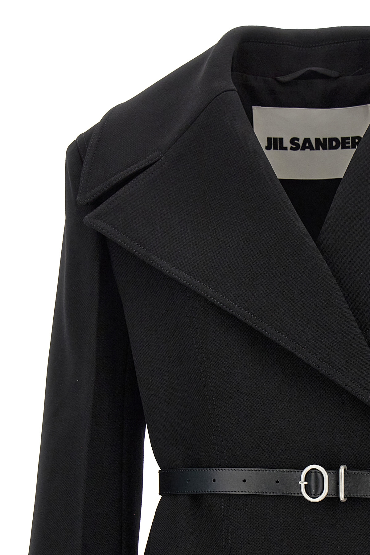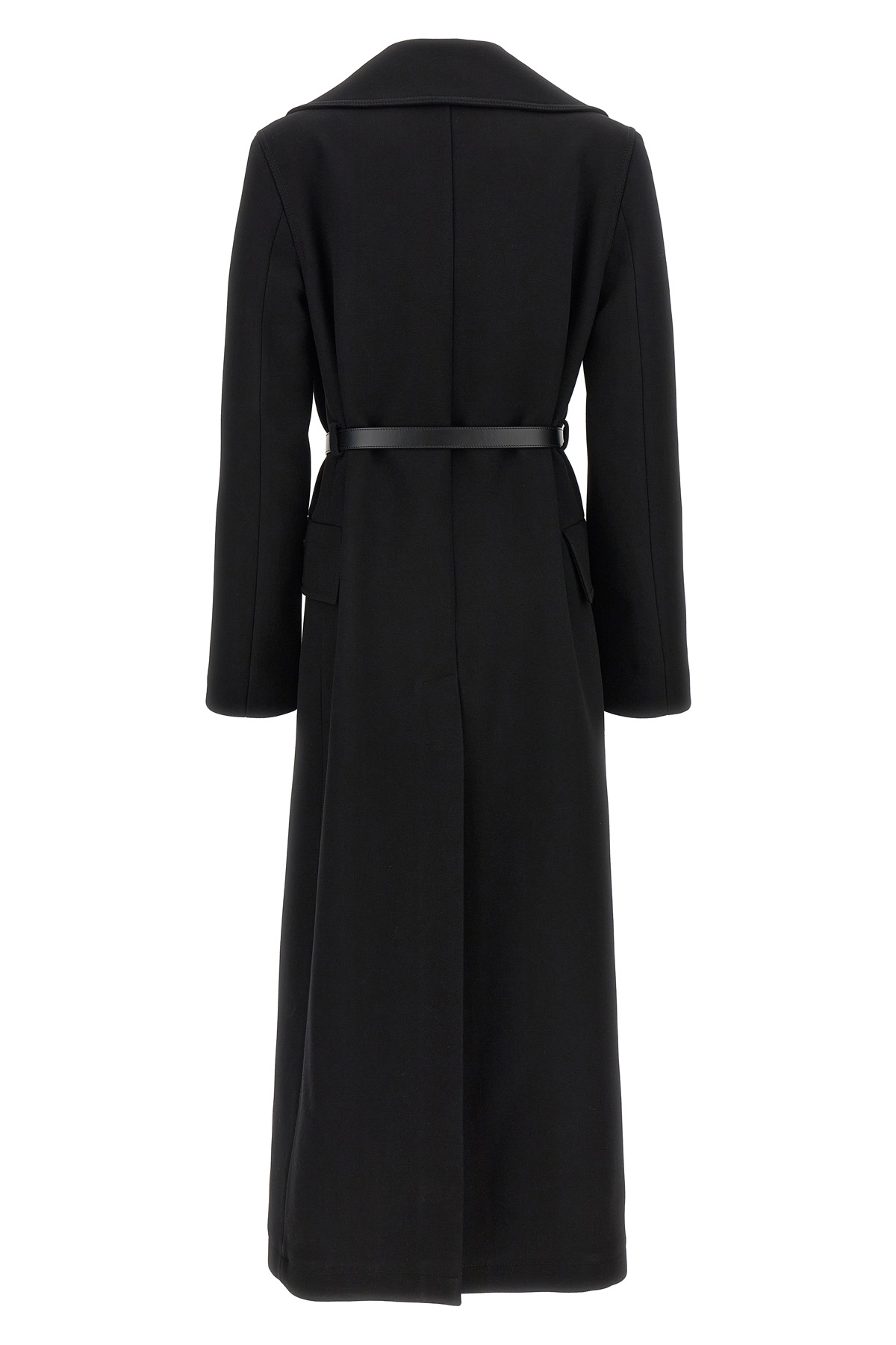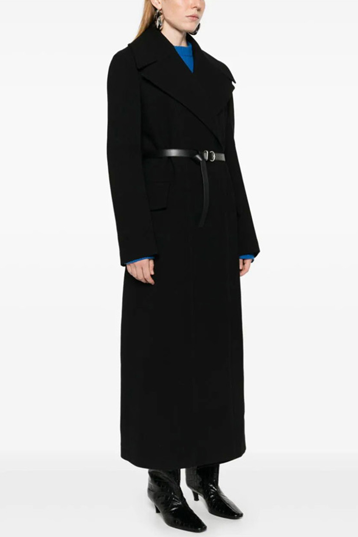 Compact wool double-breasted coat with button closure, pockets, padded shoulders, long sleeves, back split, leather belt to tie at the waist.
