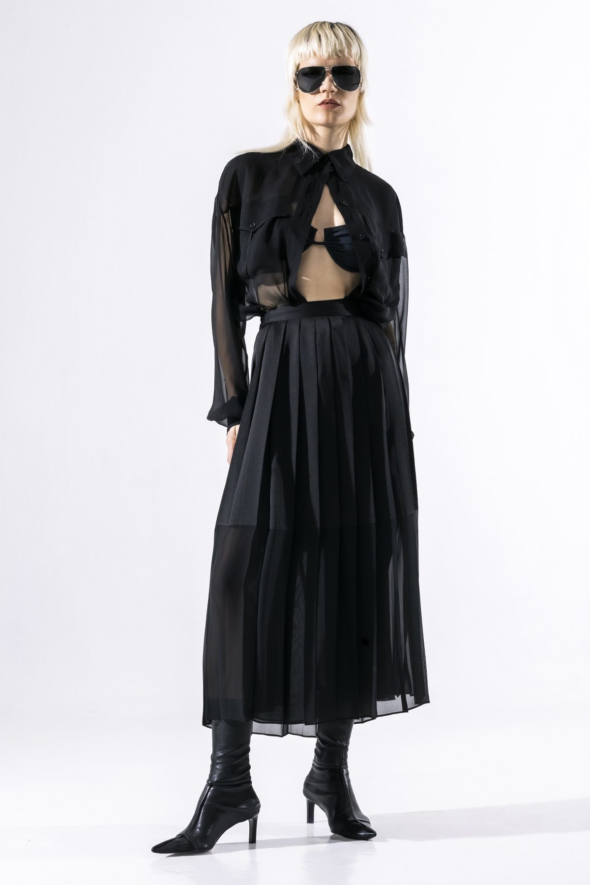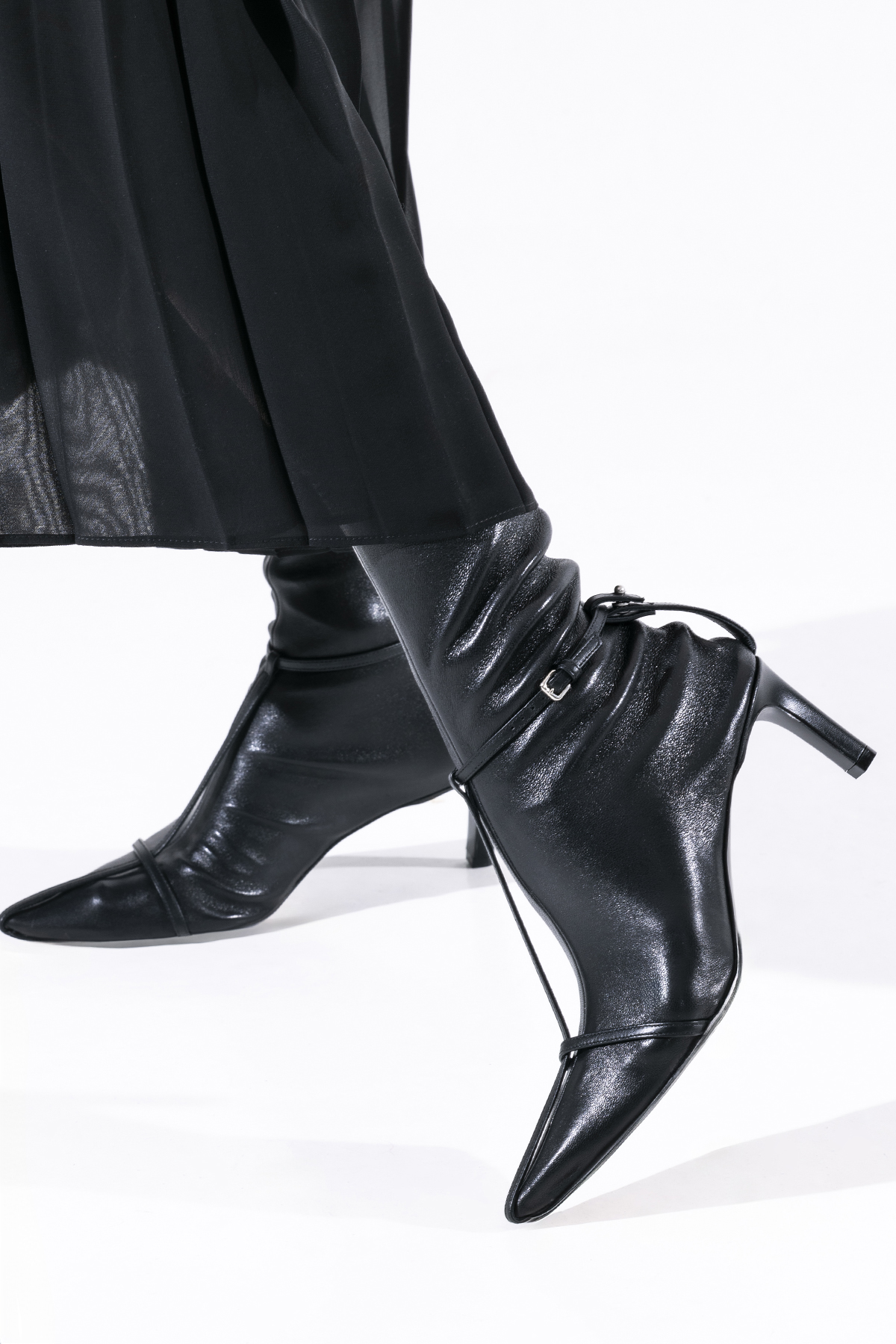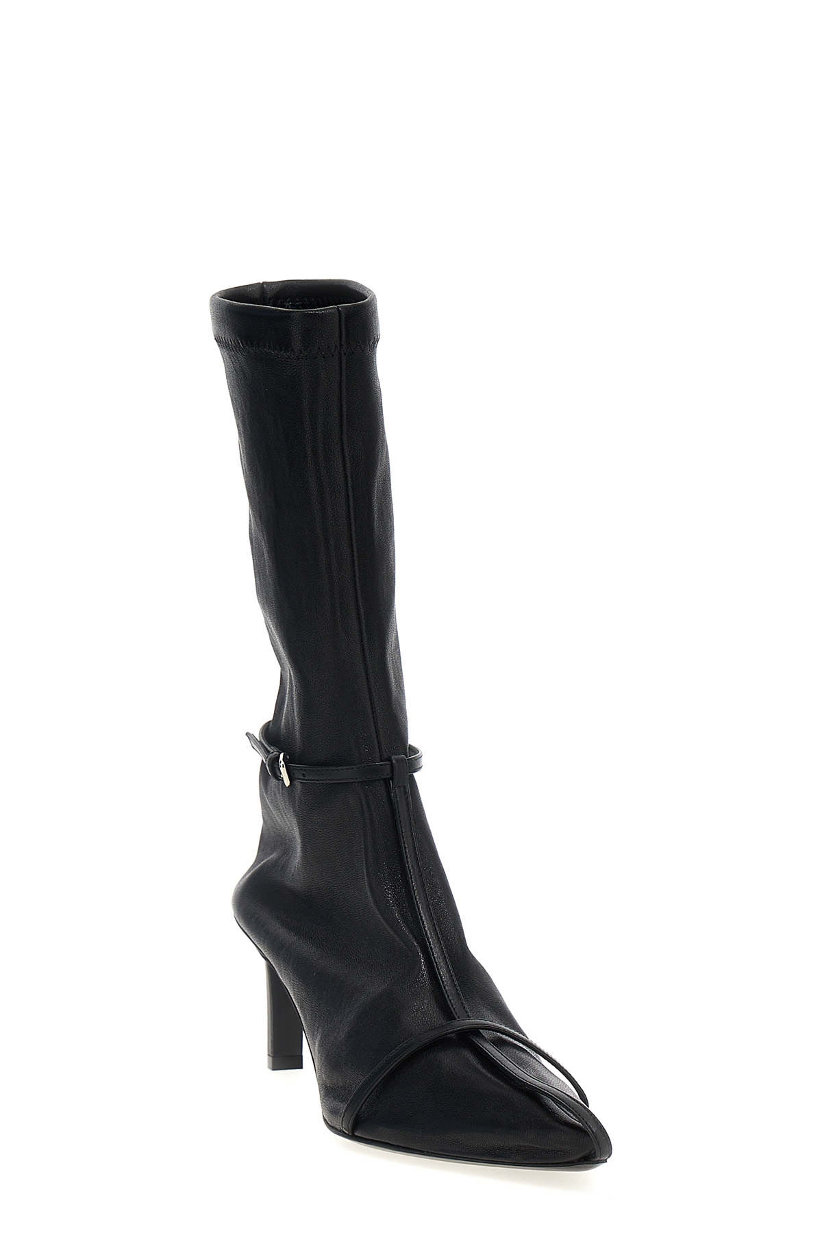 Stretch nappa leather ankle boots with strap detail, sock model with heel.
