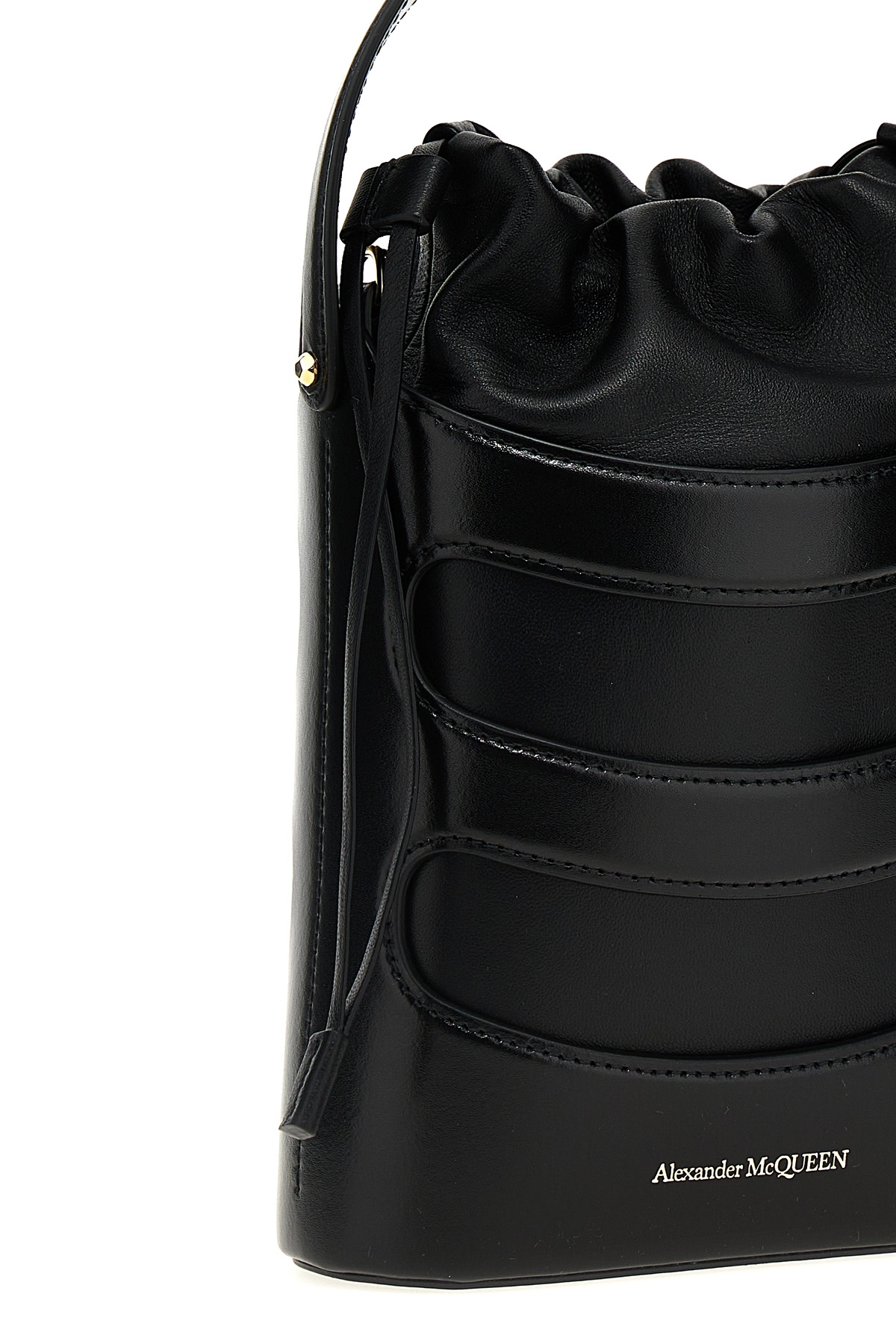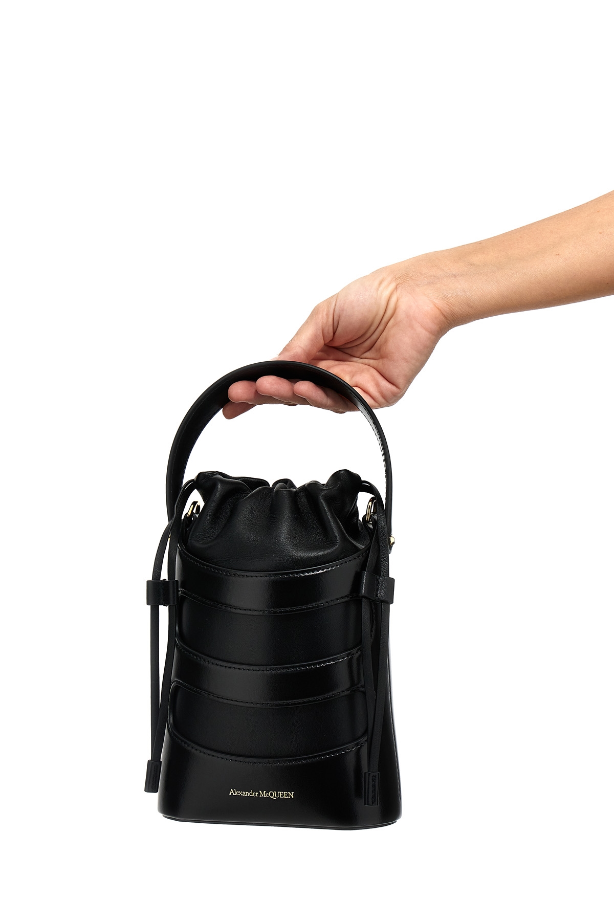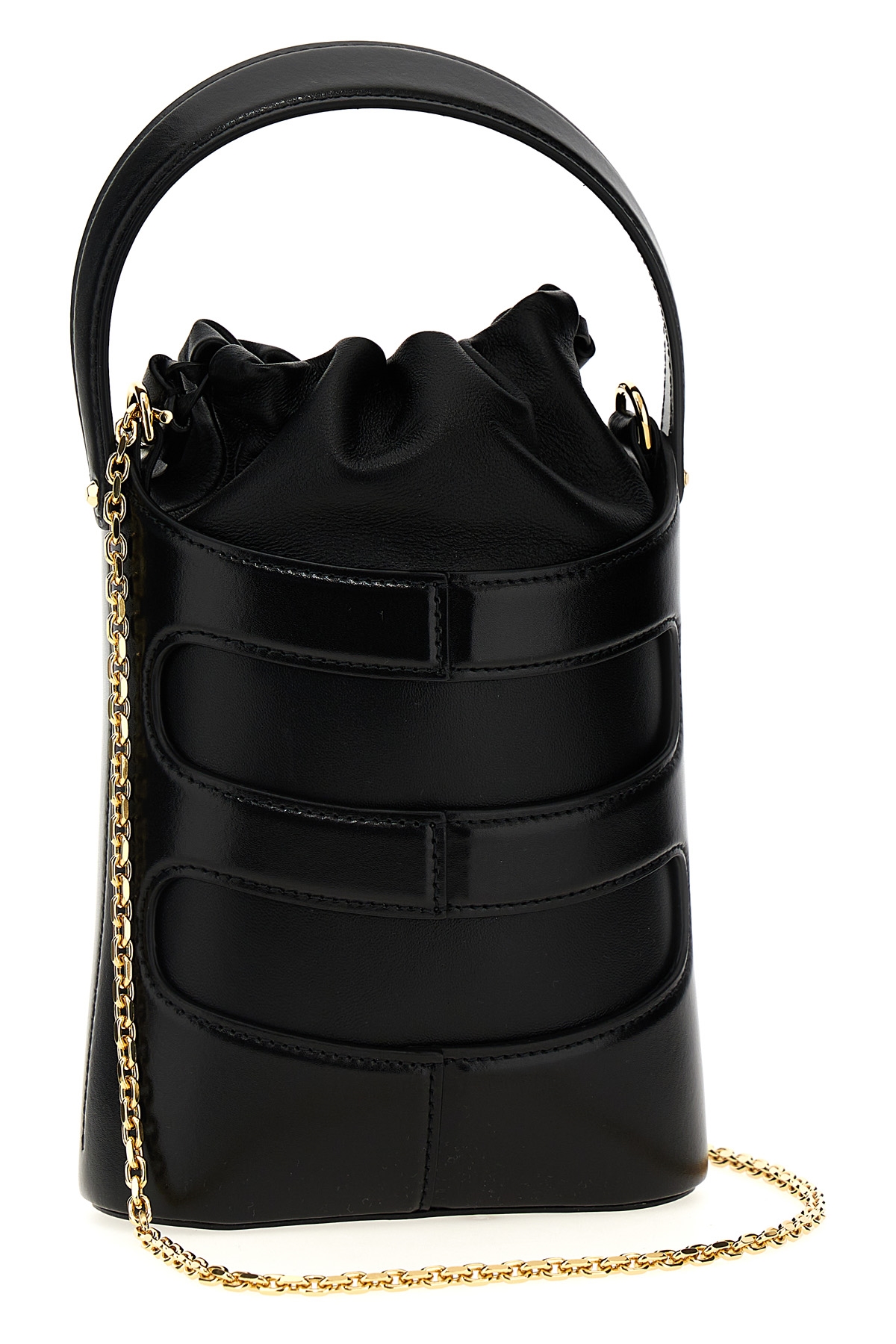 The Rise Mini' leather bucket bag with Harness-style structured cage and nappa clutch, drawstring closure, fixed handle, removable chain shoulder strap.