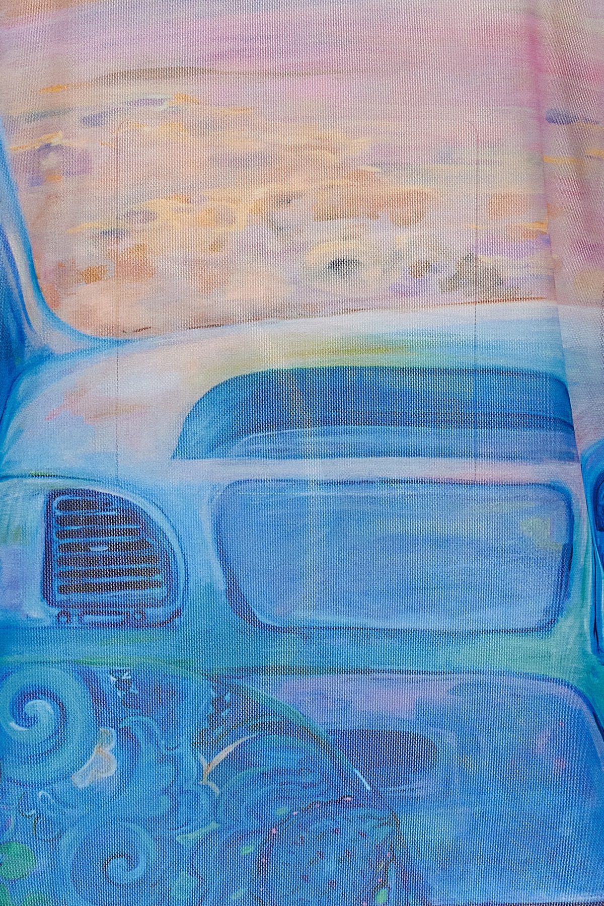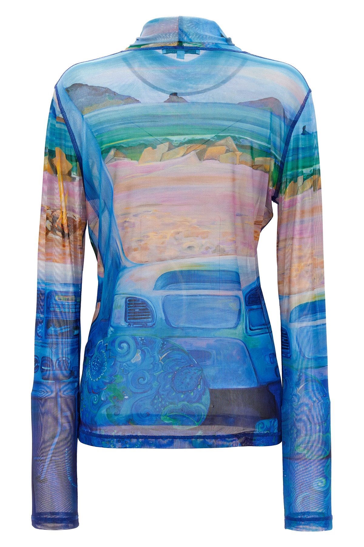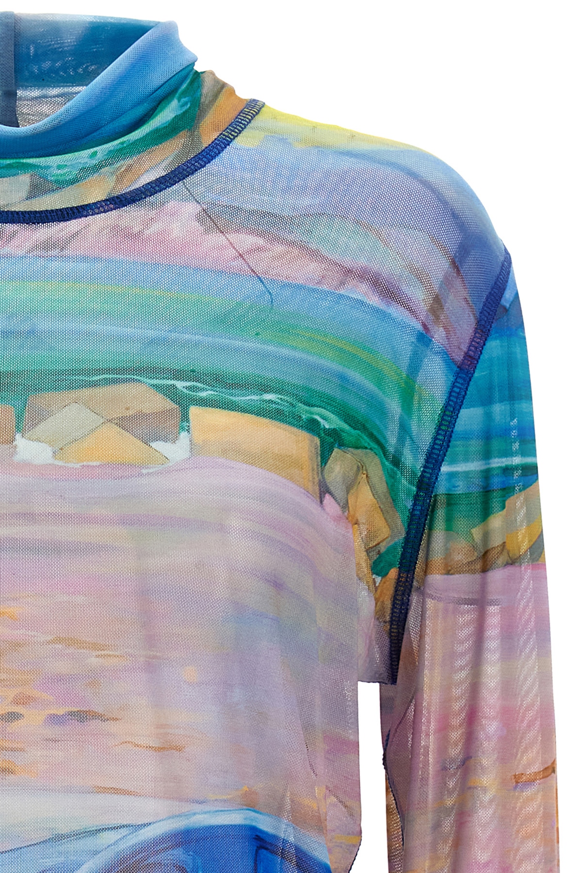 Top in semi-transparent mesh fabric with all-over print, high neck, long sleeves.