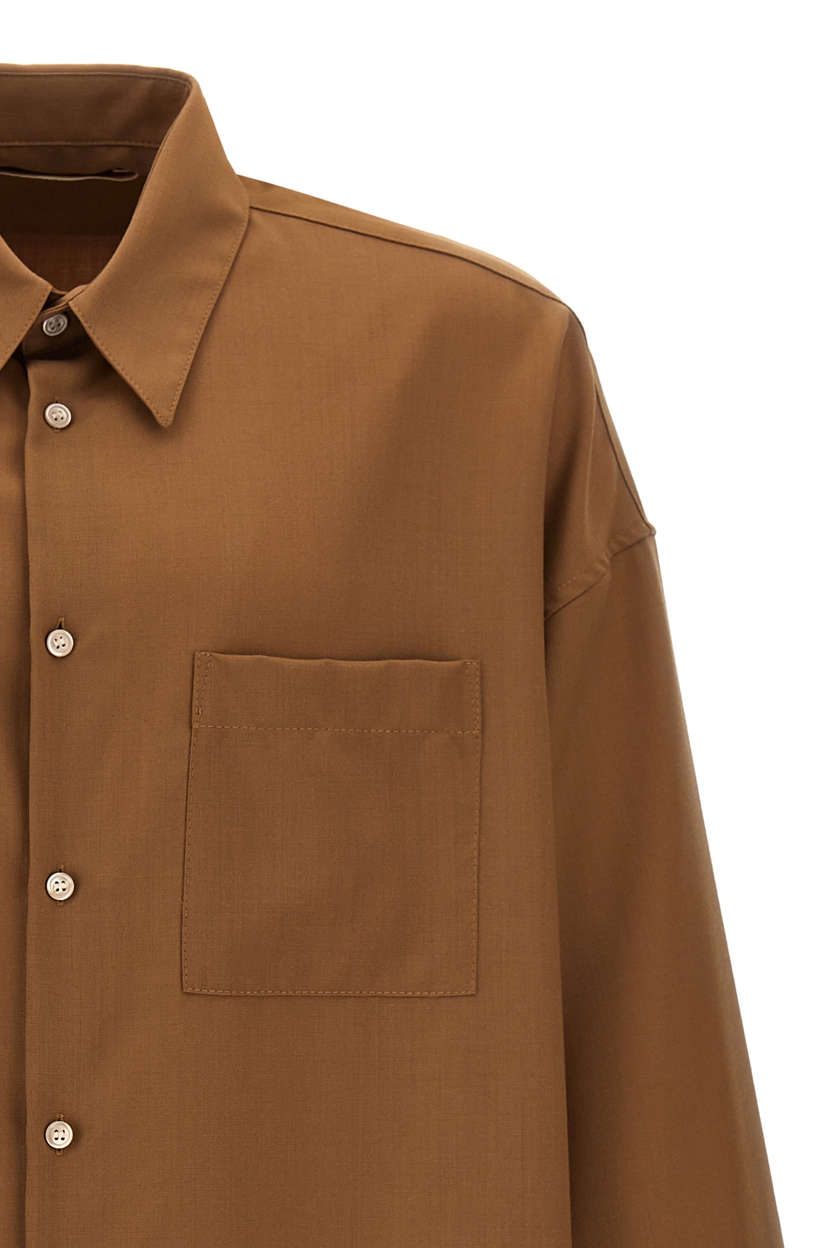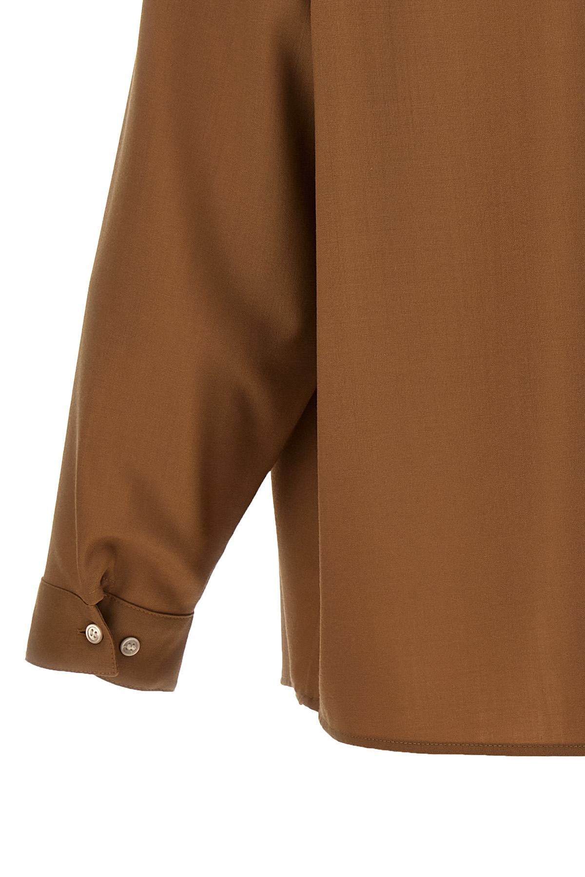 Wool shirt, side patch pocket, front button closure, long cuffed sleeves and a double button.