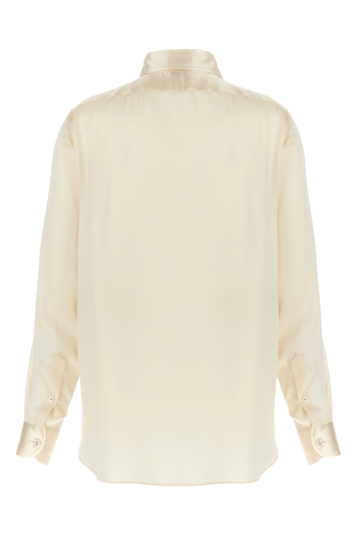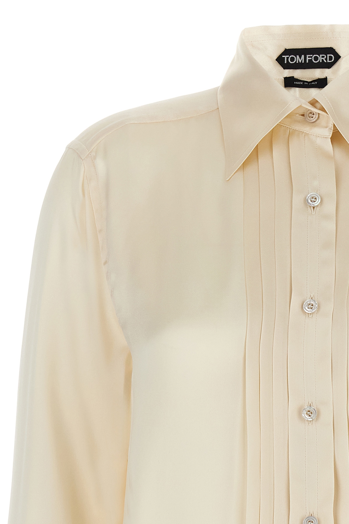 Silk shirt with pleated plastron, button closure, long cuffed sleeves.
