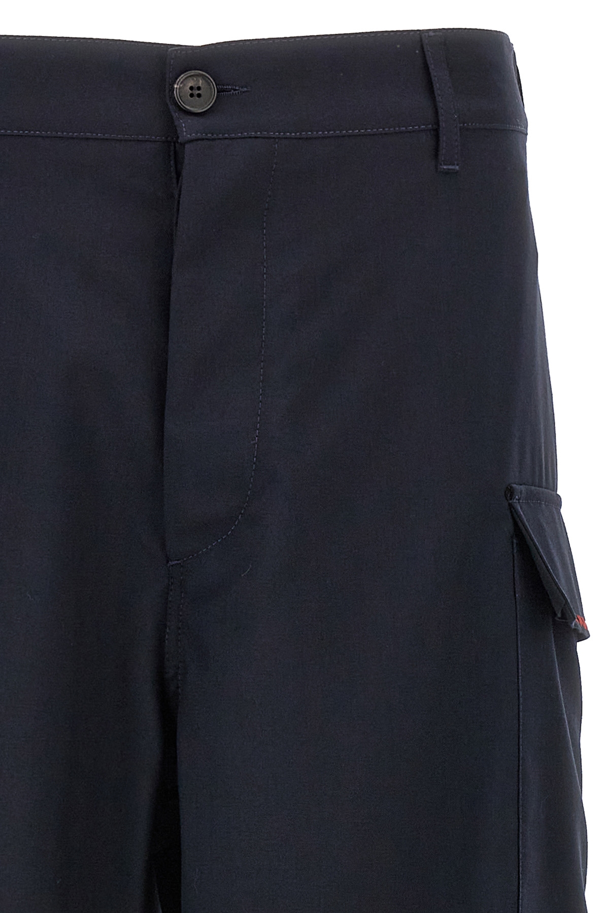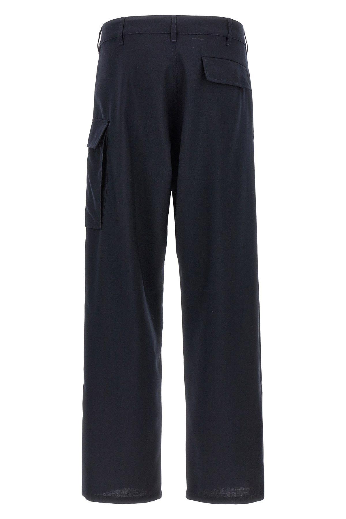 Virgin wool cargo pants with straight leg, button closure, loops, back welt pocket with flap, side pocket with logo embroidery.