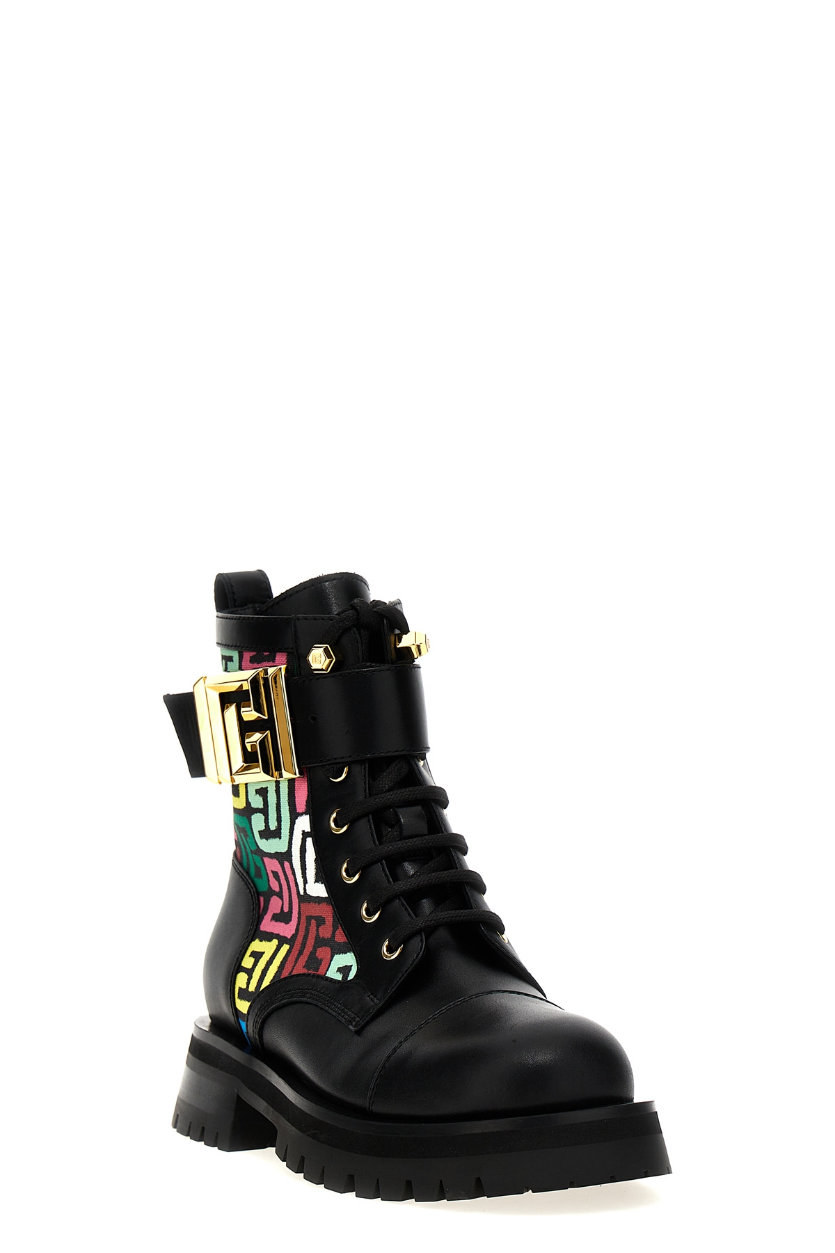 'Charlie' ankle boots in leather and printed fabric, lace-up closure, side zip, adjustable strap with logo buckle, rubber sole.