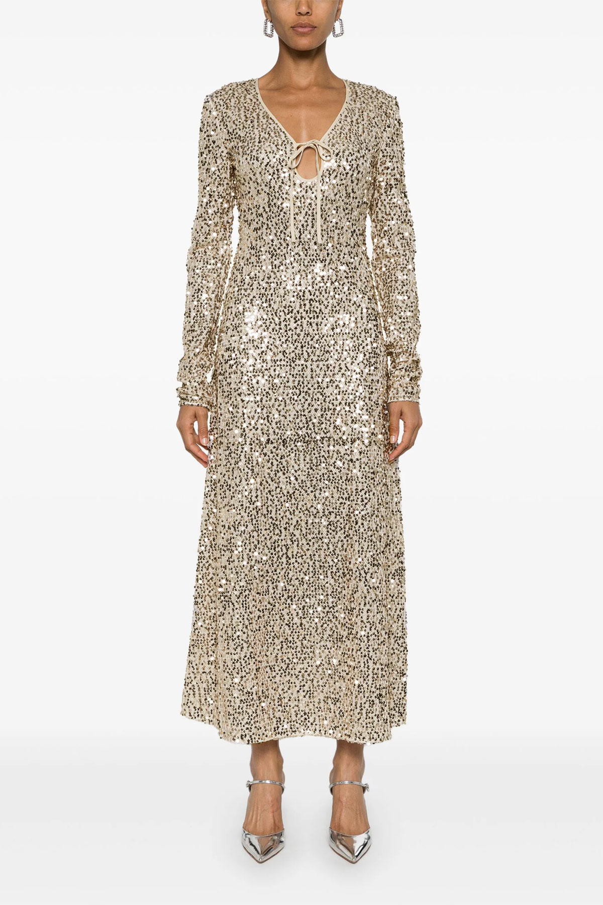 'Net Sequins Midi' dress in mesh fabric covered with sequins, V-neck with tie cord, long sleeves, side zip closure.