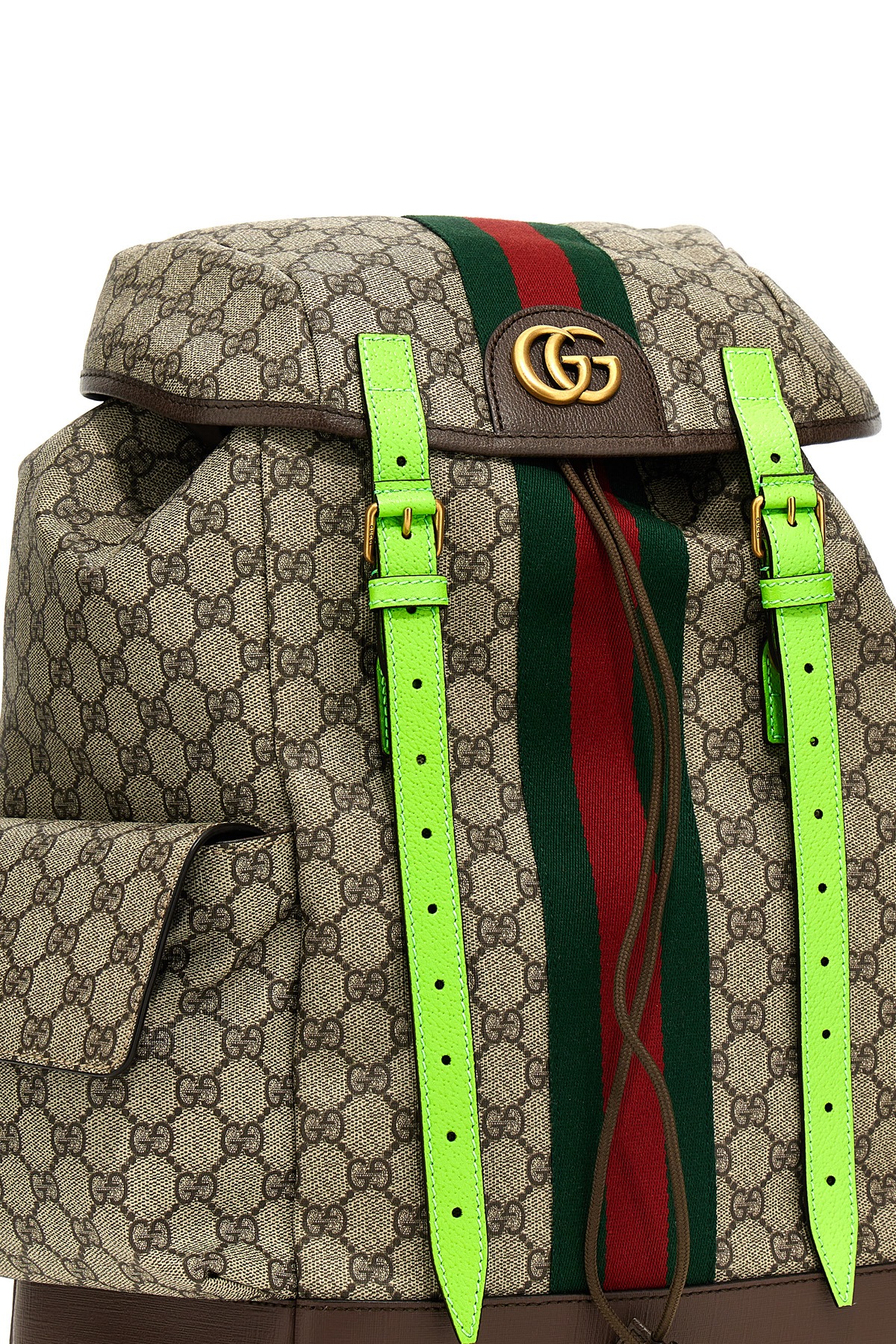'Ophidia GG' medium backpack in GG Supreme fabric with leather details, web ribbon, metal logo application, flap closure, straps and buckles, inner drawstring, adjustable shoulder straps.
