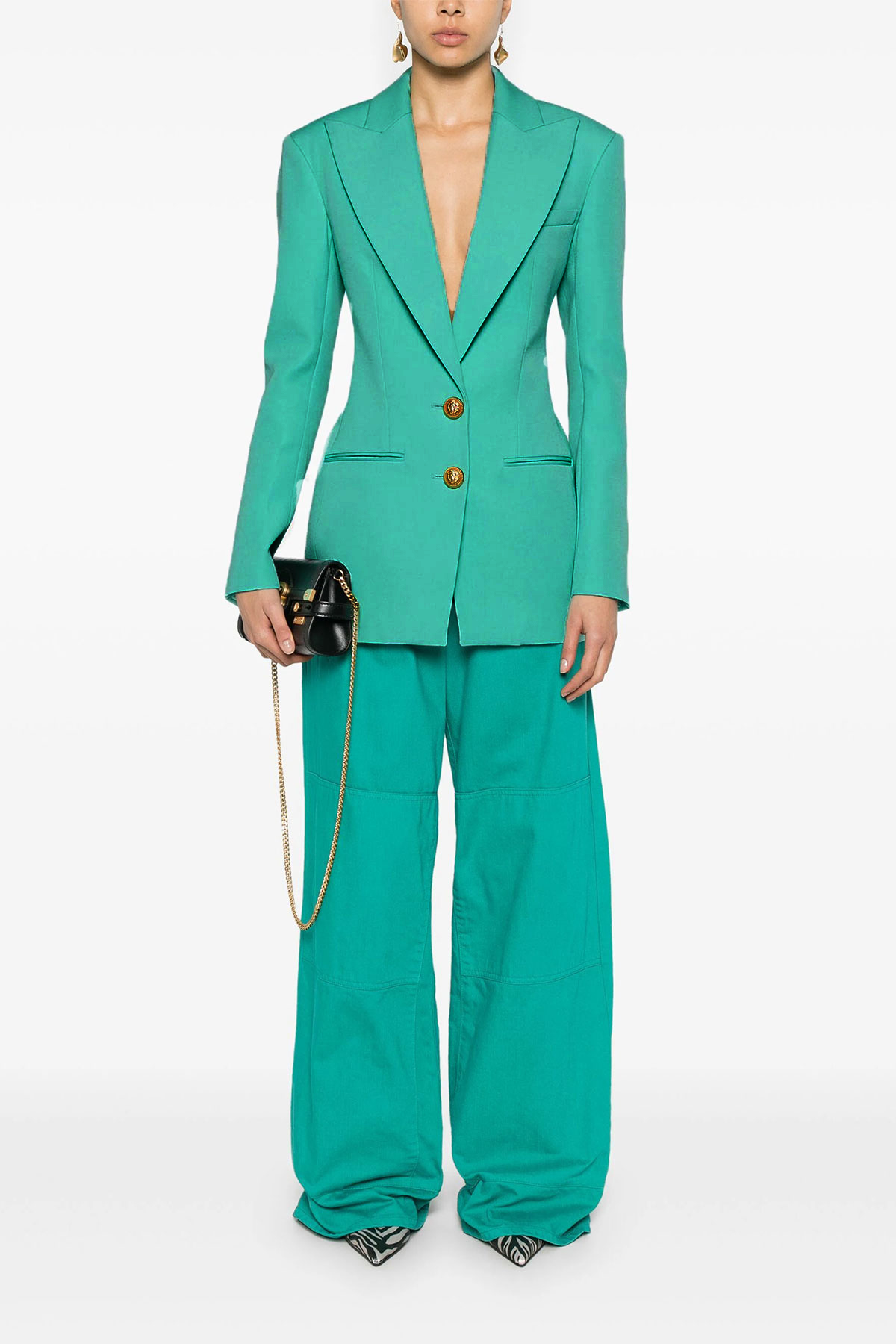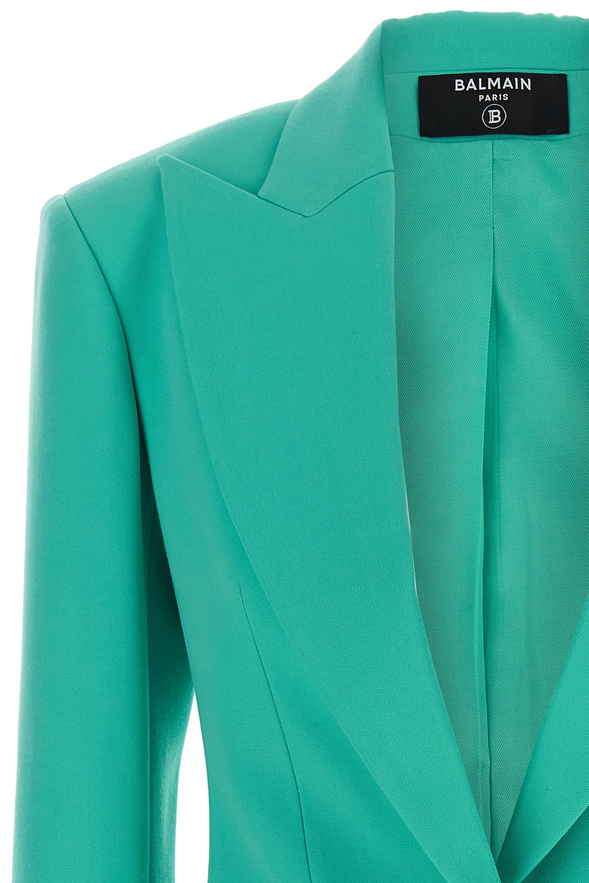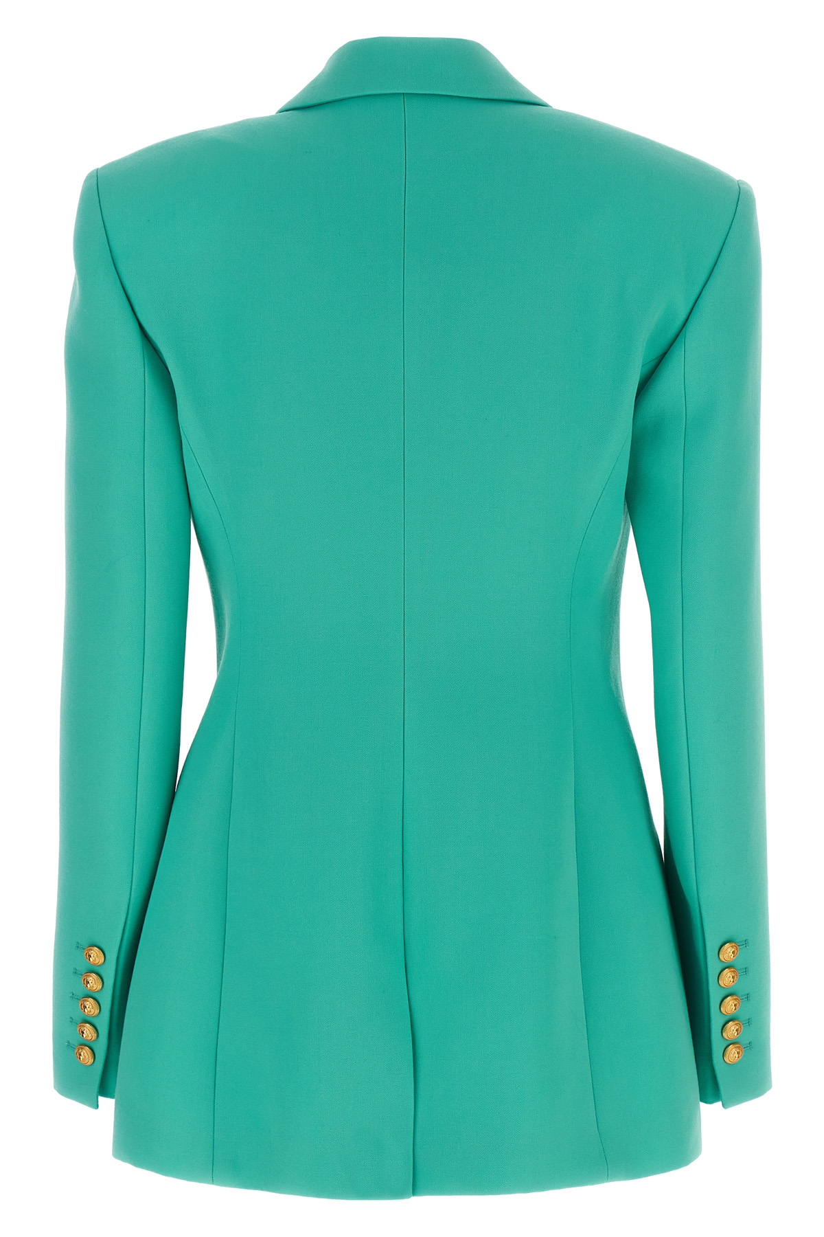 Double-breasted wool blazer with logo button closure, pockets, padded shoulders, long sleeves, back vent.