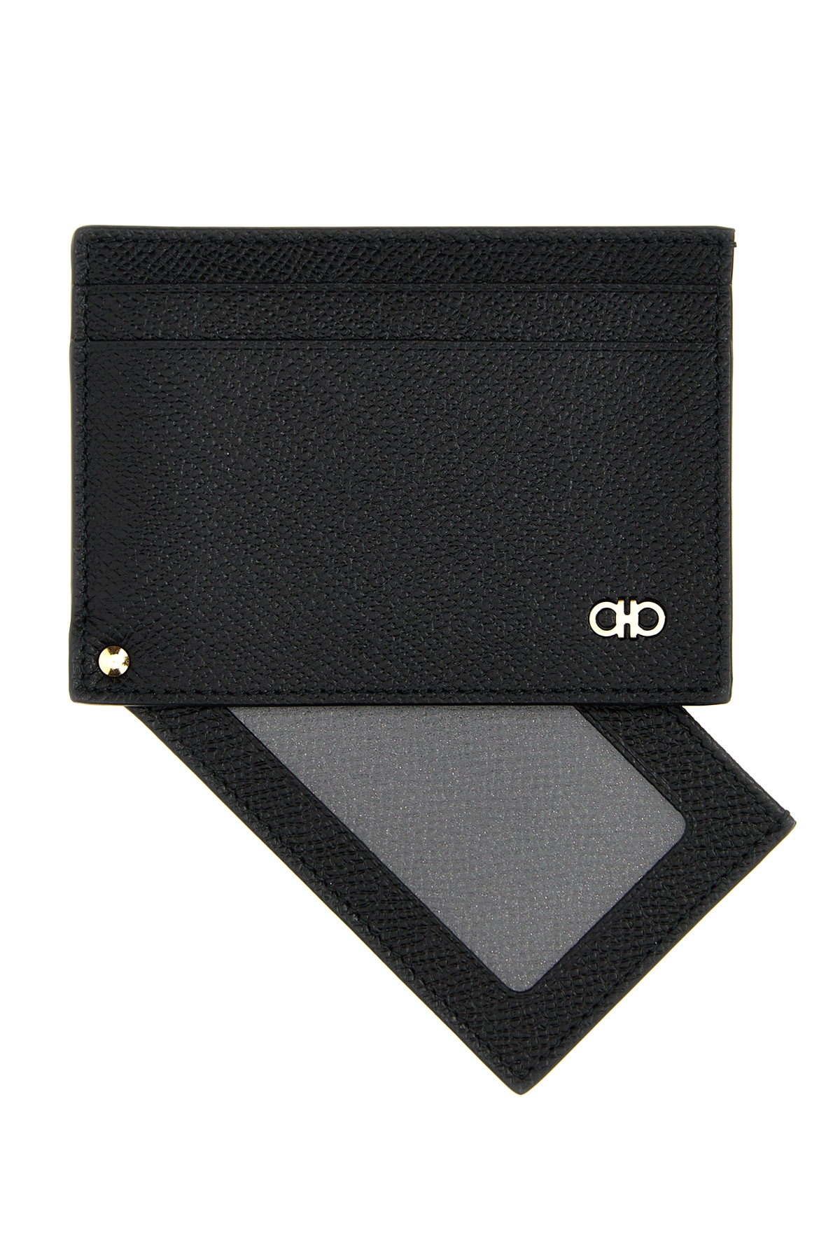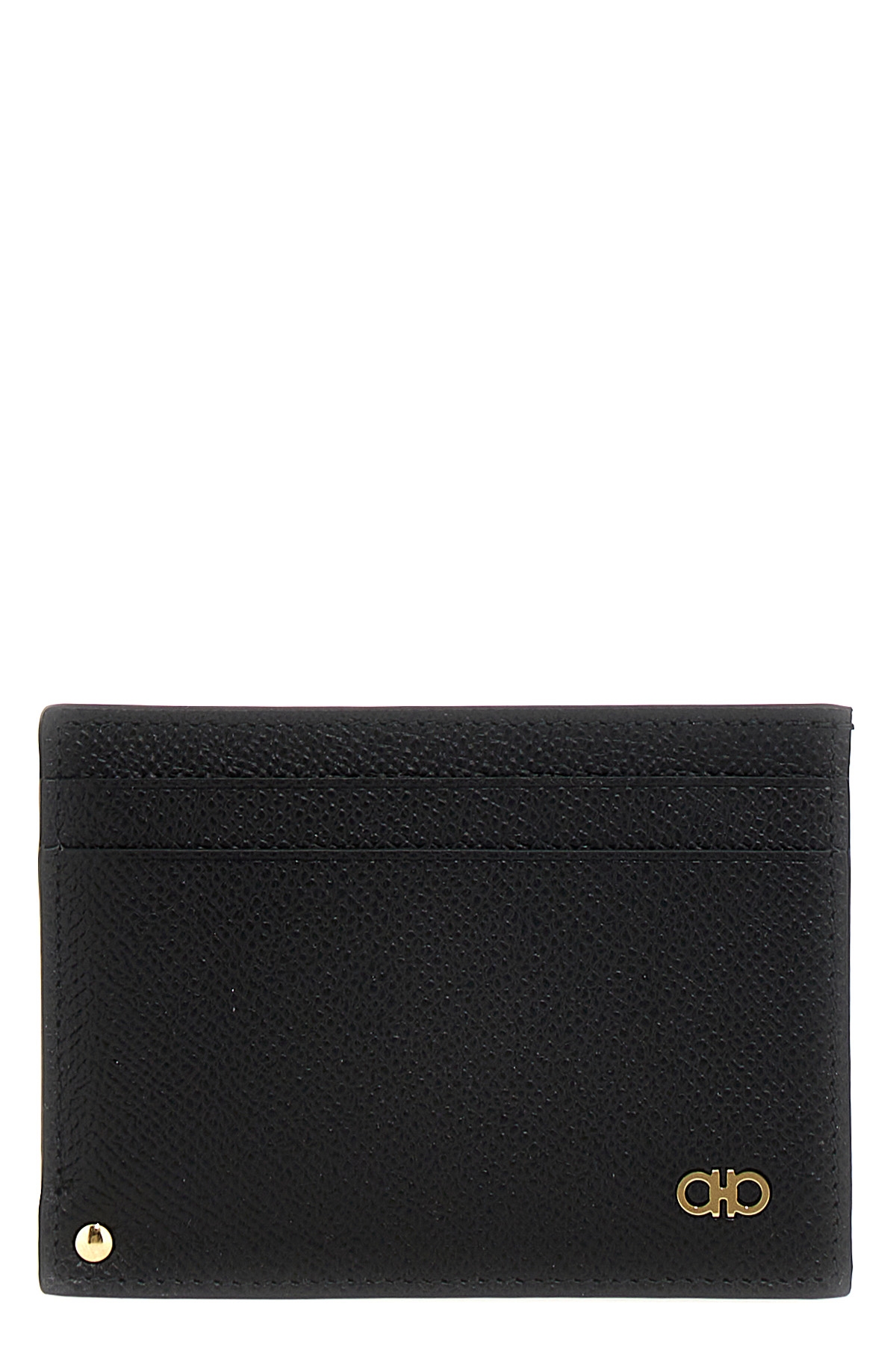 Leather card holder with metal 'Micro Gancio' detail.