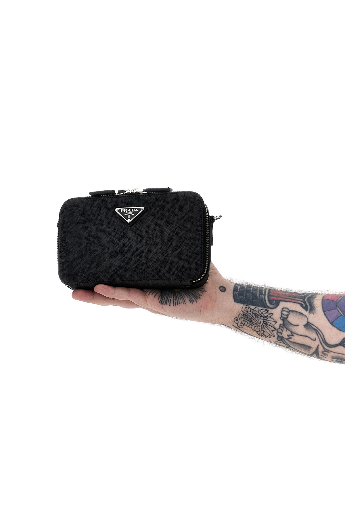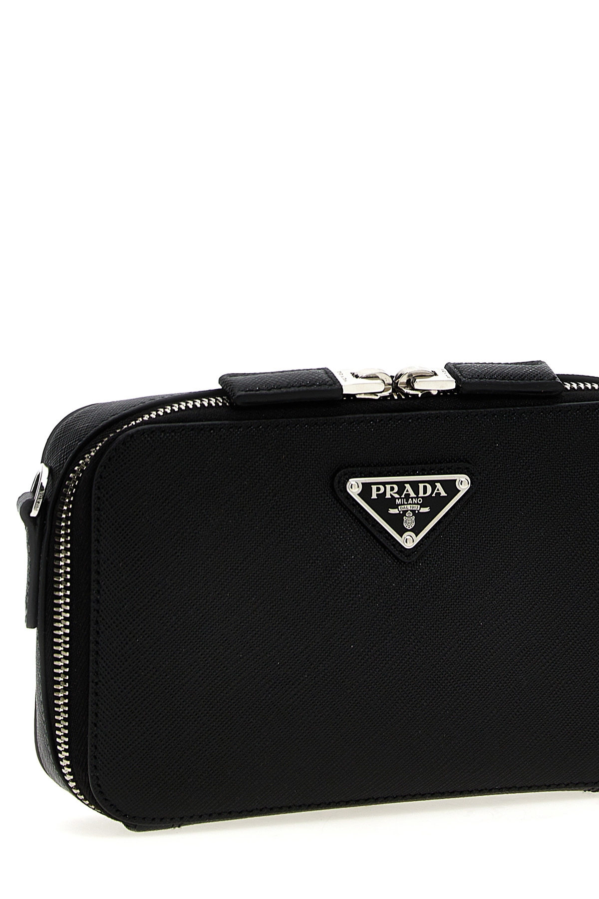 'Prada Brique' saffiano leather crossbody bag with front metal enameled triangle logo, zip closure, adjustable and removable shoulder strap.
