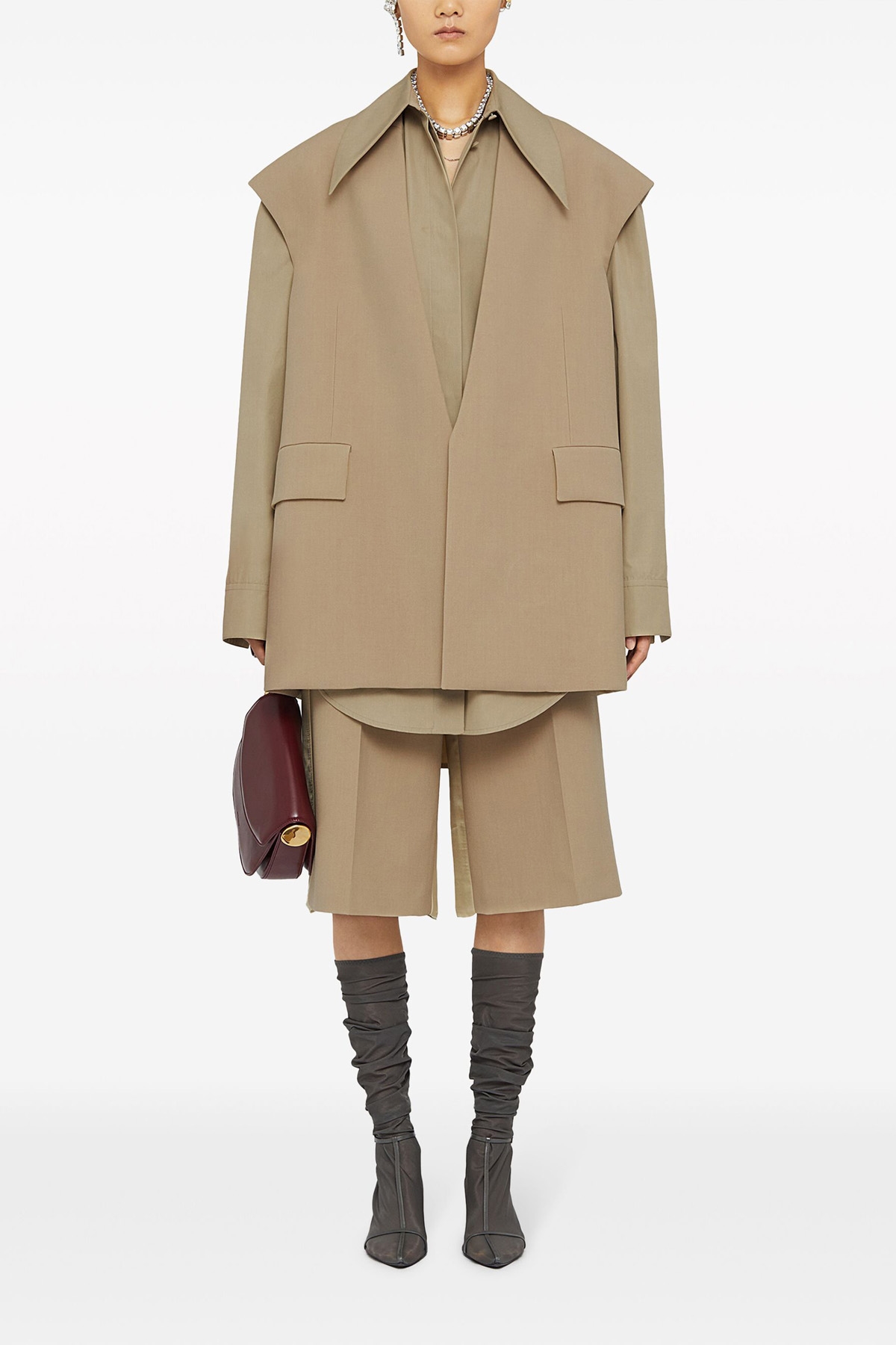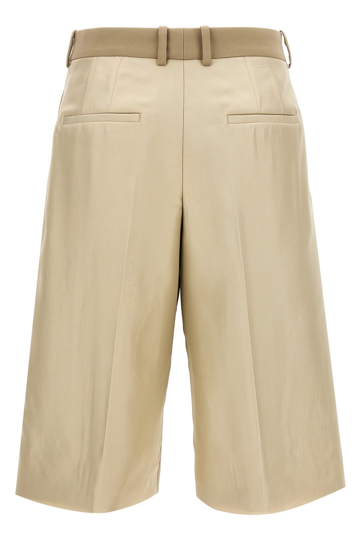 Wool gabardine bermuda shorts with double layer at the back, straight leg with stretched pleat, hook and zip closure, side pockets, raw cut hem.