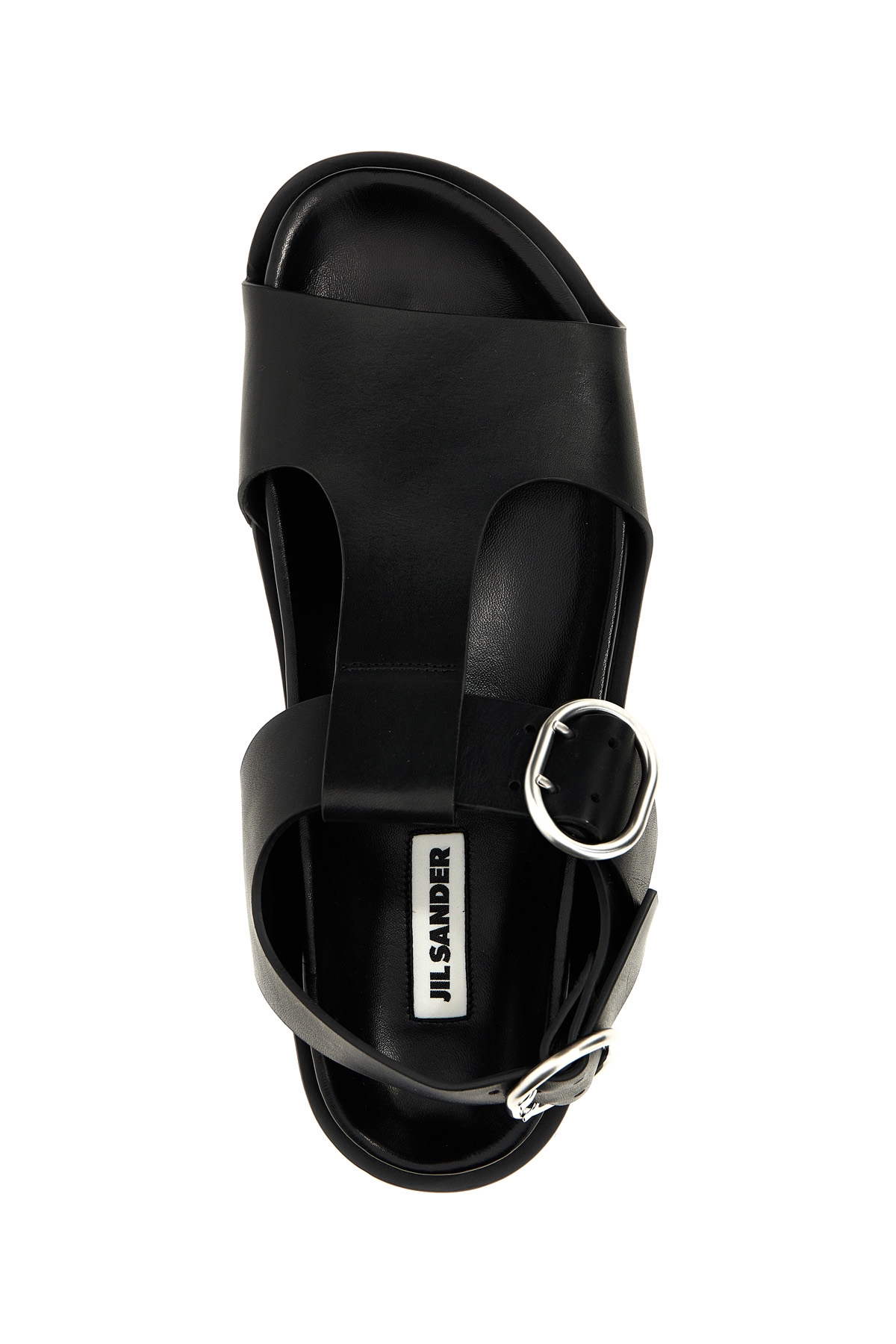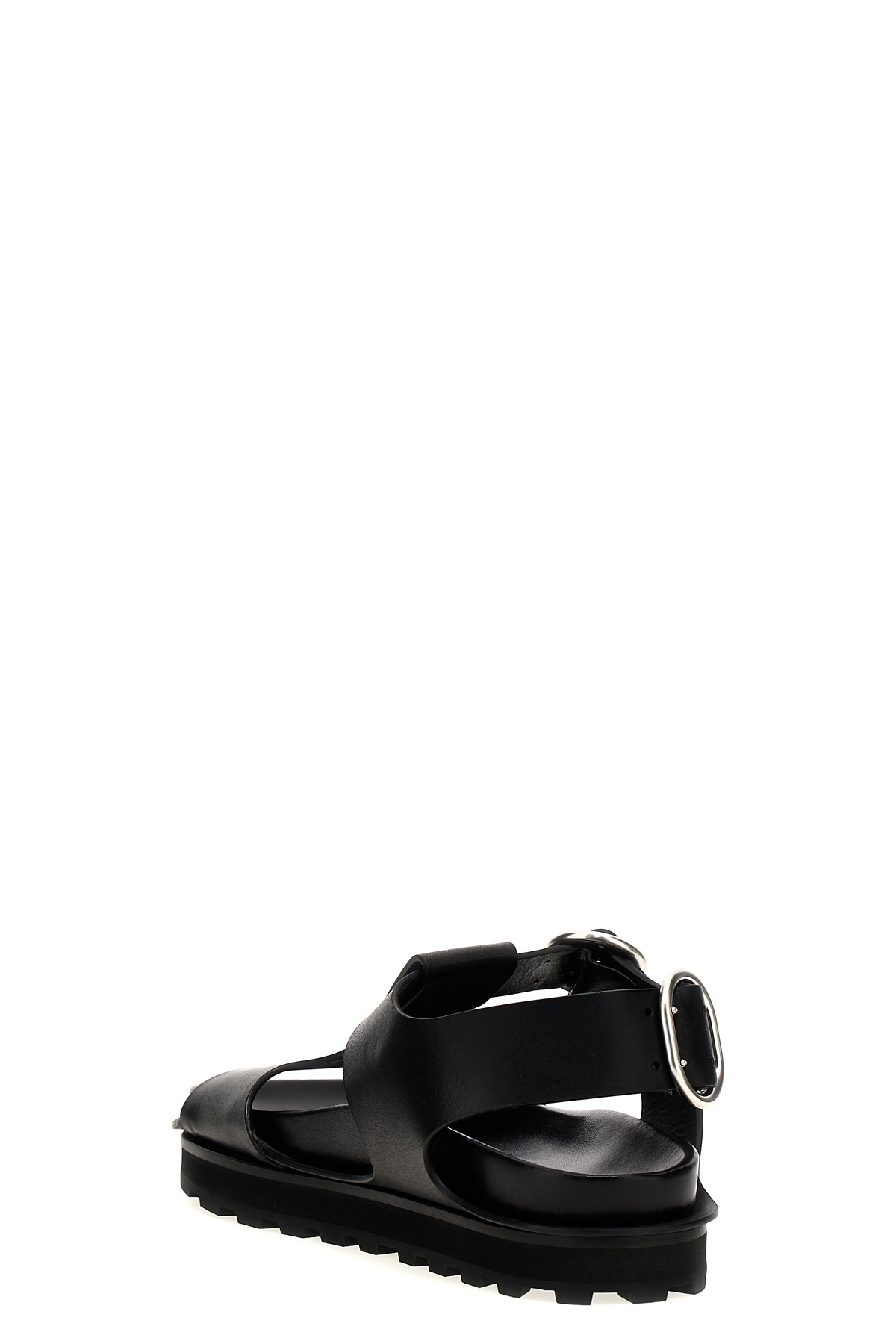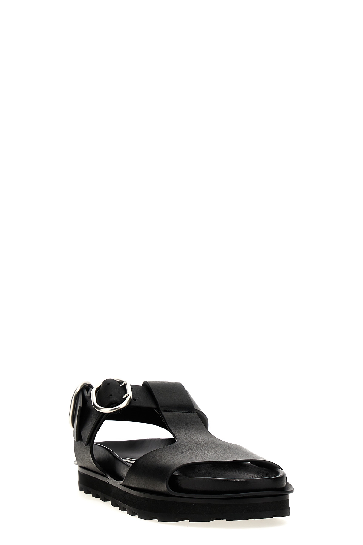 Leather sandals, adjustable straps with metal buckle, rubber sole.