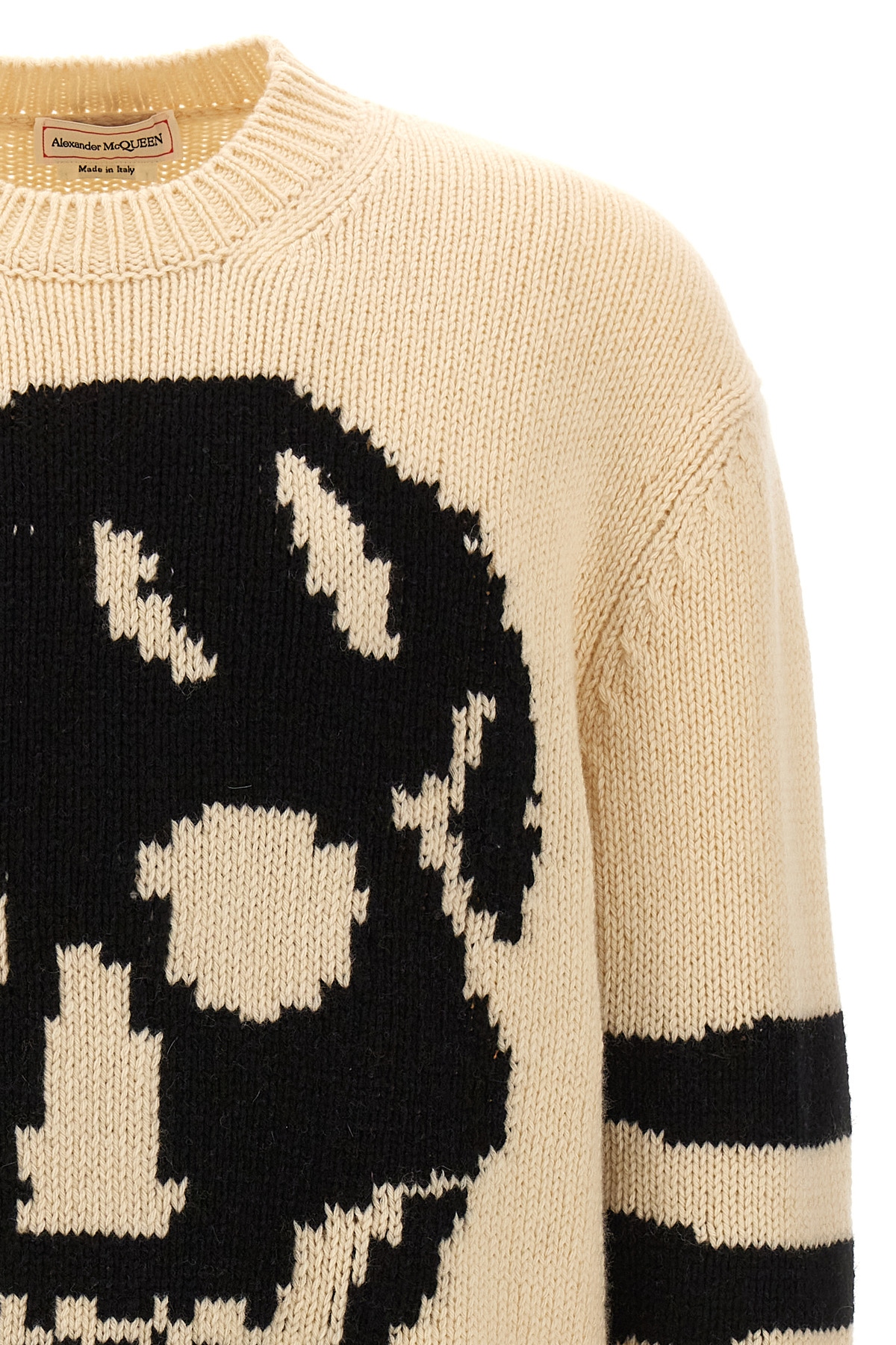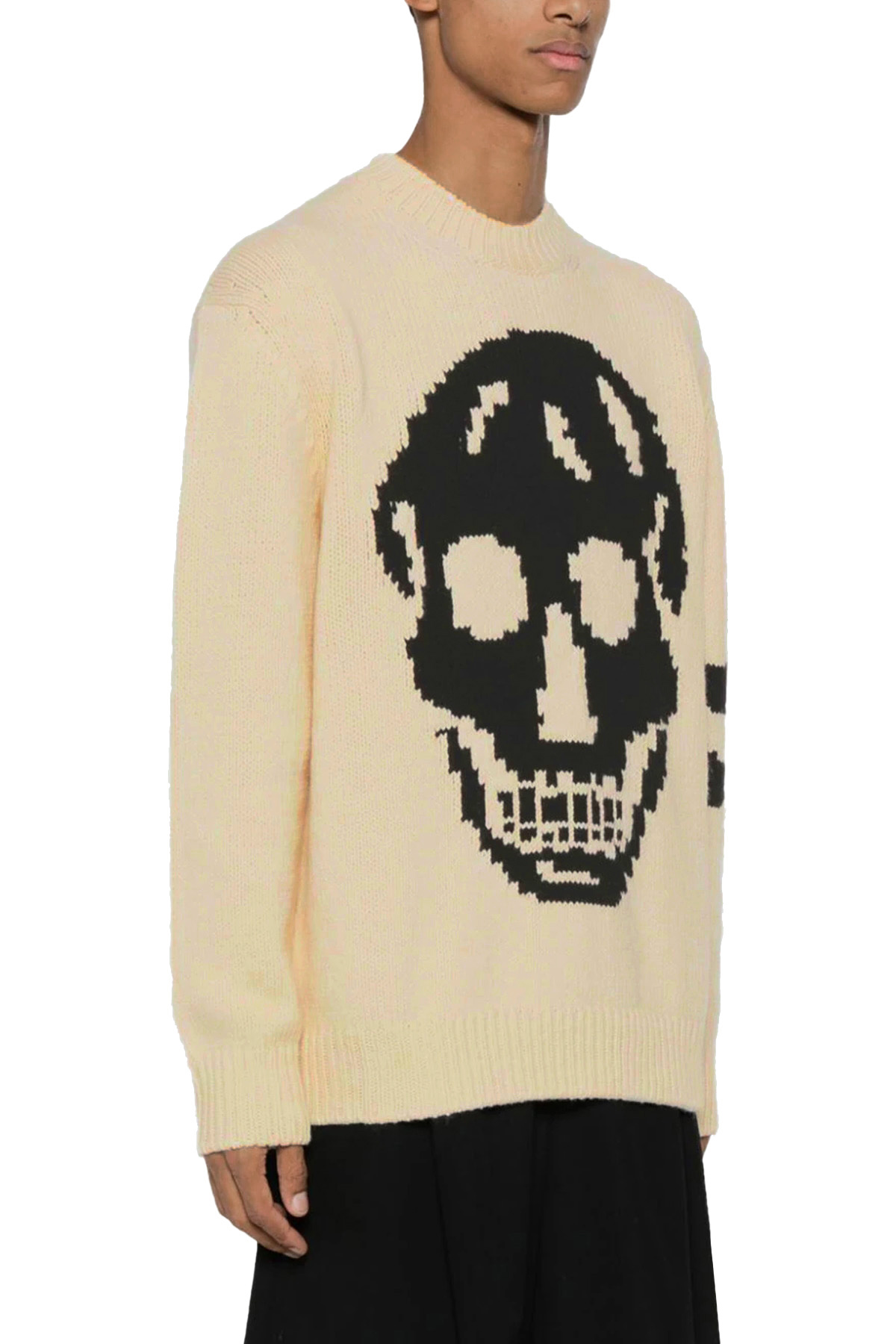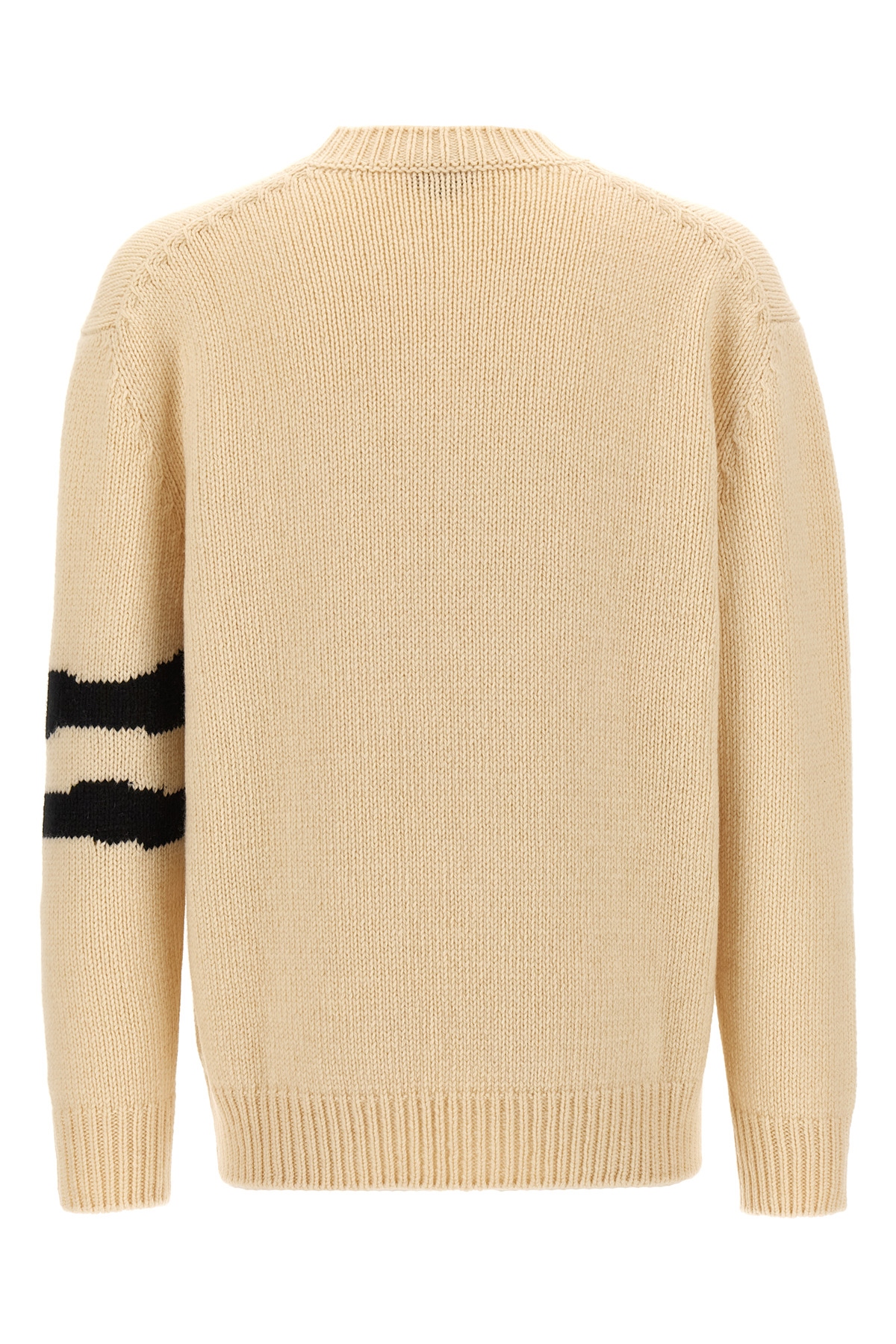 Wool blend sweater with contrast intarsia, crew neck, long cuffed sleeves.