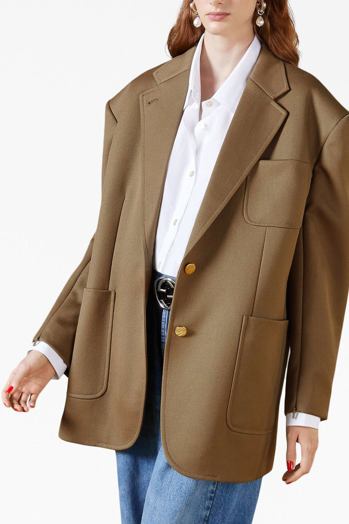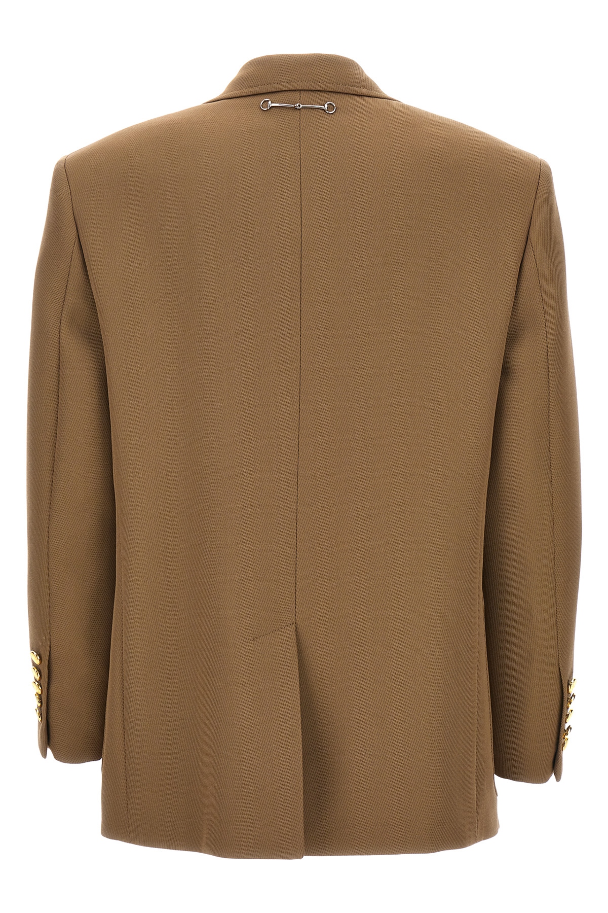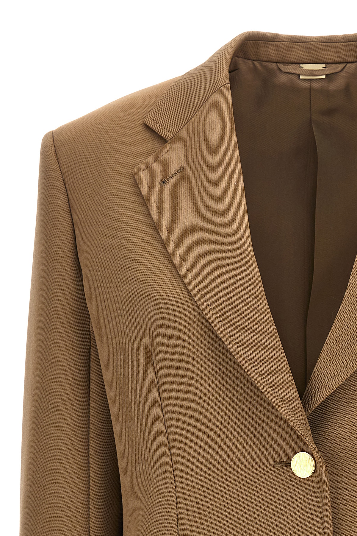 Wool single-breasted blazer with button closure, buttons on the sleeve and invisible zip, front pockets, clamp detail on the back