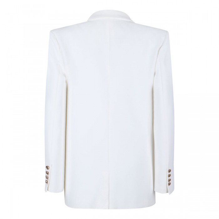 White stretch crepe blazer from Elisabetta Franchi featuring peak lapels, double-breasted silhouette, flap pockets, golden metal logo buttons, padded shoulders, buttoned cuffs, branded lining.
