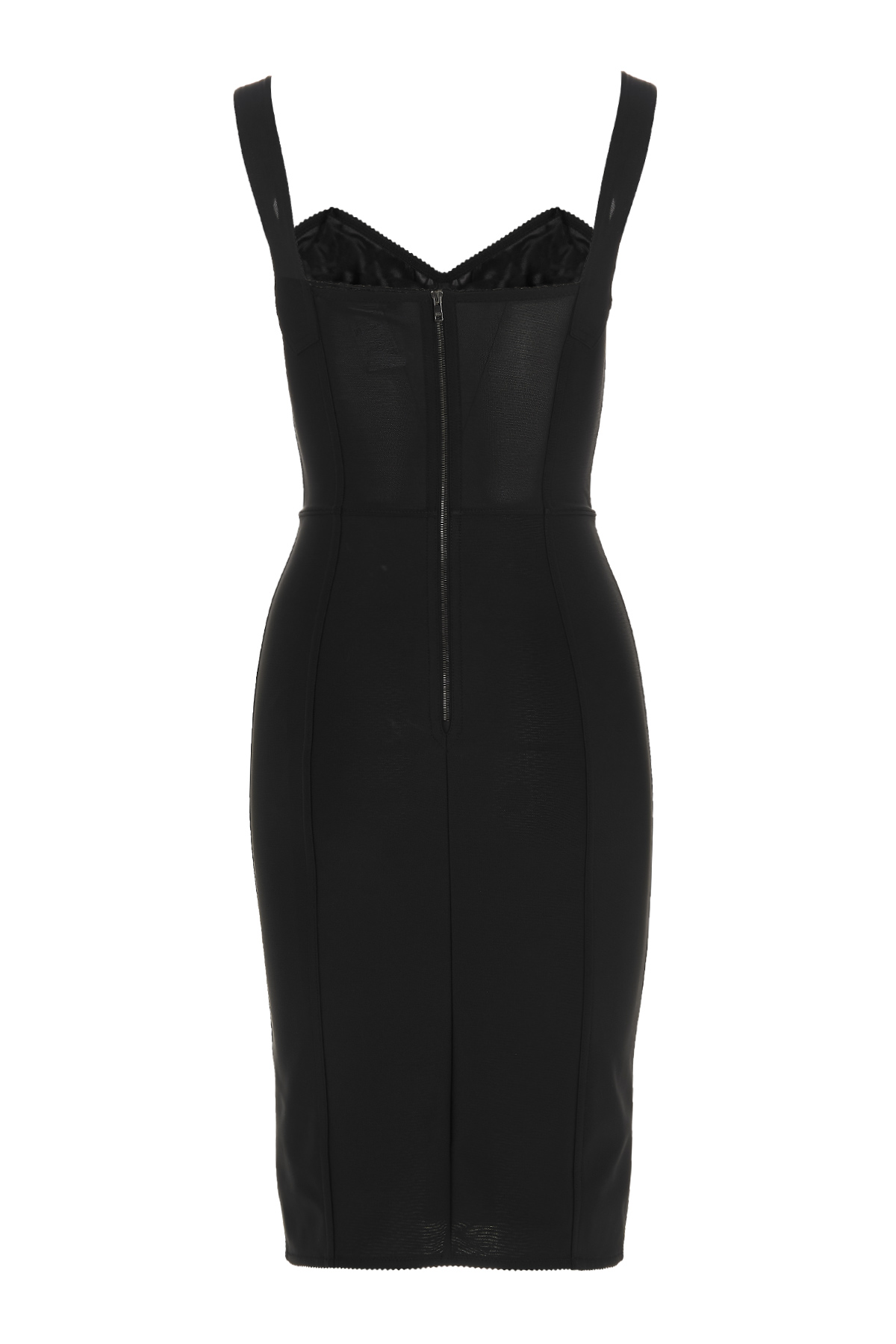 Powernet and lace midi corsetry dress, sweetheart neckline, back zipper closure.