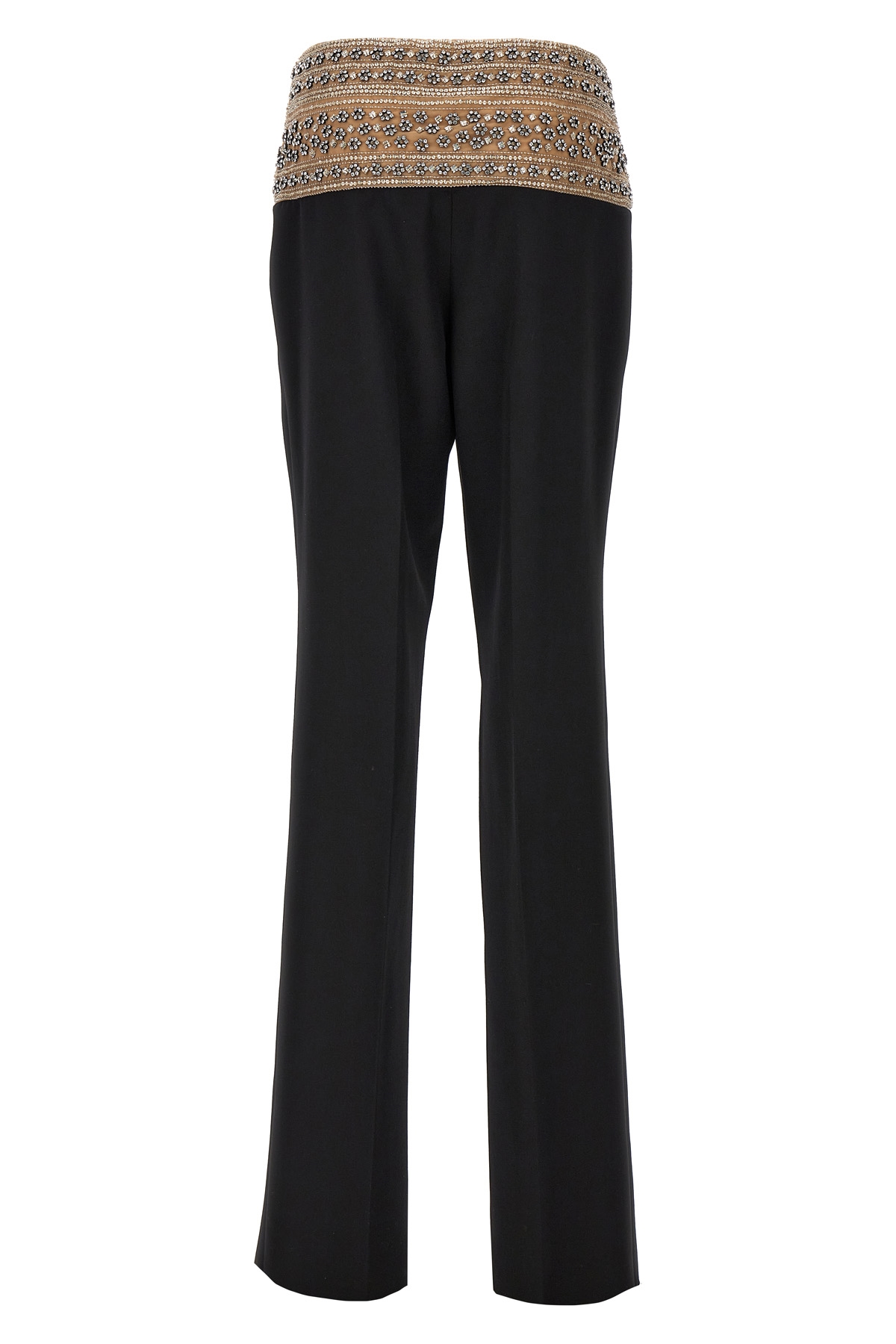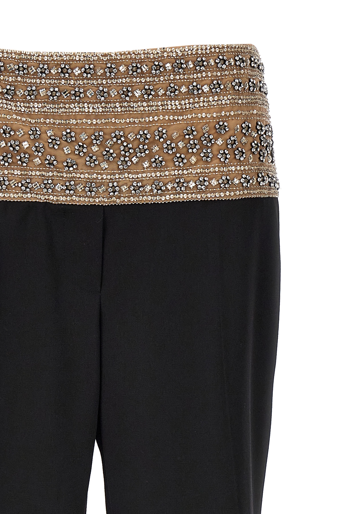 'Smoking' wool pants, stretched pleat, mesh fabric detail at the waist with crystal embroidery.