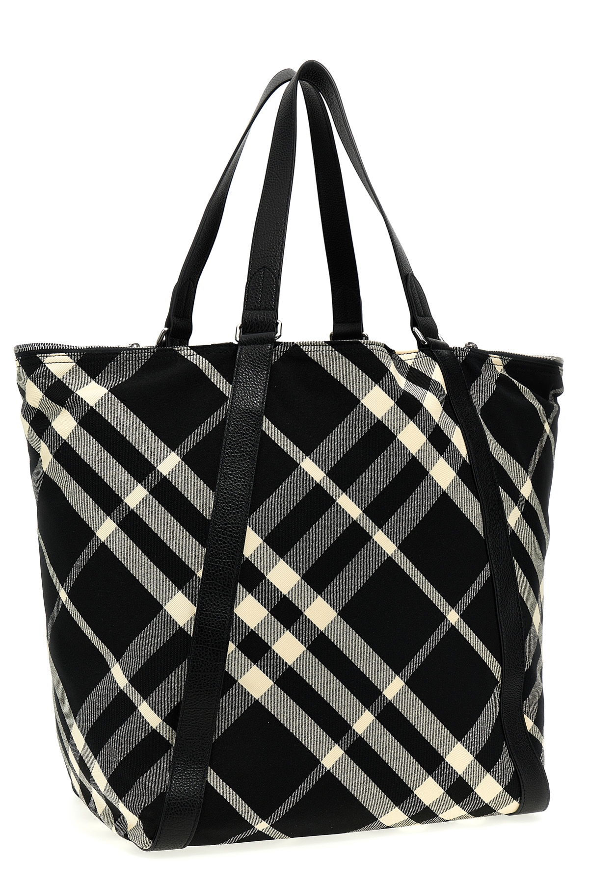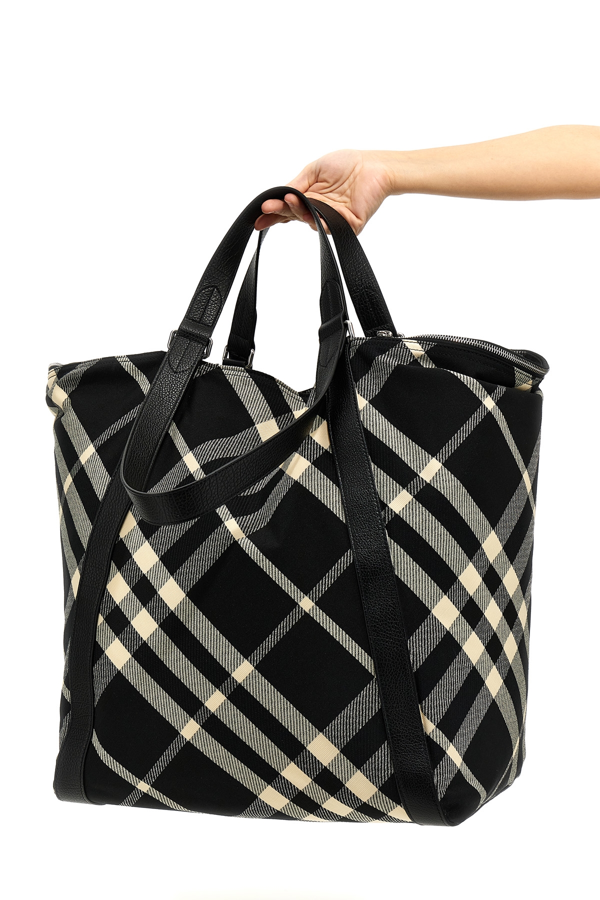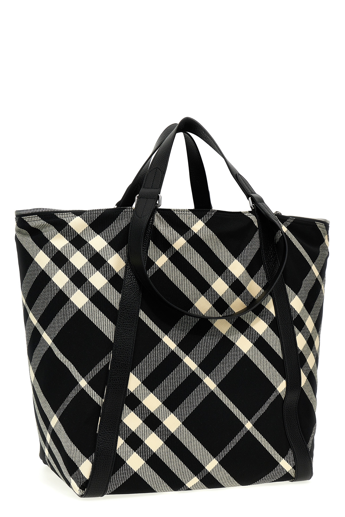 Cotton blend shopping bag with all-over Burberry Check pattern, double adjustable leather handle, exterior pockets, metal details.