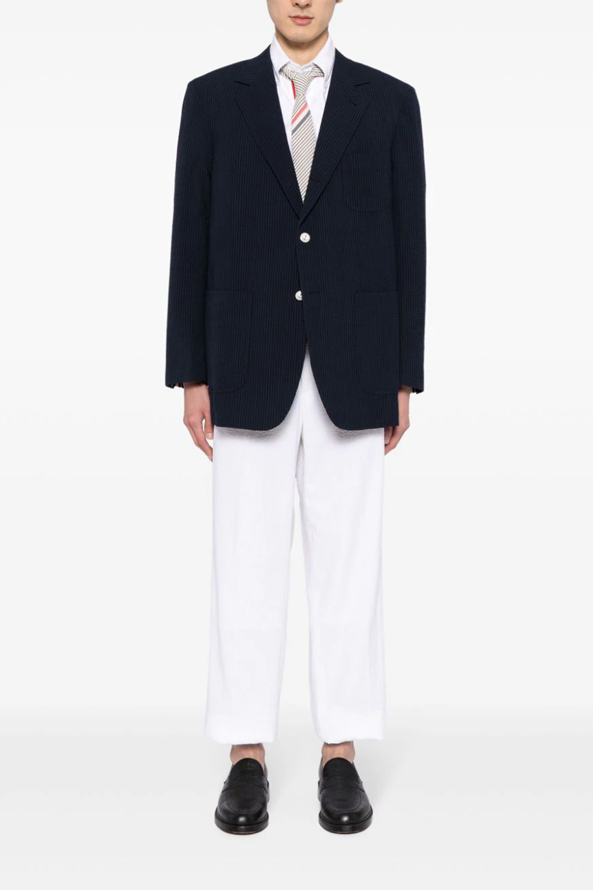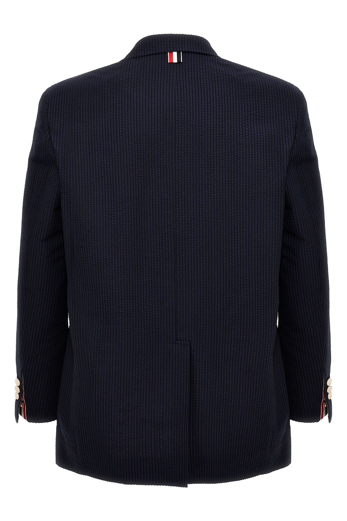 Single-breasted seersucker wool blazer with button closure, pockets, long sleeves, back split.