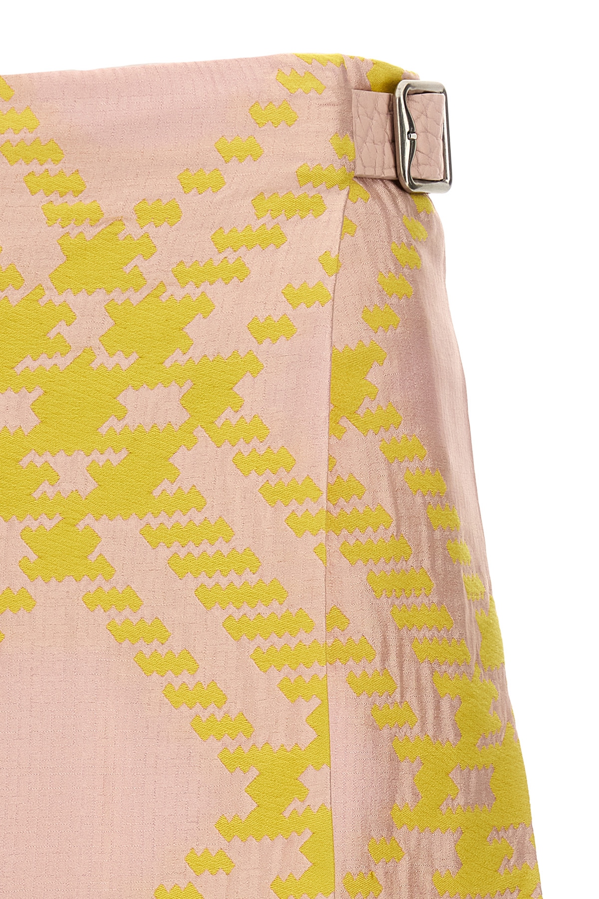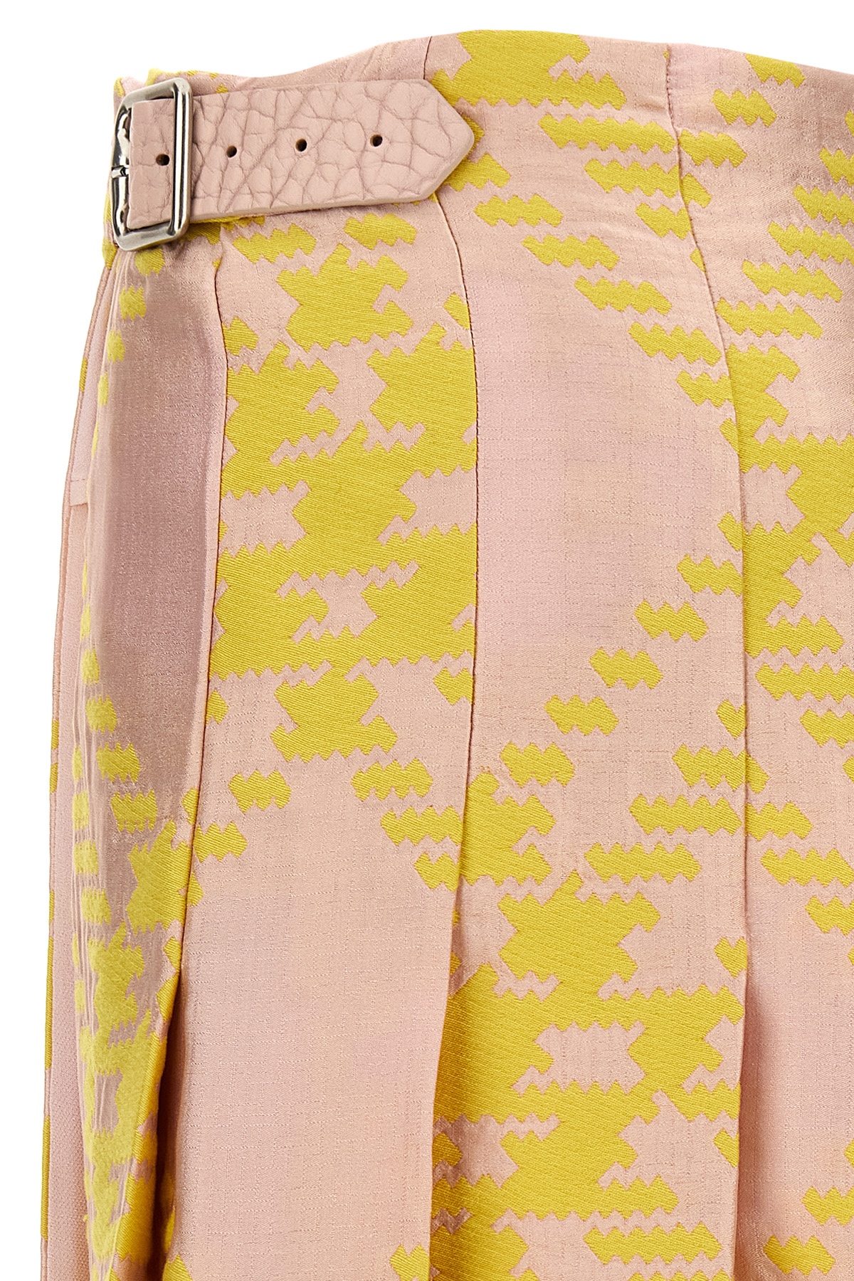 Macro check print cotton blend skirt, wallet closure with buttons and leather strap on the side.