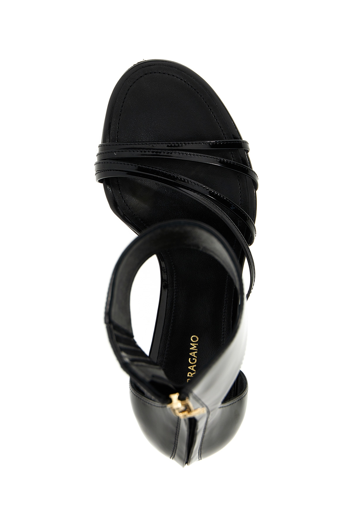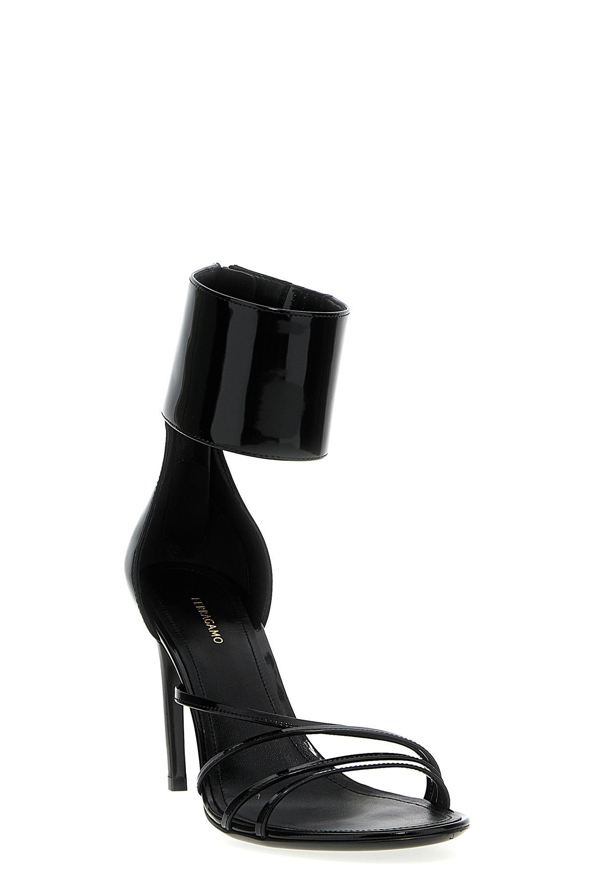 Glossy brushed nappa leather 'Clethra' sandal, ankle strap with back zipper, curved heel.