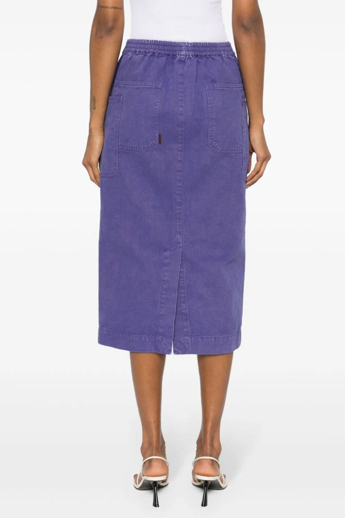 'Cardiff' skirt in garment-dyed cotton canvas, zip and hook closure, elastic waistband, overlapping patch pockets, back split.