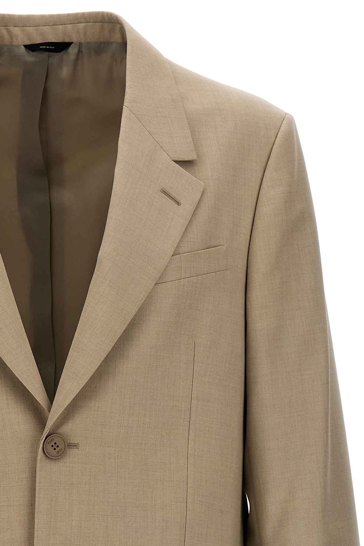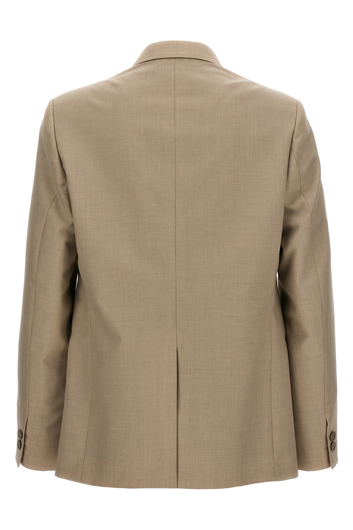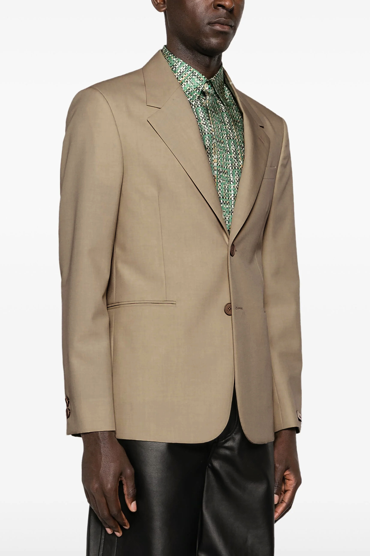 Single-breasted wool blazer with button closure, pockets, structured shoulders, long sleeves, back split.