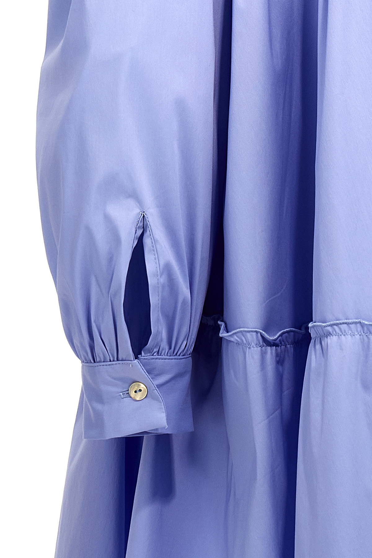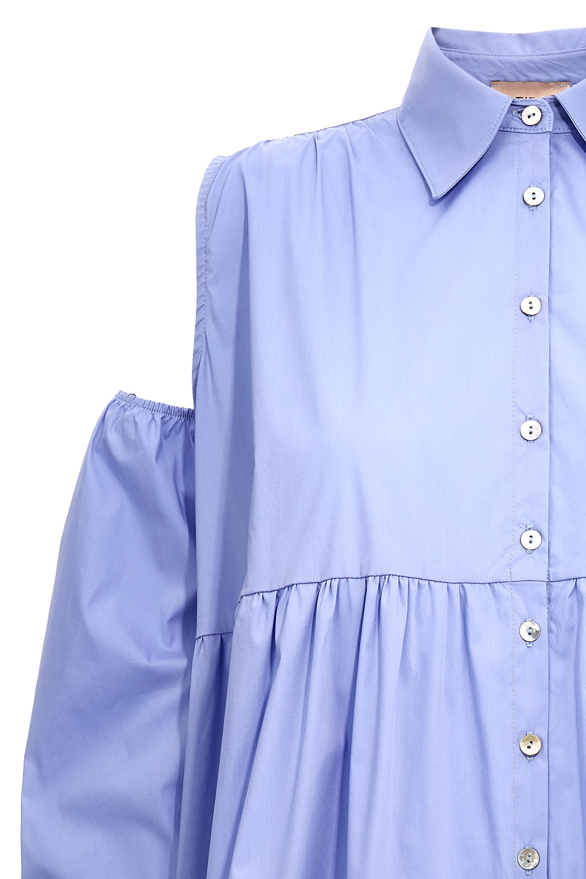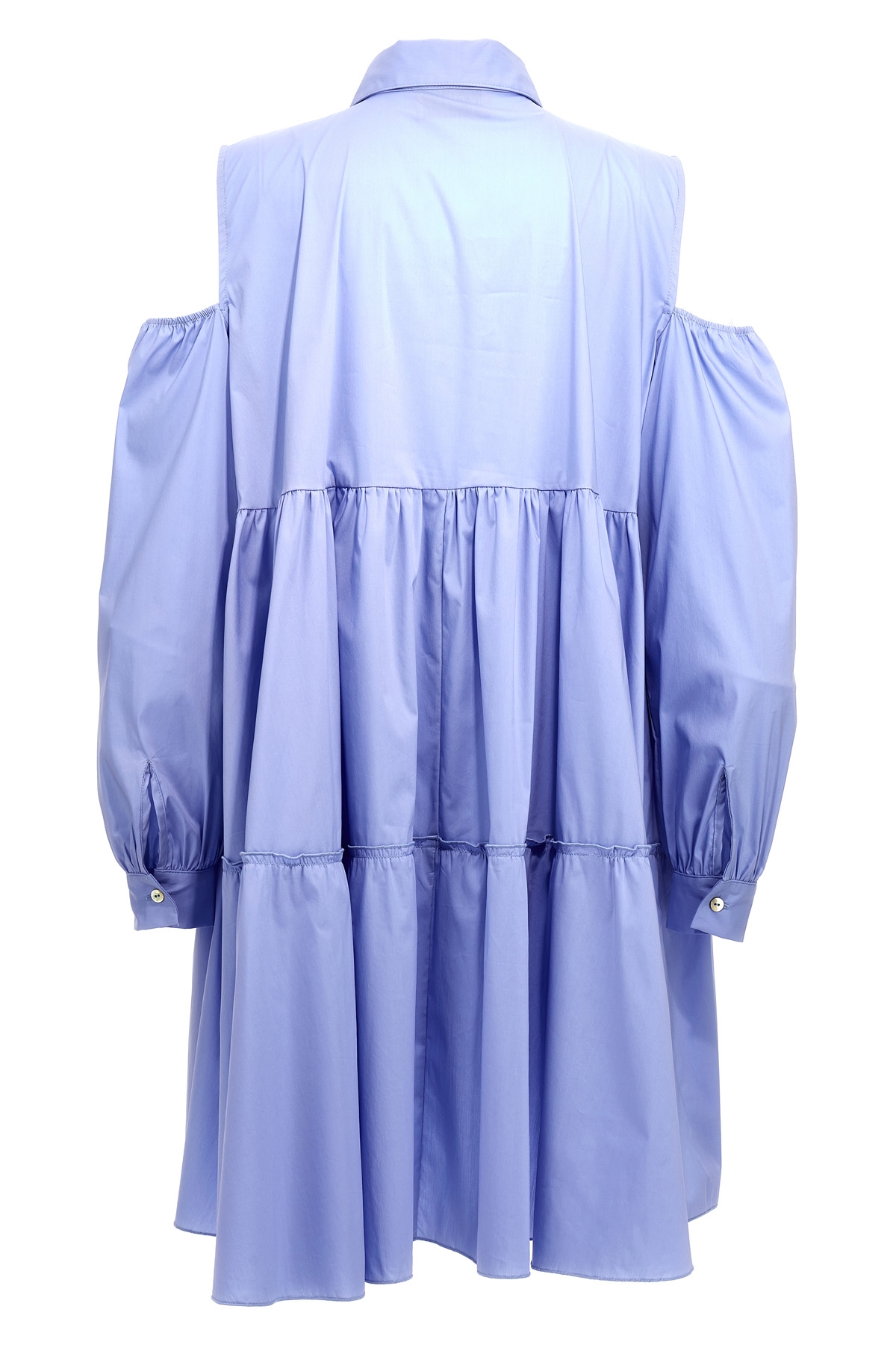 'Fara' dress in cotton with curls, 'cut out' shoulder detail with elastic, long sleeves, front button closure, shirt collar, button cuffs.