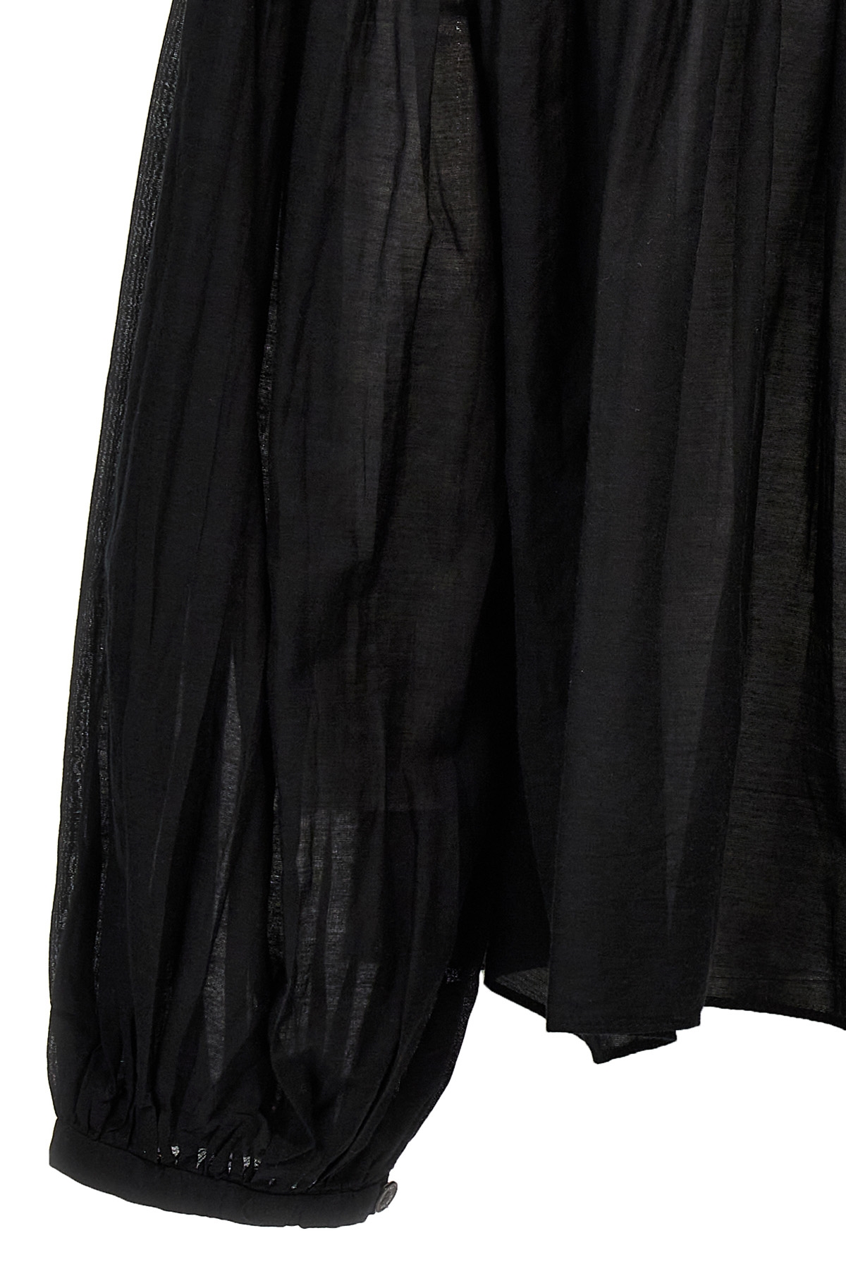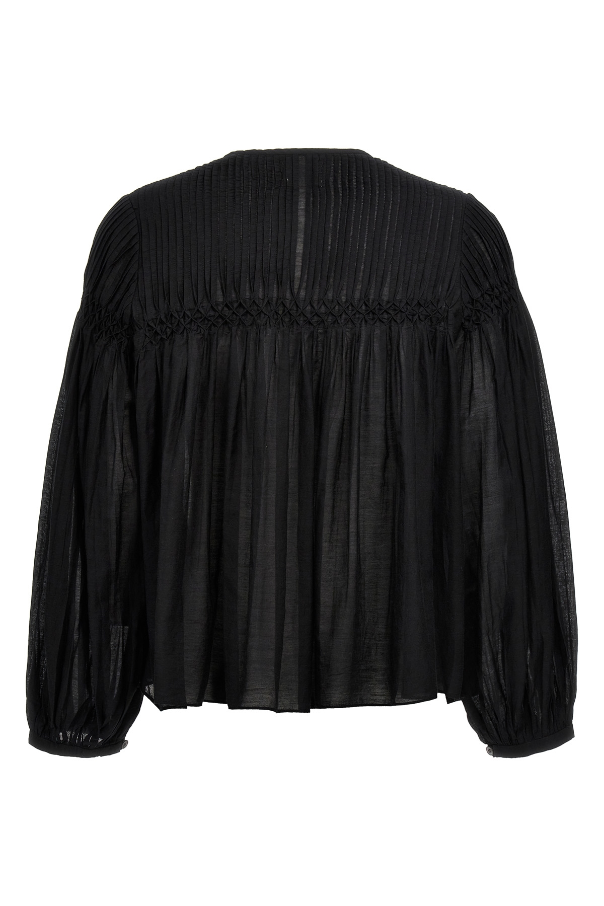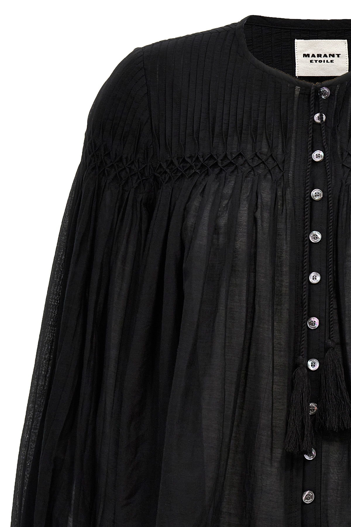 'Abadi' cotton blend shirt with front button closure and drawstring with tassels around the neck, long sleeves, pleated detail at the top.