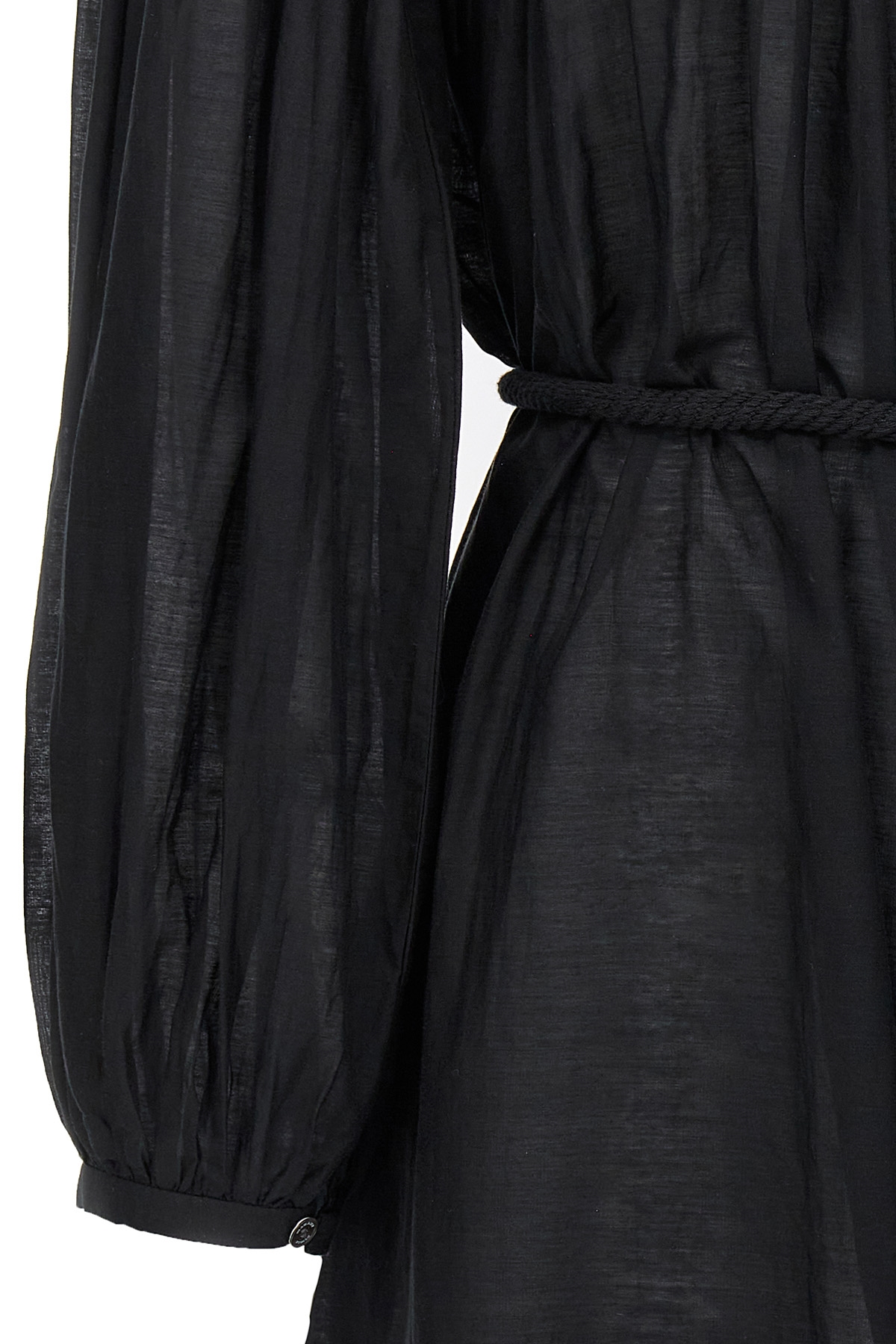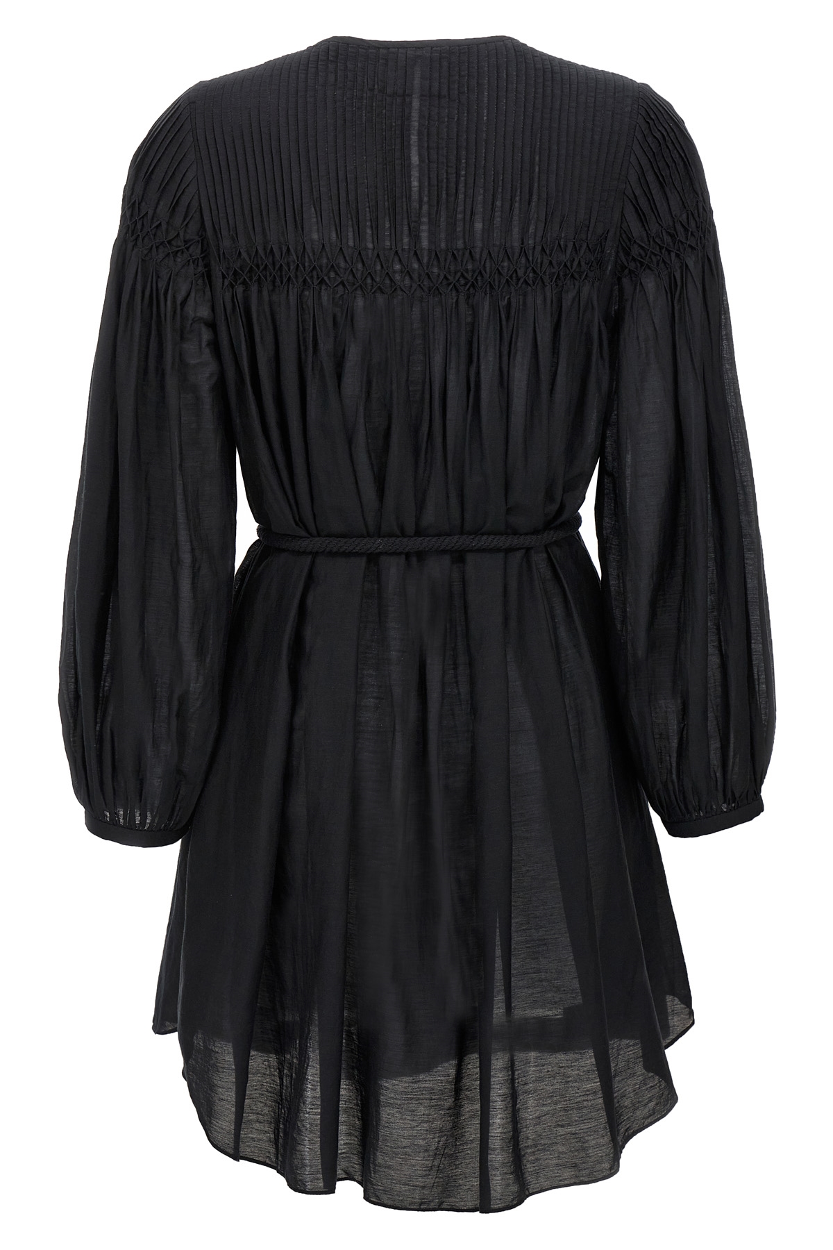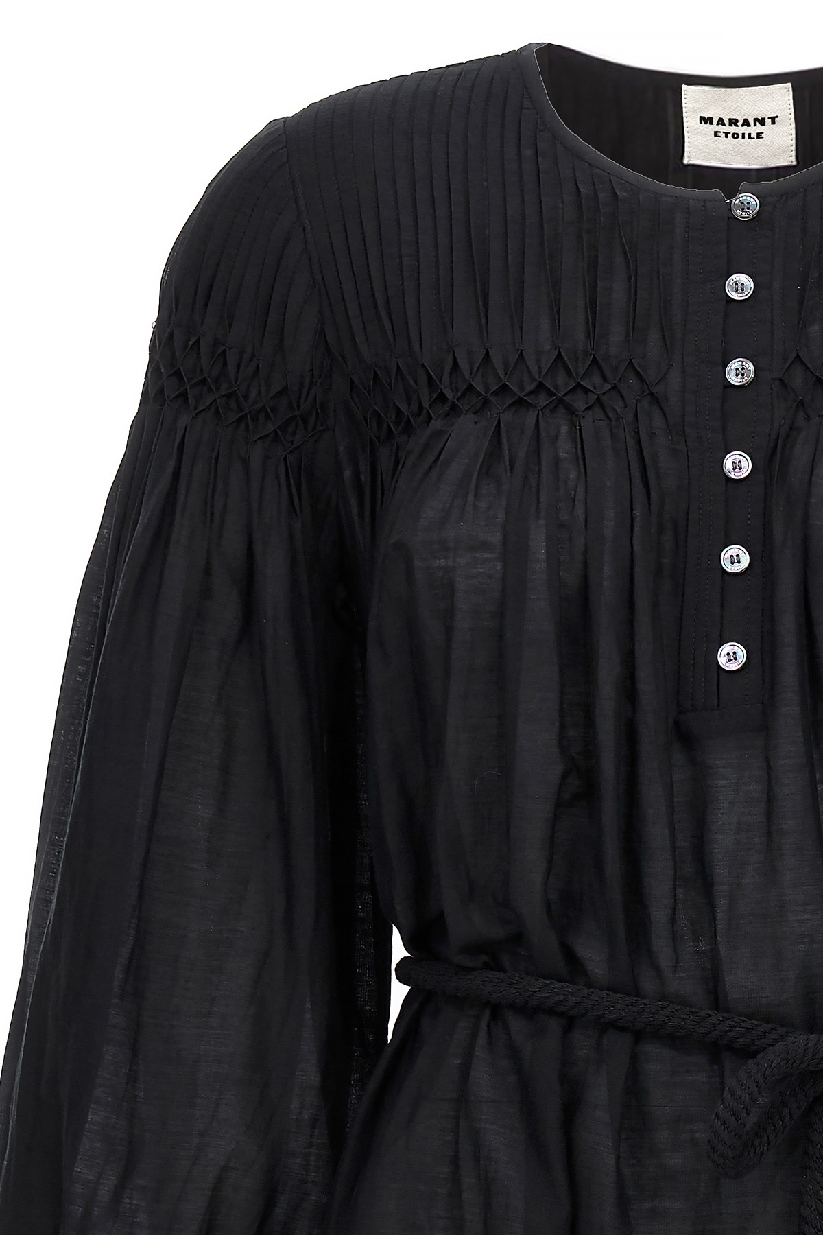 'Adeliani' cotton blend dress with front button closure, long sleeves, pleated detail at the top, rope at the waist.