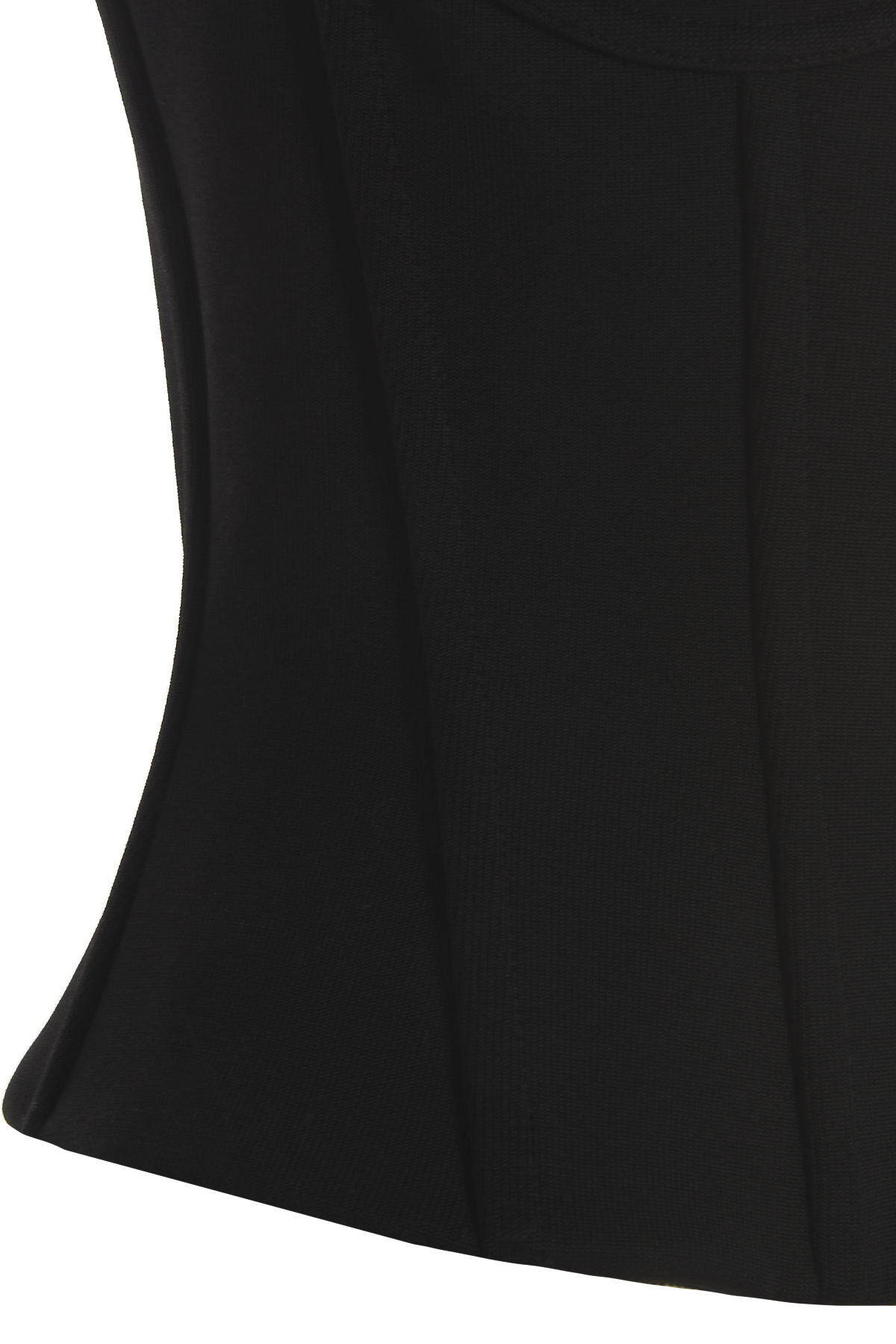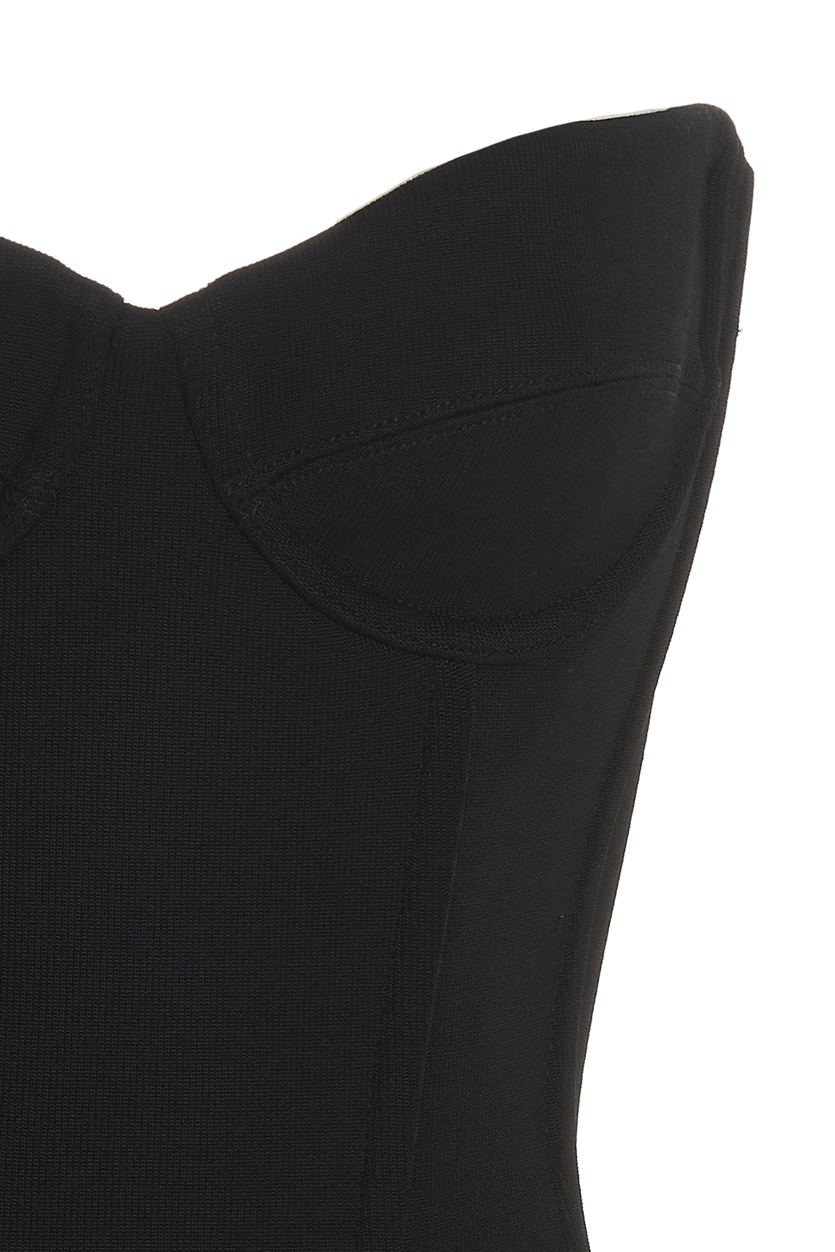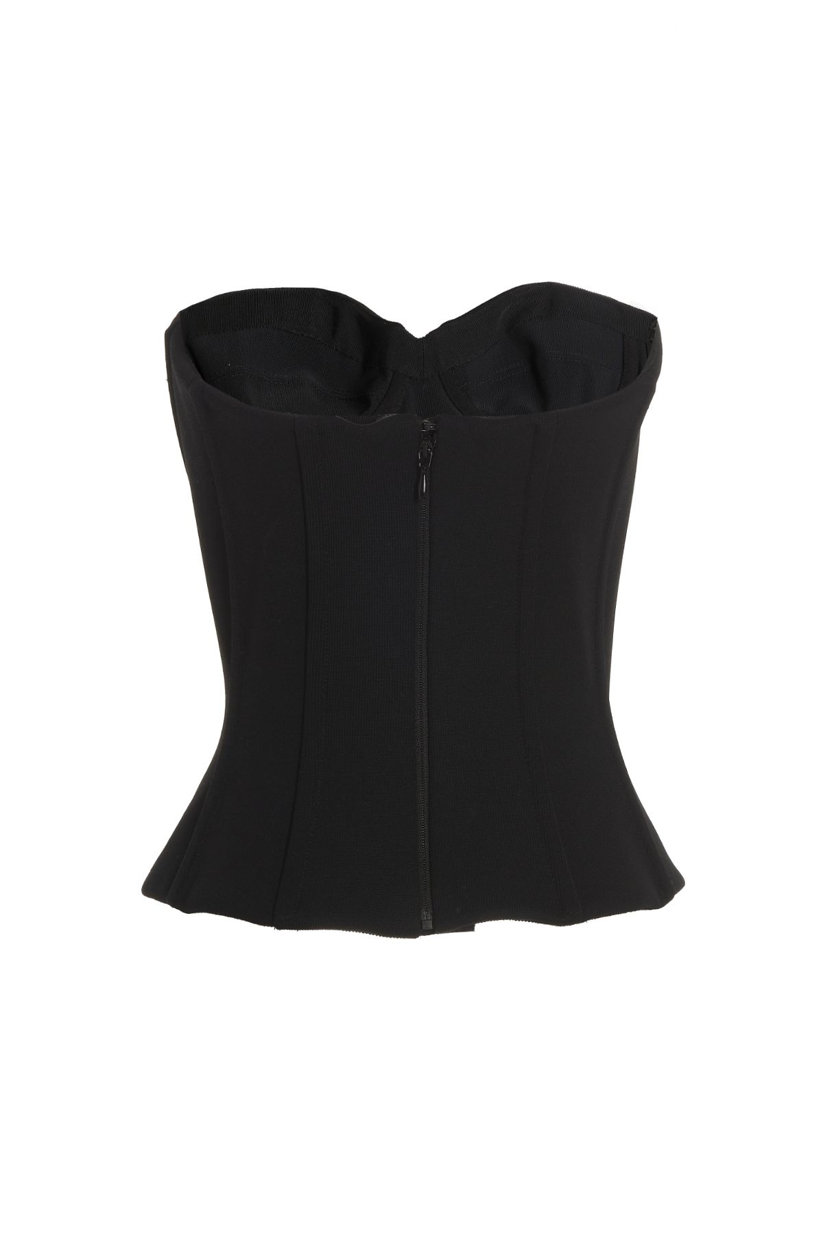 Elasticized jersey bustier top with off-the-shoulder cropped style with supporting splints and a back zip closure.