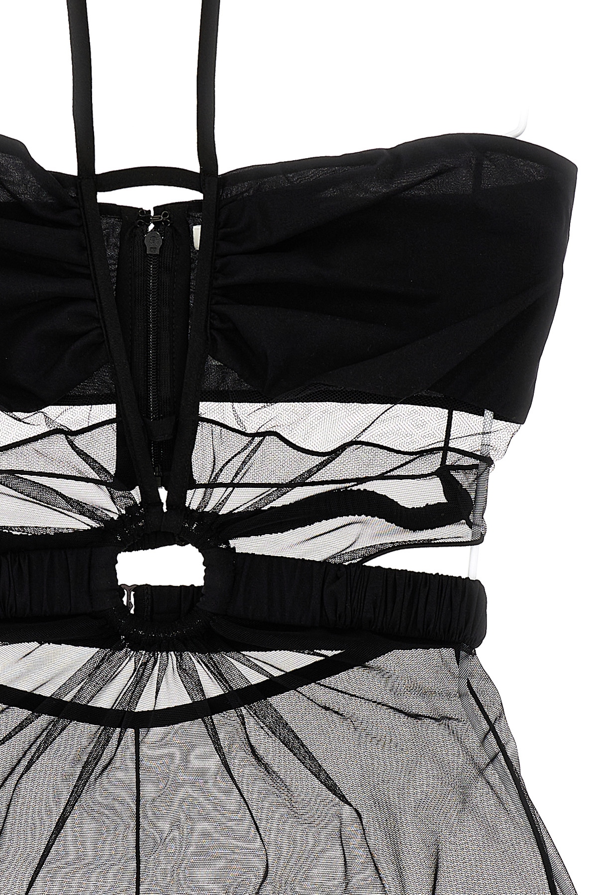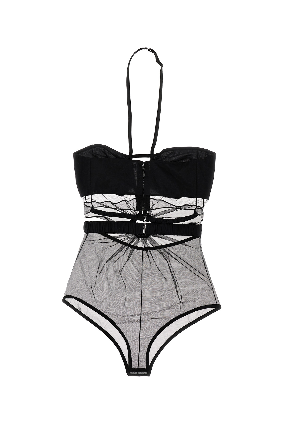 Ring' mesh fabric bodysuit with cut outs, bare back, deep V-neck, adjustable shoulders.