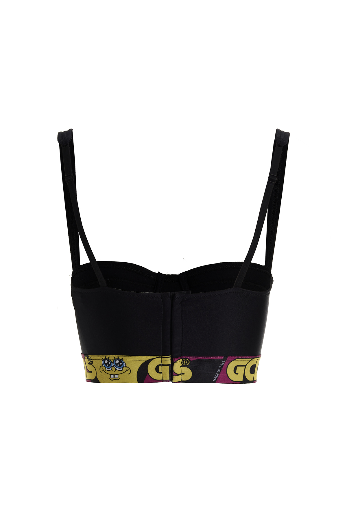 Balcony-style stretch fabric bra with slightly padded cups, adjustable shoulder straps, back hook closure and a 'Spongebob' print elastic.
