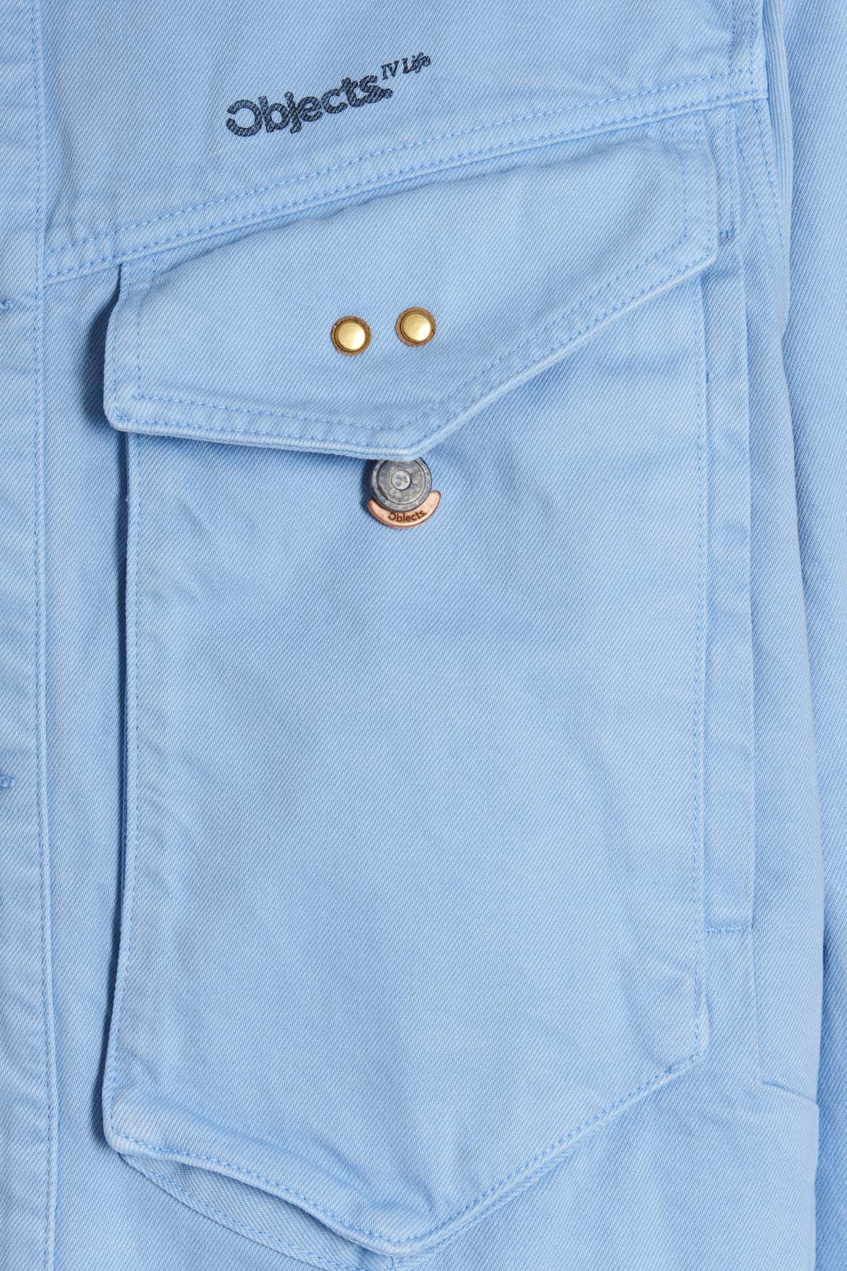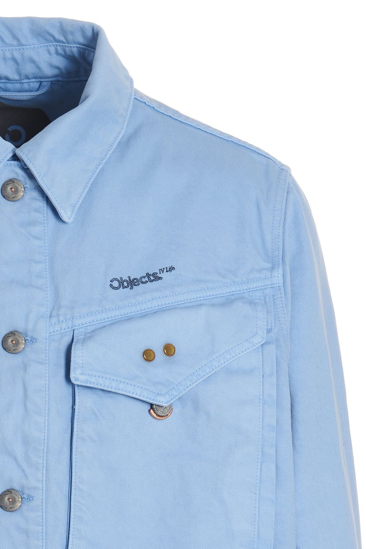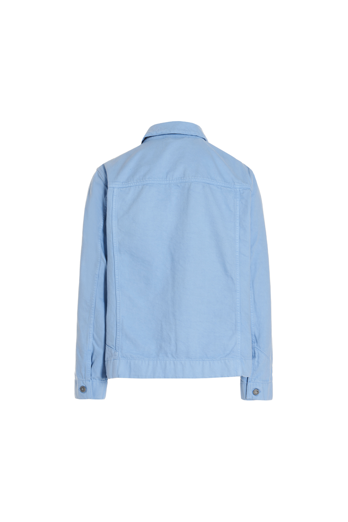 Cotton denim jacket with button closure, maxi hook-and-eye pockets and long cuffed sleeves.