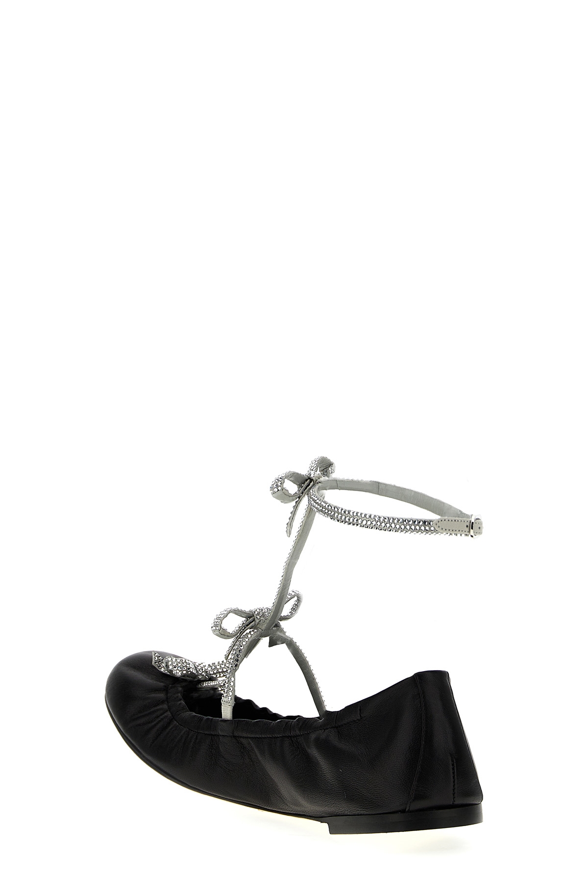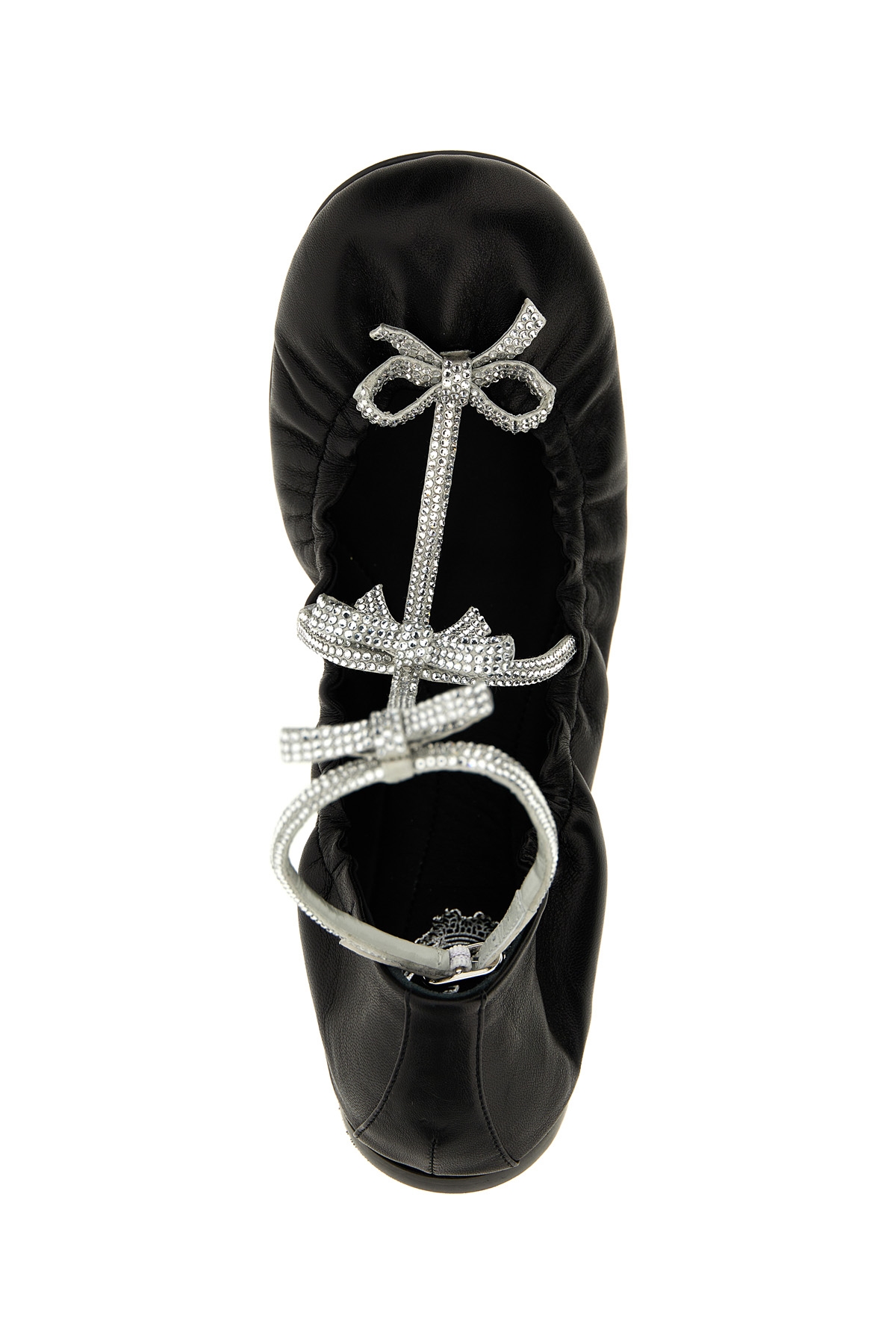 Caterina' leather ballet flats with bow detail, rhinestone applique, ankle strap, leather sole.