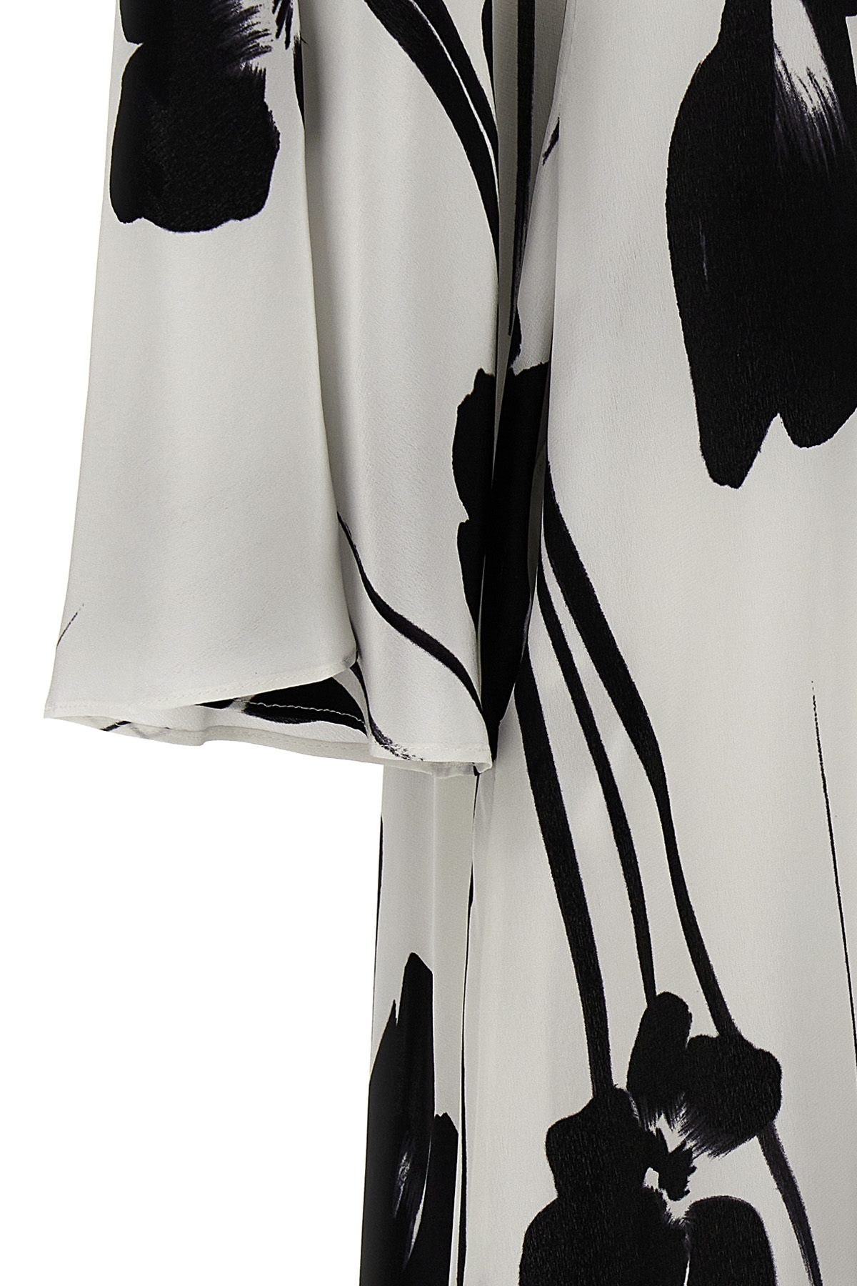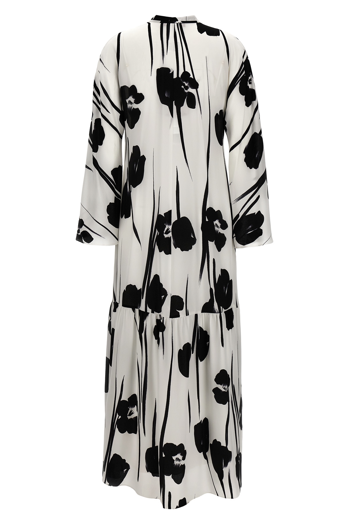 'Eles' floral print silk dress with drawstring neckline, long sleeves, flounce hem, matching removable petticoat.