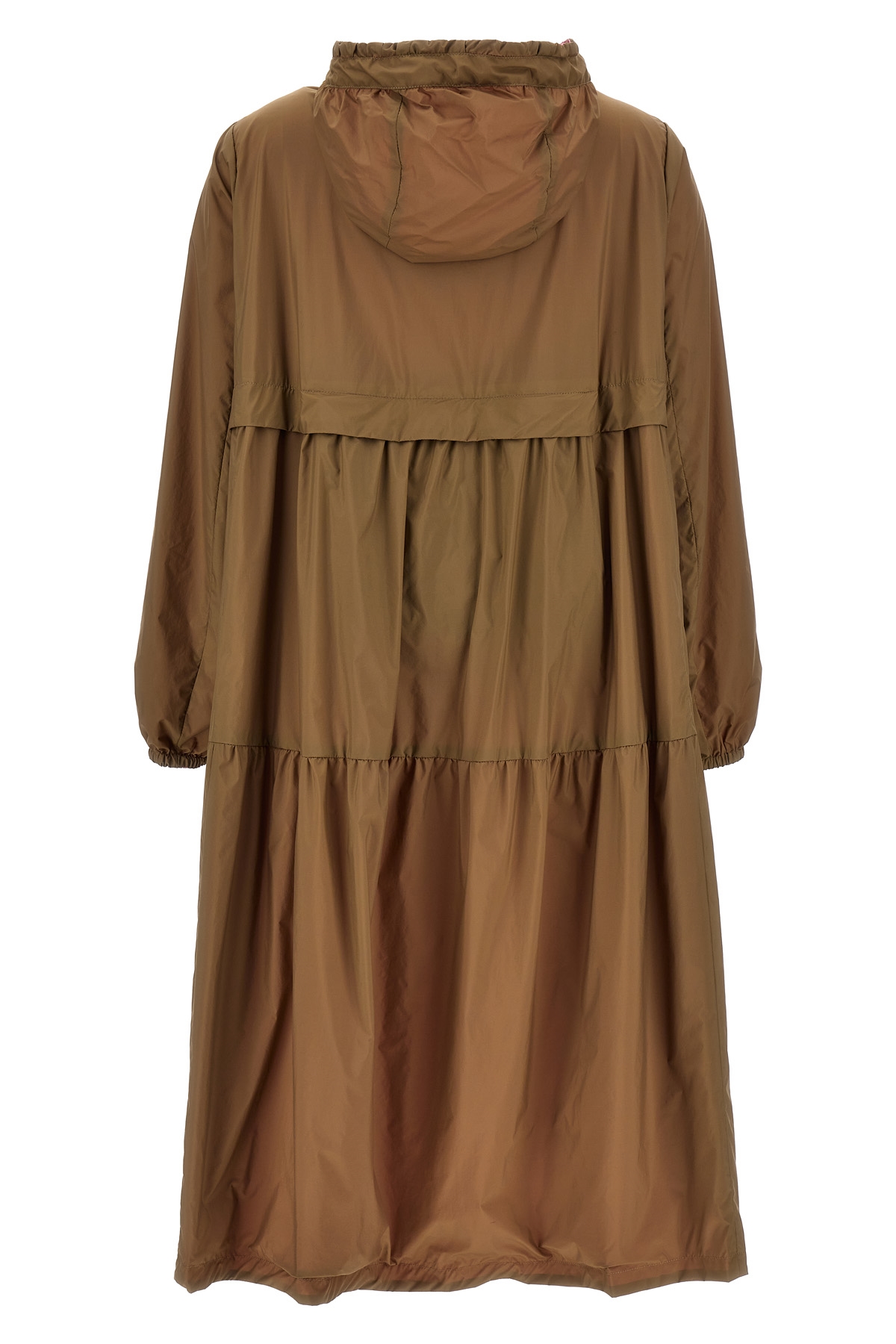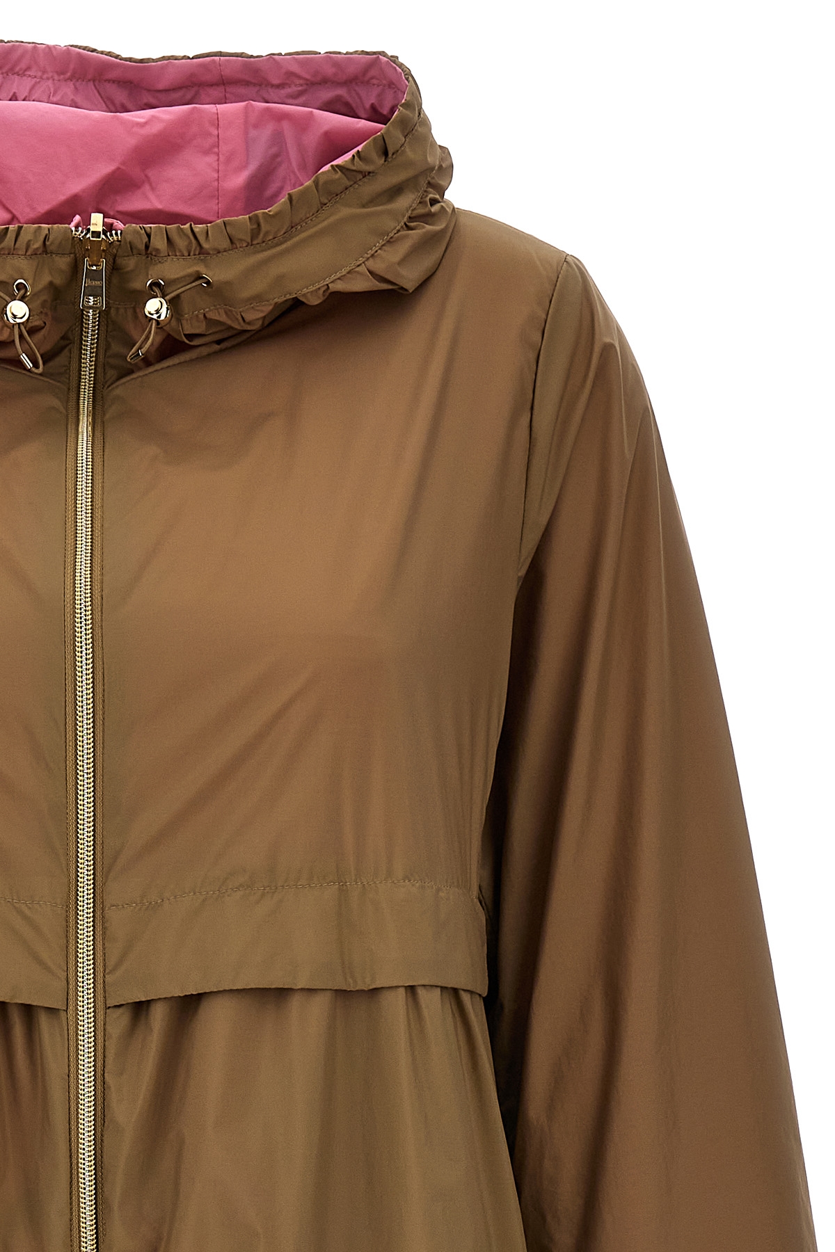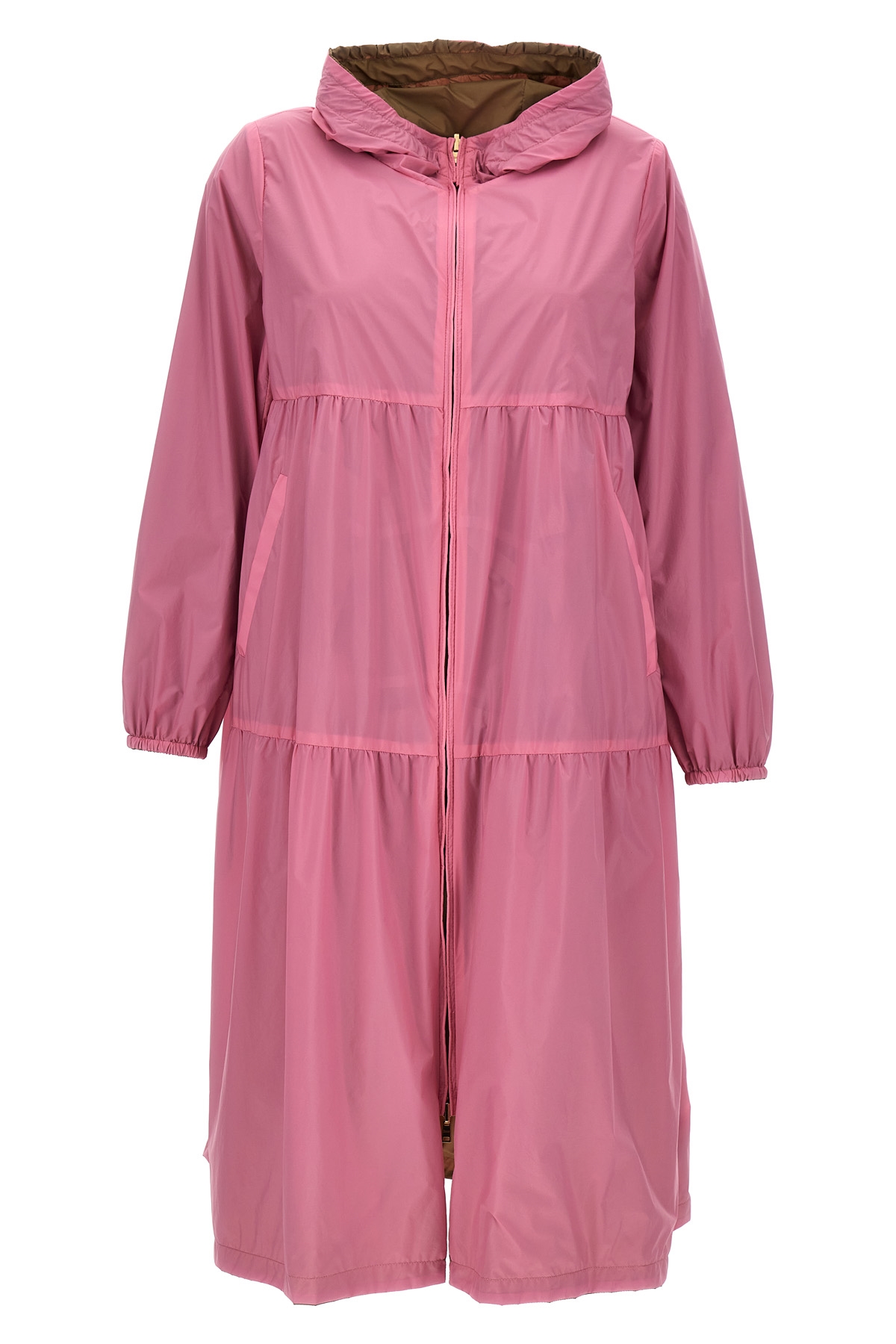 Reversible long nylon jacket with hood, zip closure, pockets, long sleeves with elastic cuffs.