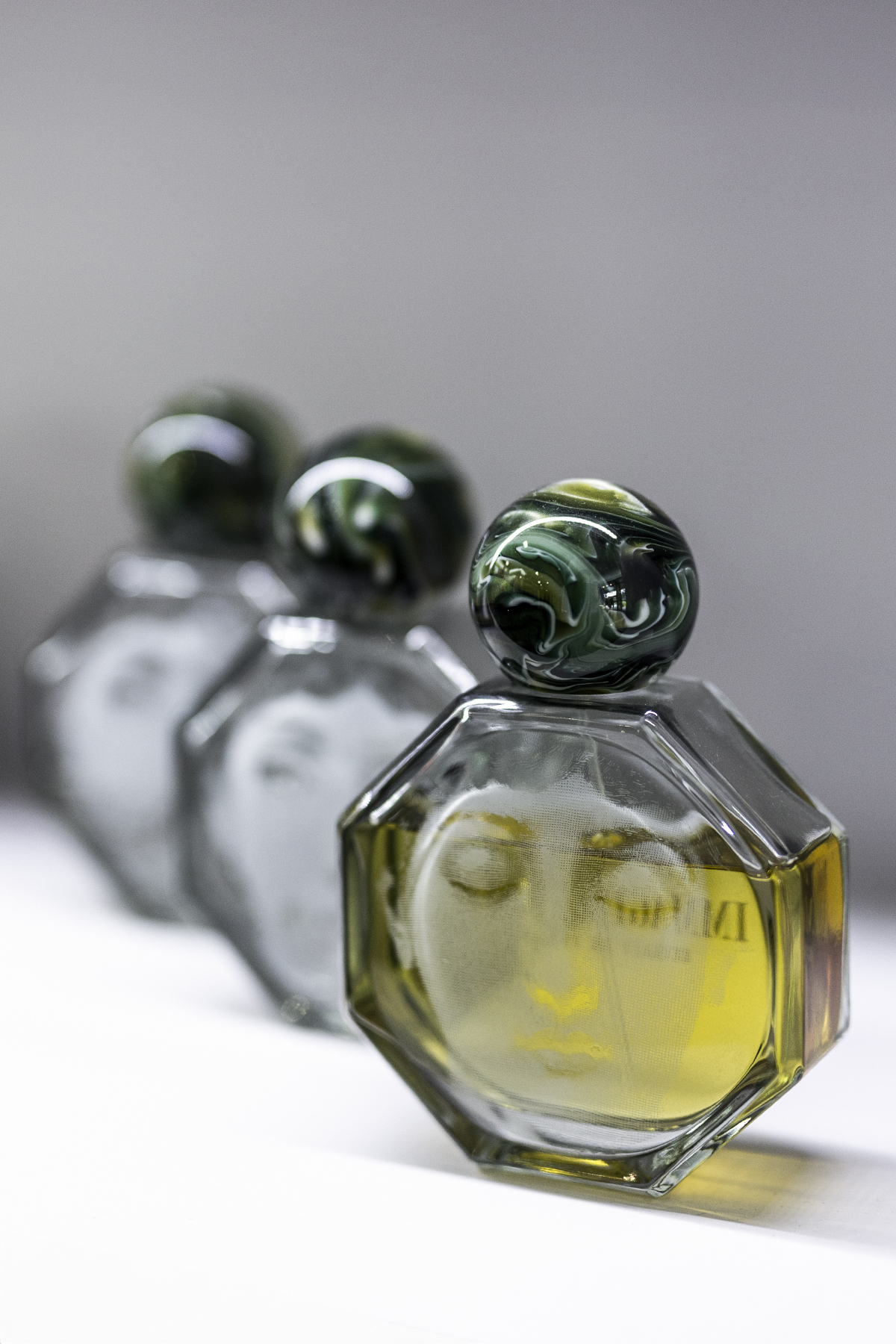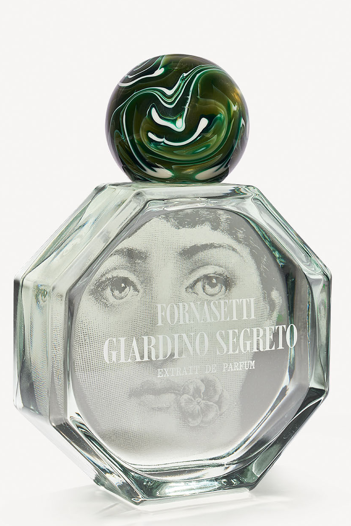 The unusual octagonal shape of the bottle makes the Fornasetti extrait de parfum a unique object, enriched by the cap with the green Malachite decoration that adds an elegant and refined touch. The box plays with the octagonal shape, evoking the design of the bottle.