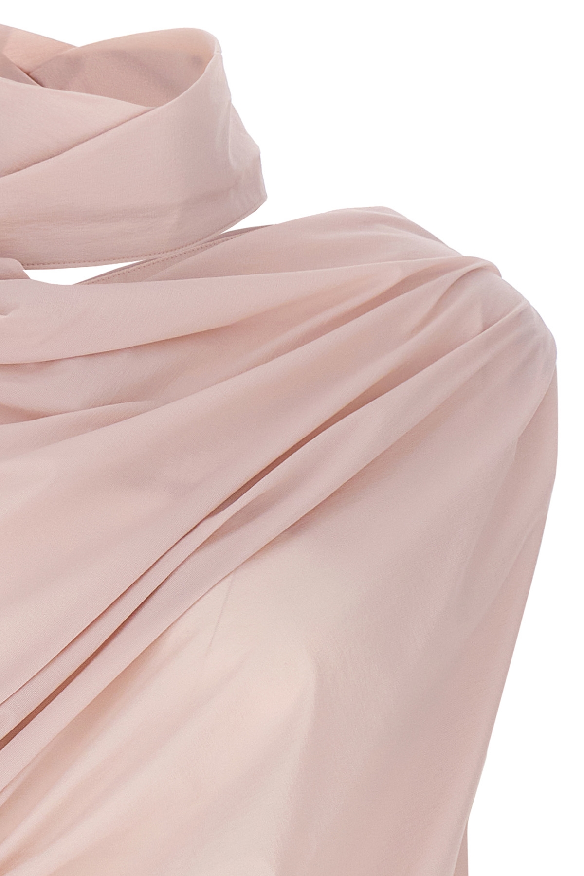 'Eye of the bean' asymmetrical top in stretch tech fabric with side curled detail and draped neckline.