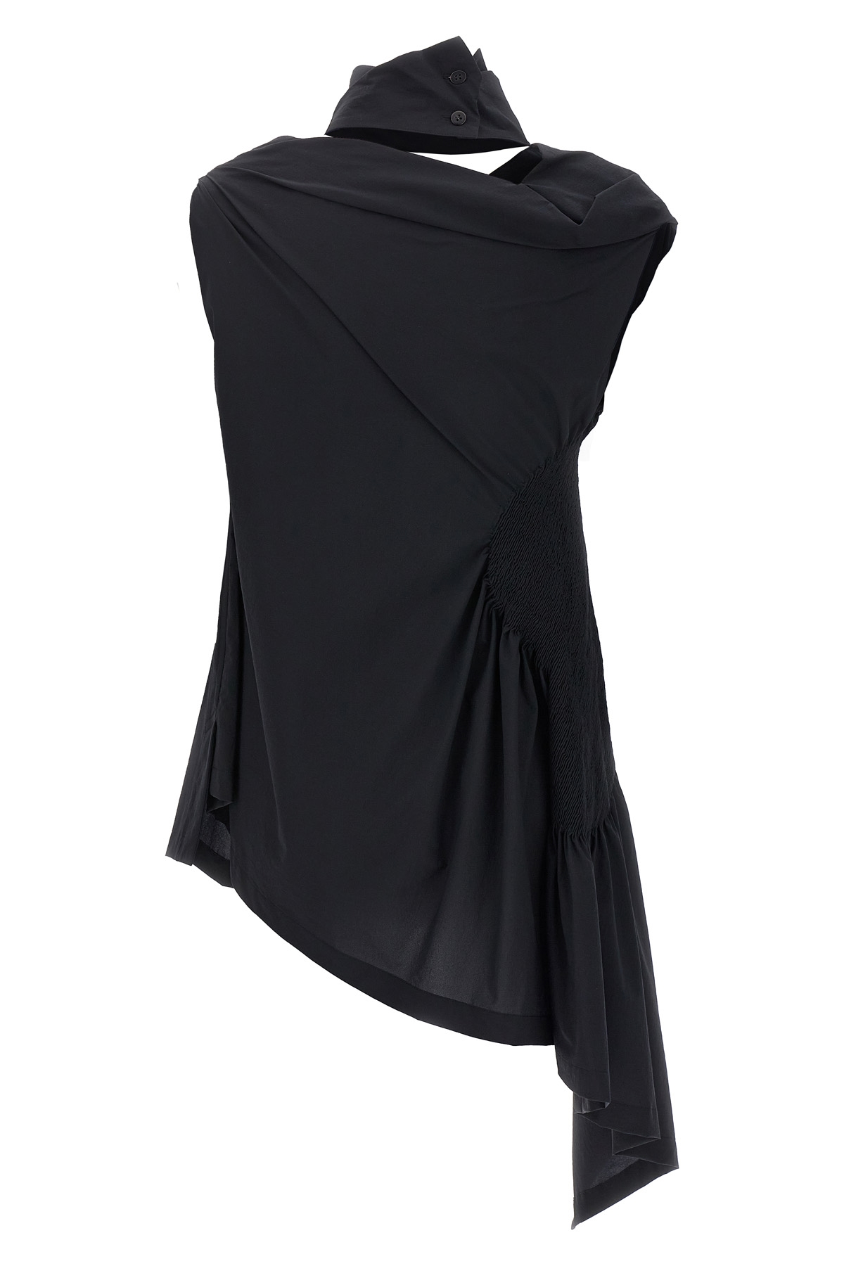'Eye of the bean' asymmetrical top in stretch tech fabric with side curled detail and draped neckline.