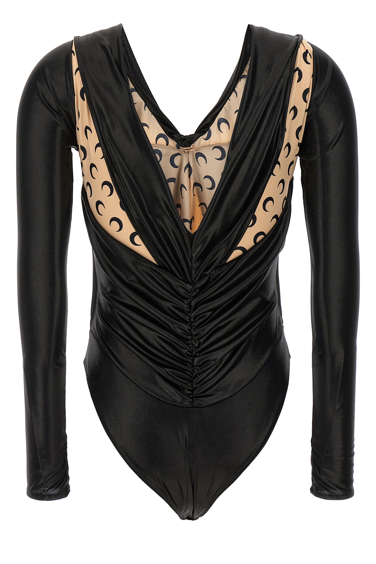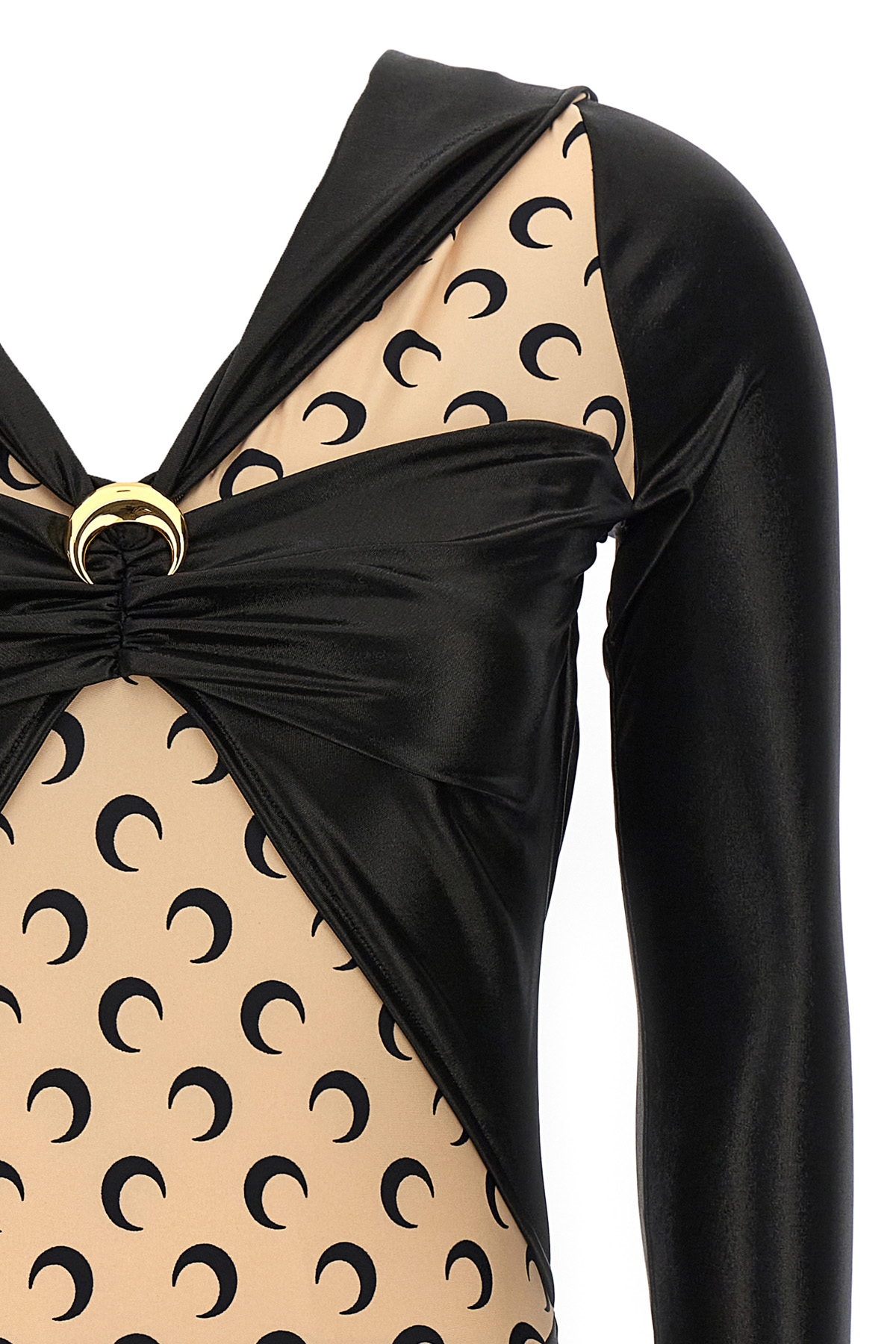 'All over moon' bodysuit in patchwork fabrics with all-over print and coated effect. Long-sleeved model with V-neck and moon-shaped brooch detail.