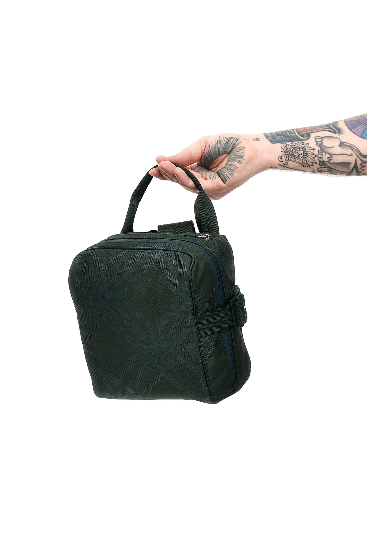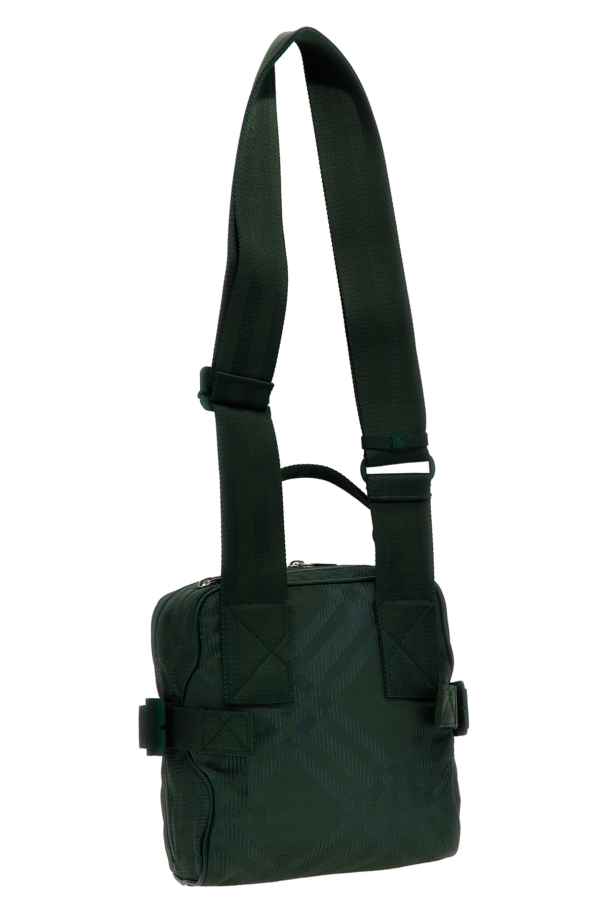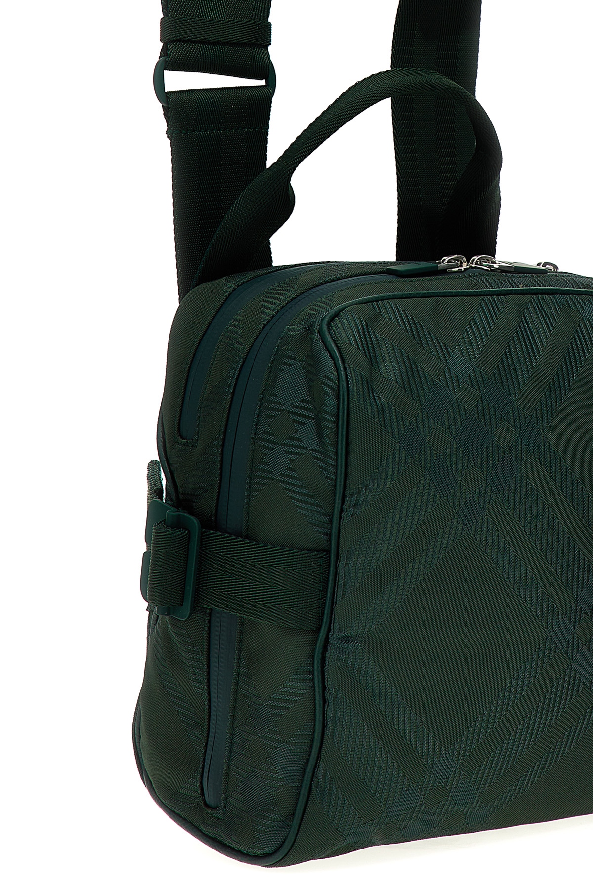 Check fabric shoulder strap, zip closure, adjustable shoulder strap.