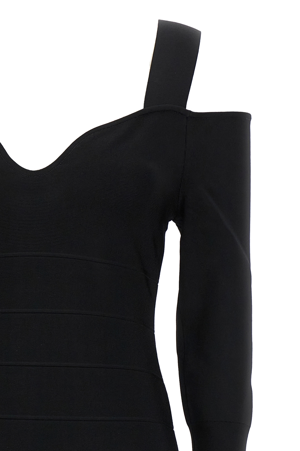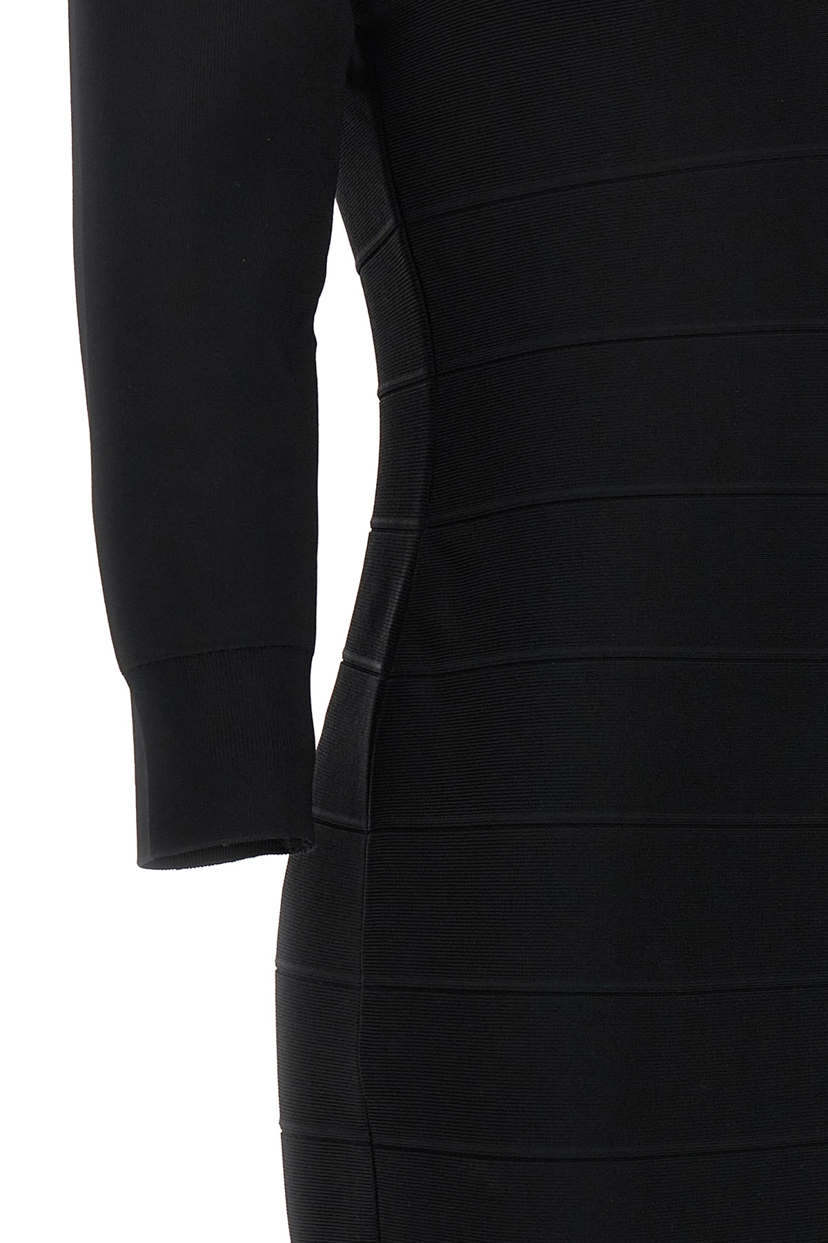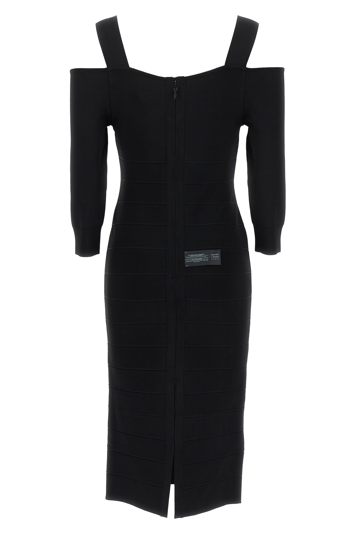 Stretch fabric 'Icon Notched Bateau Midi' dress, wide straps, long sleeve, back zipper closure.