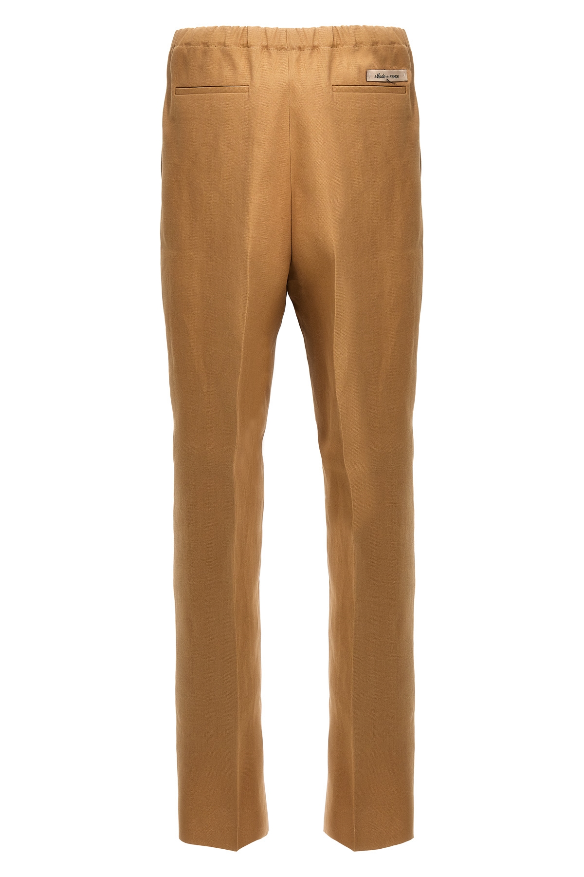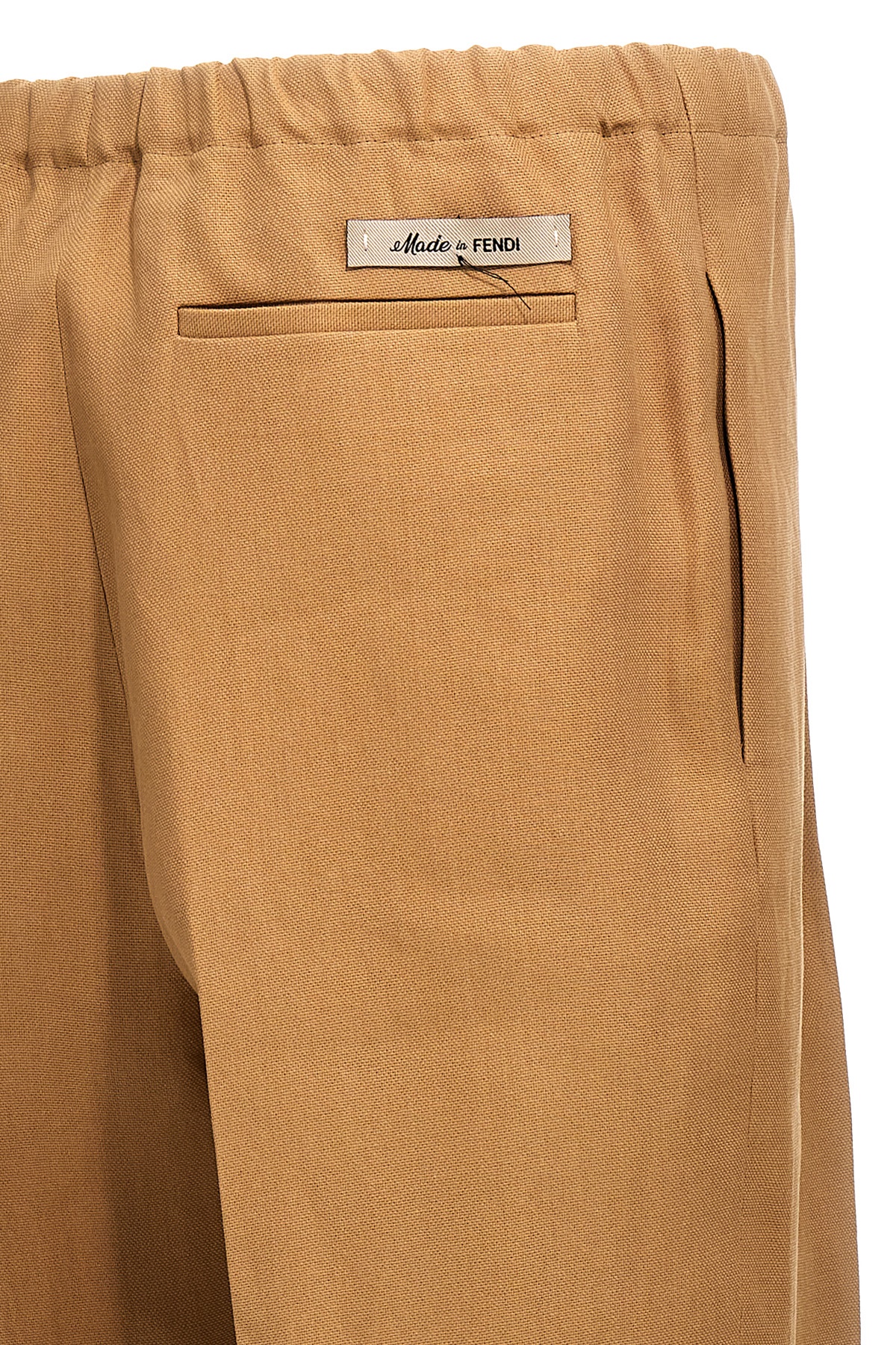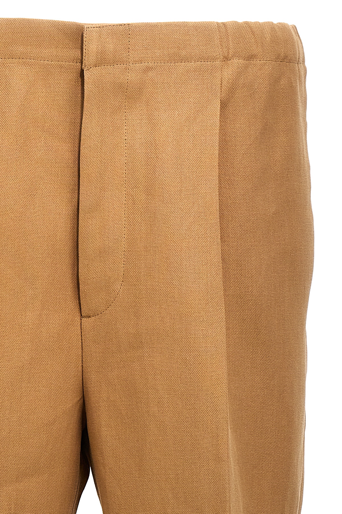 Paper canvas trousers, elastic waistband, hook and button zip closure, ironed pleat and pleat, pockets.