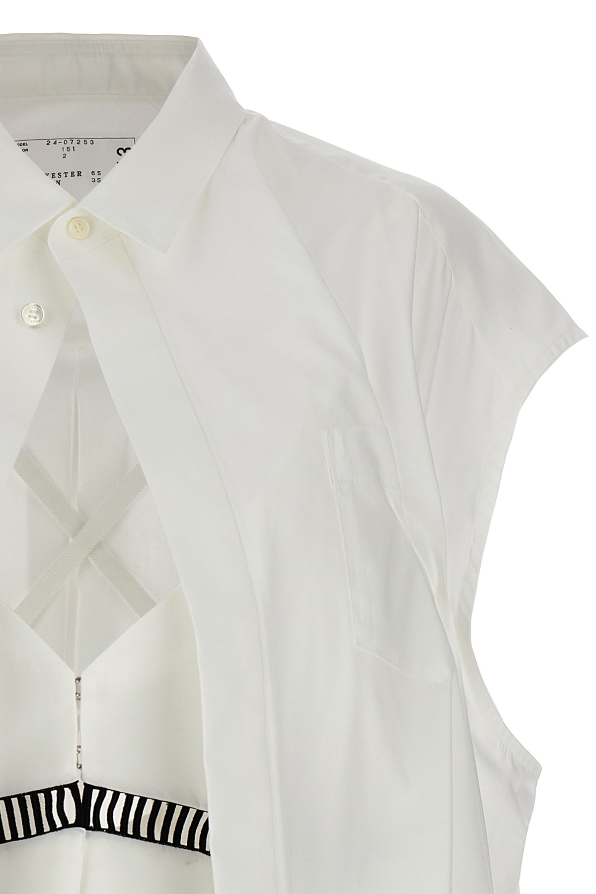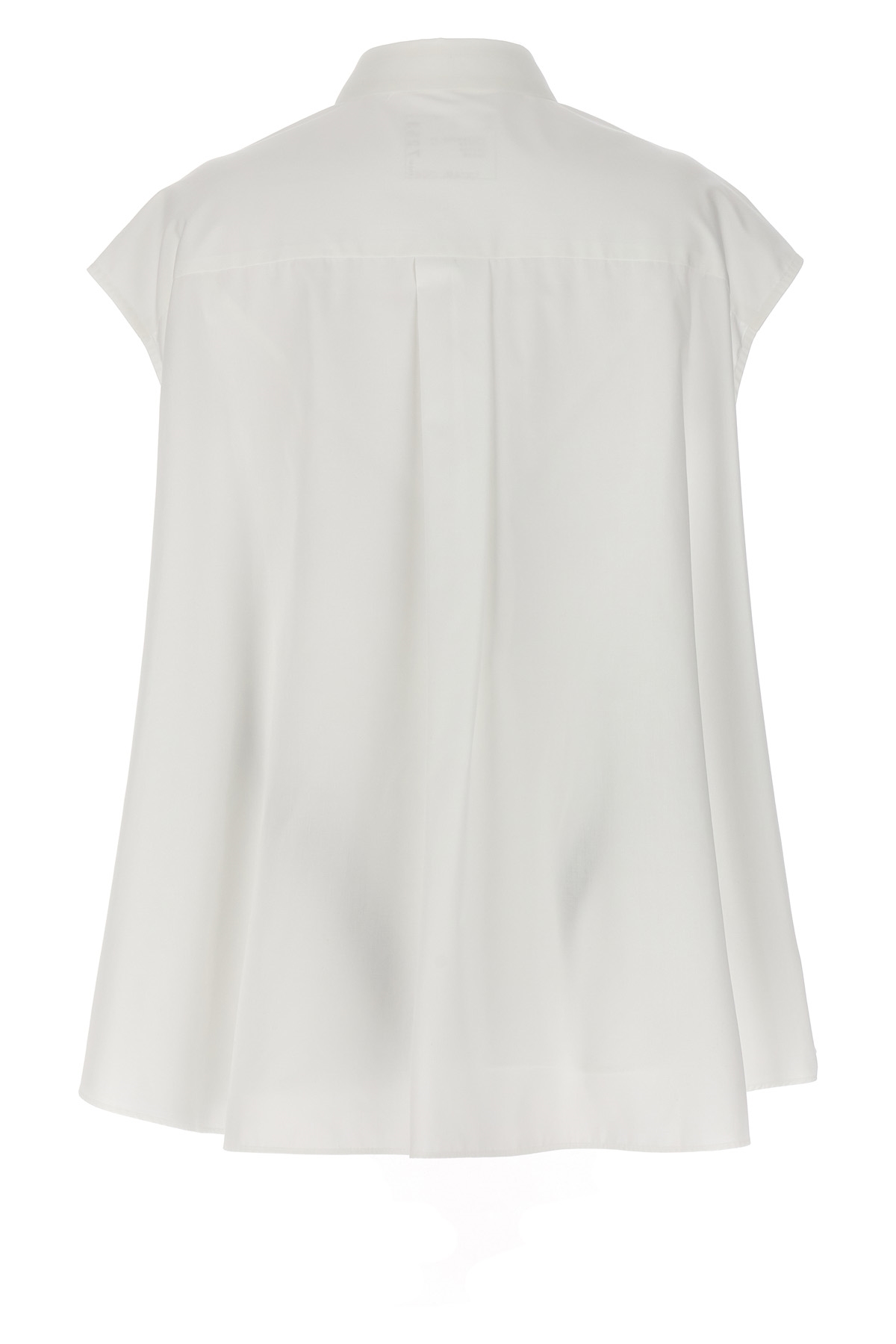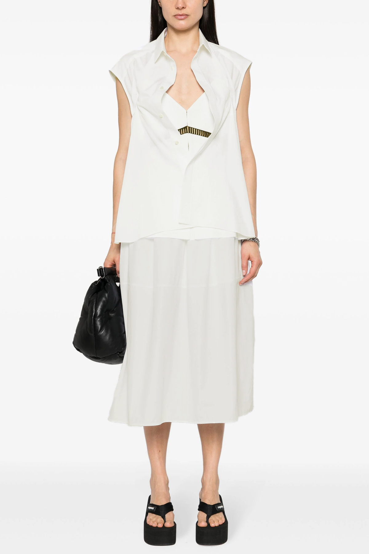 Shirt with contrast embroidery, front hook closure, overlapping fabric detail, button closure, sleeveless.