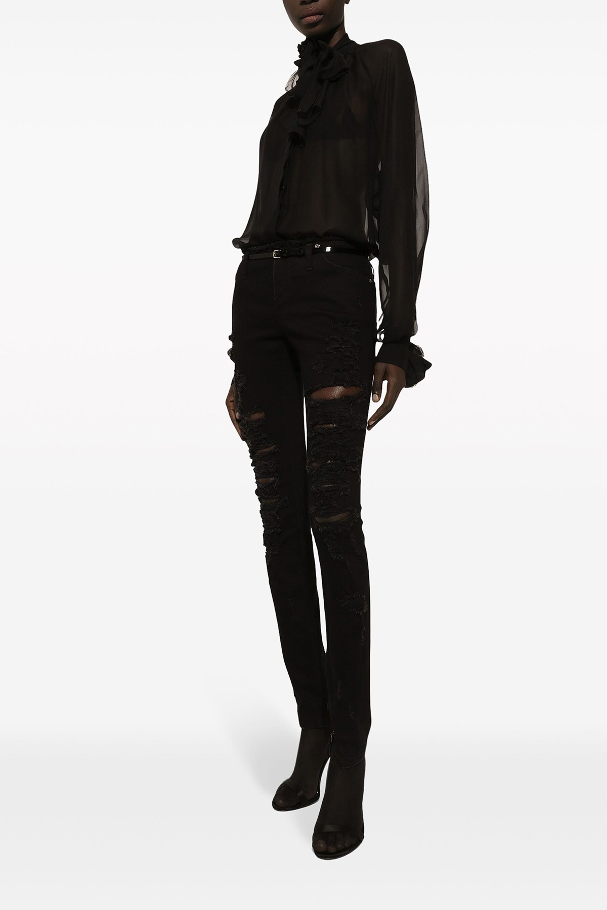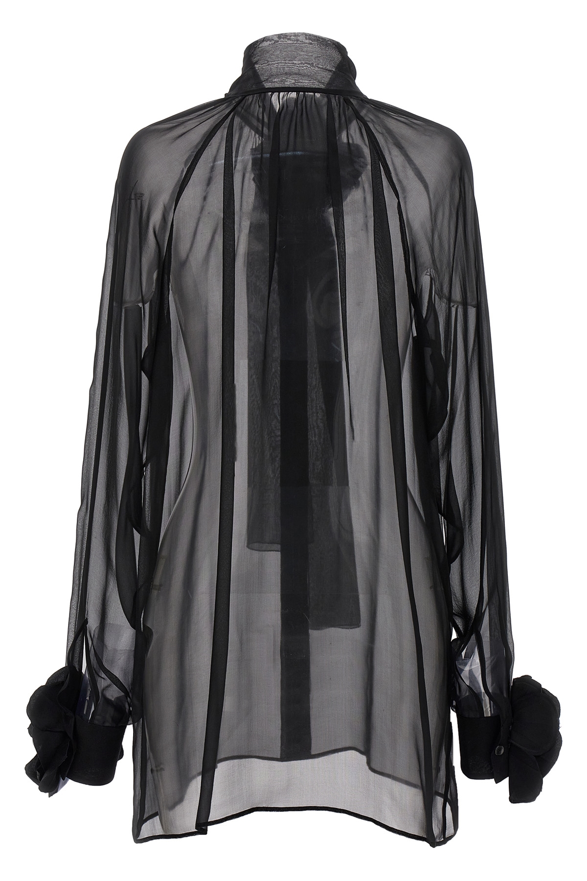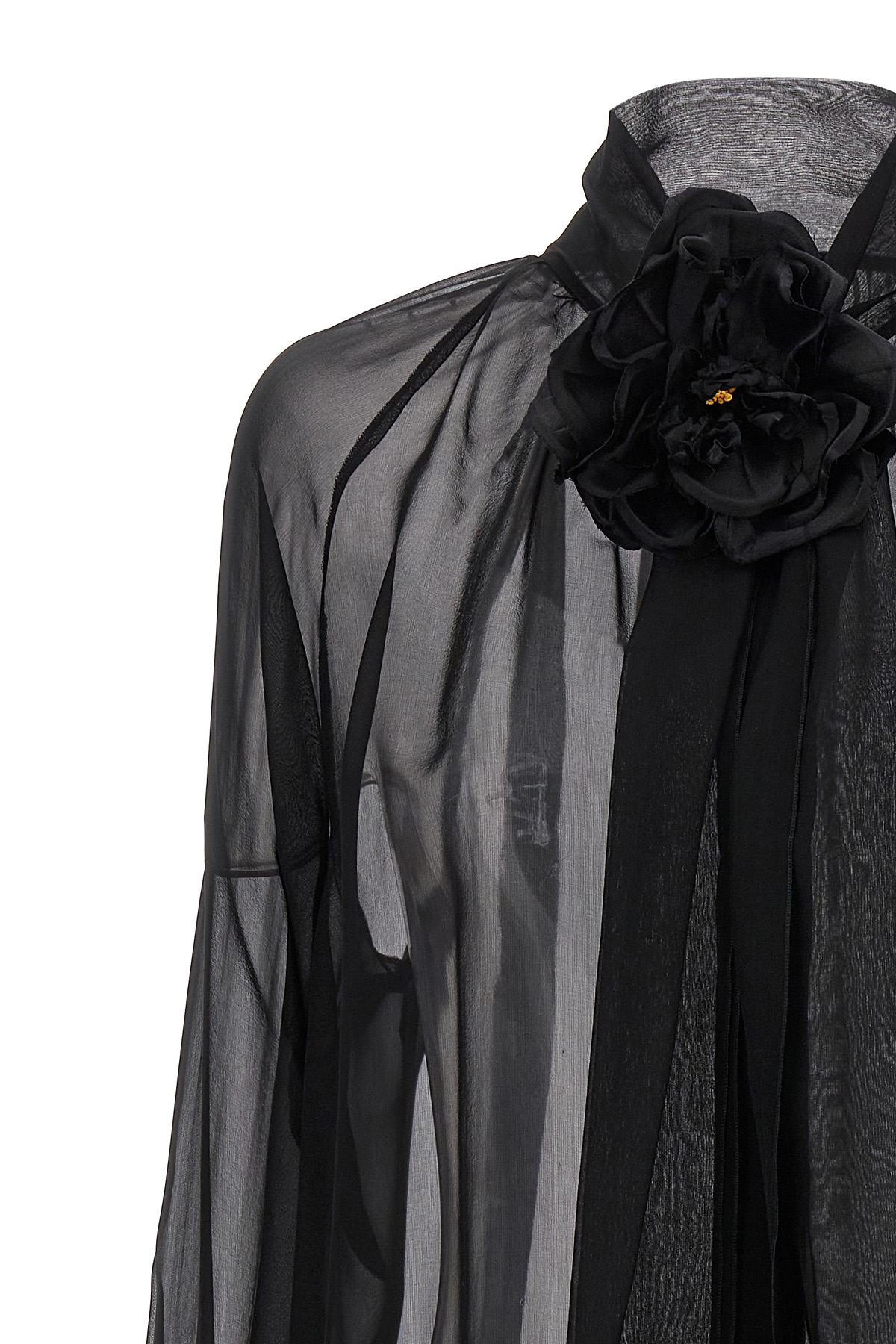 Silk chiffon shirt with rose applique on the neck and cuffs, tie sash, button closure, long cuffed sleeves.