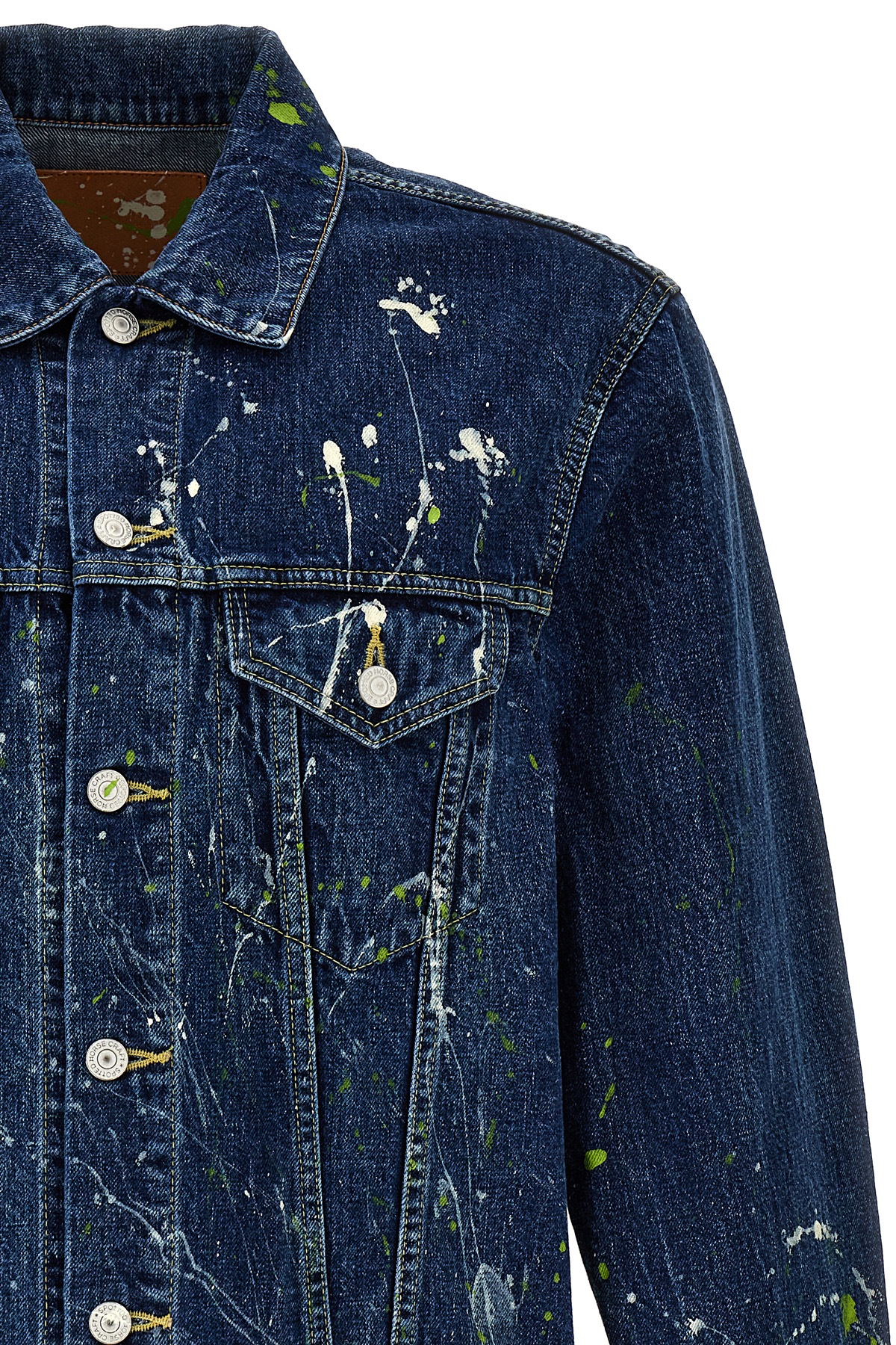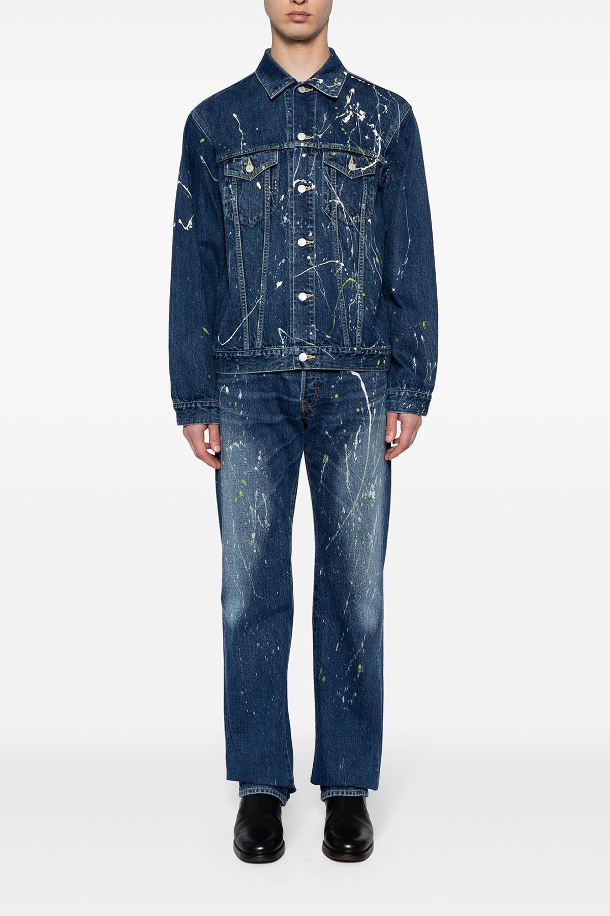 Cotton denim jacket with all-over paint stains, button closure, front pockets, long cuffed sleeves.