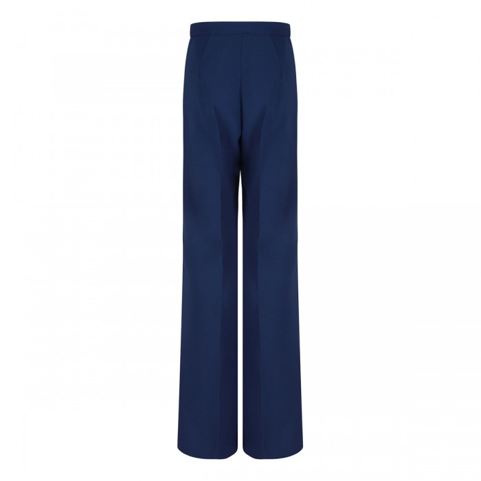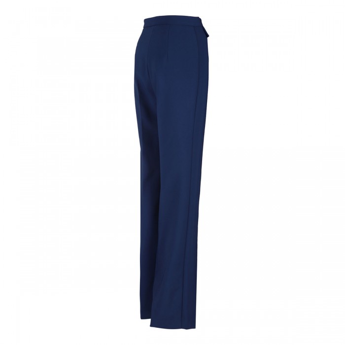 Oltremare blue stretch crepe pants from Elisabetta Franchi featuring flaps on the front, golden metal logo plaque on the waistband, slim fit, front and back darts, concealed zip fastening on the side.